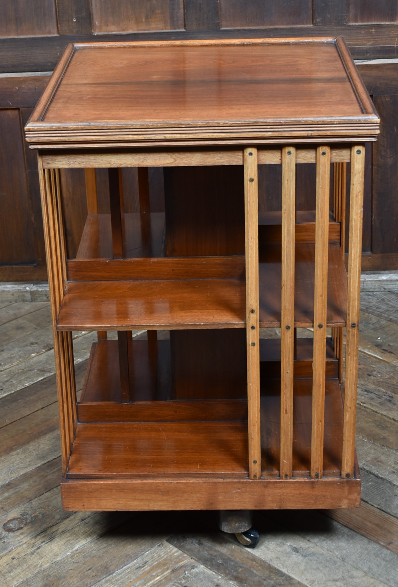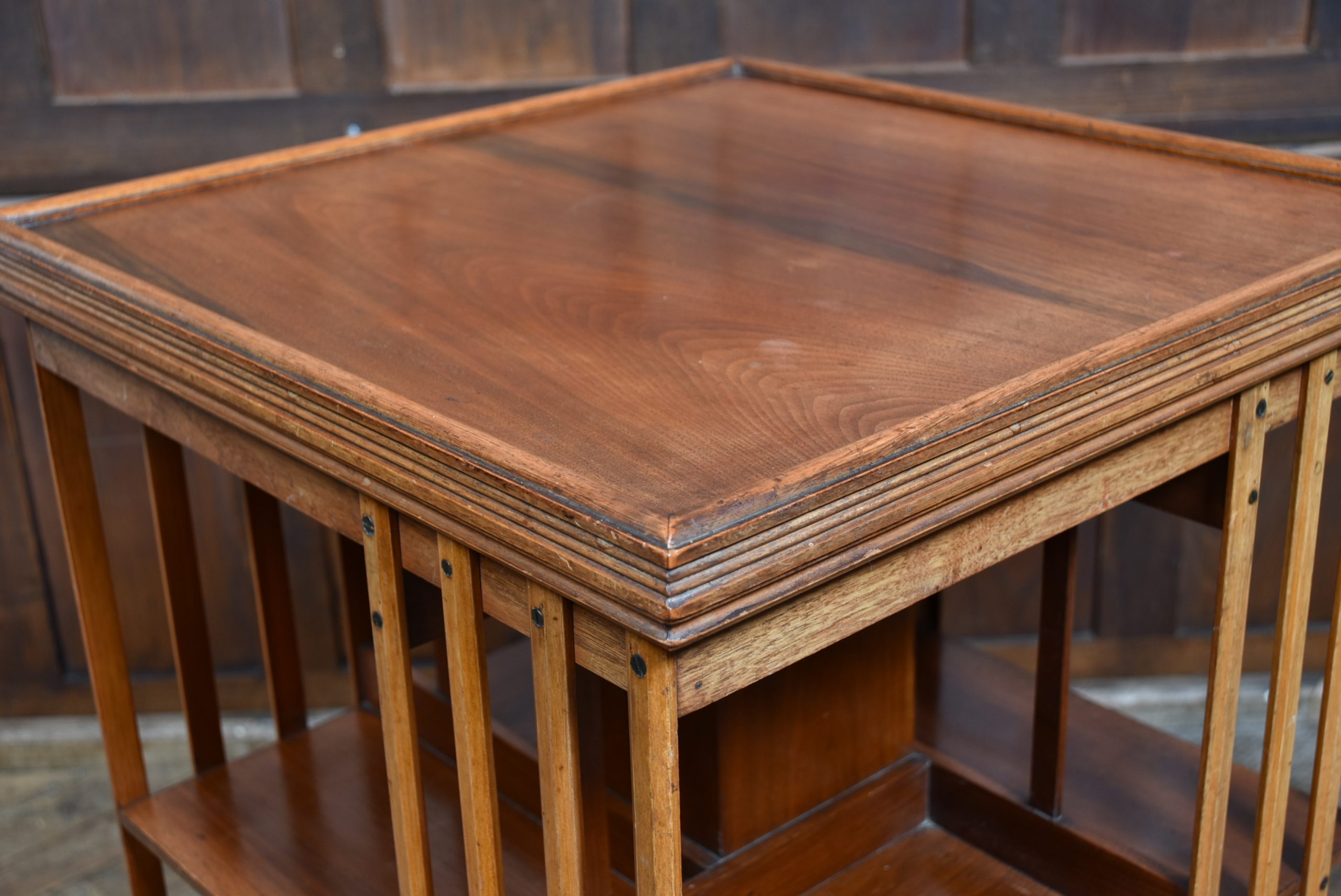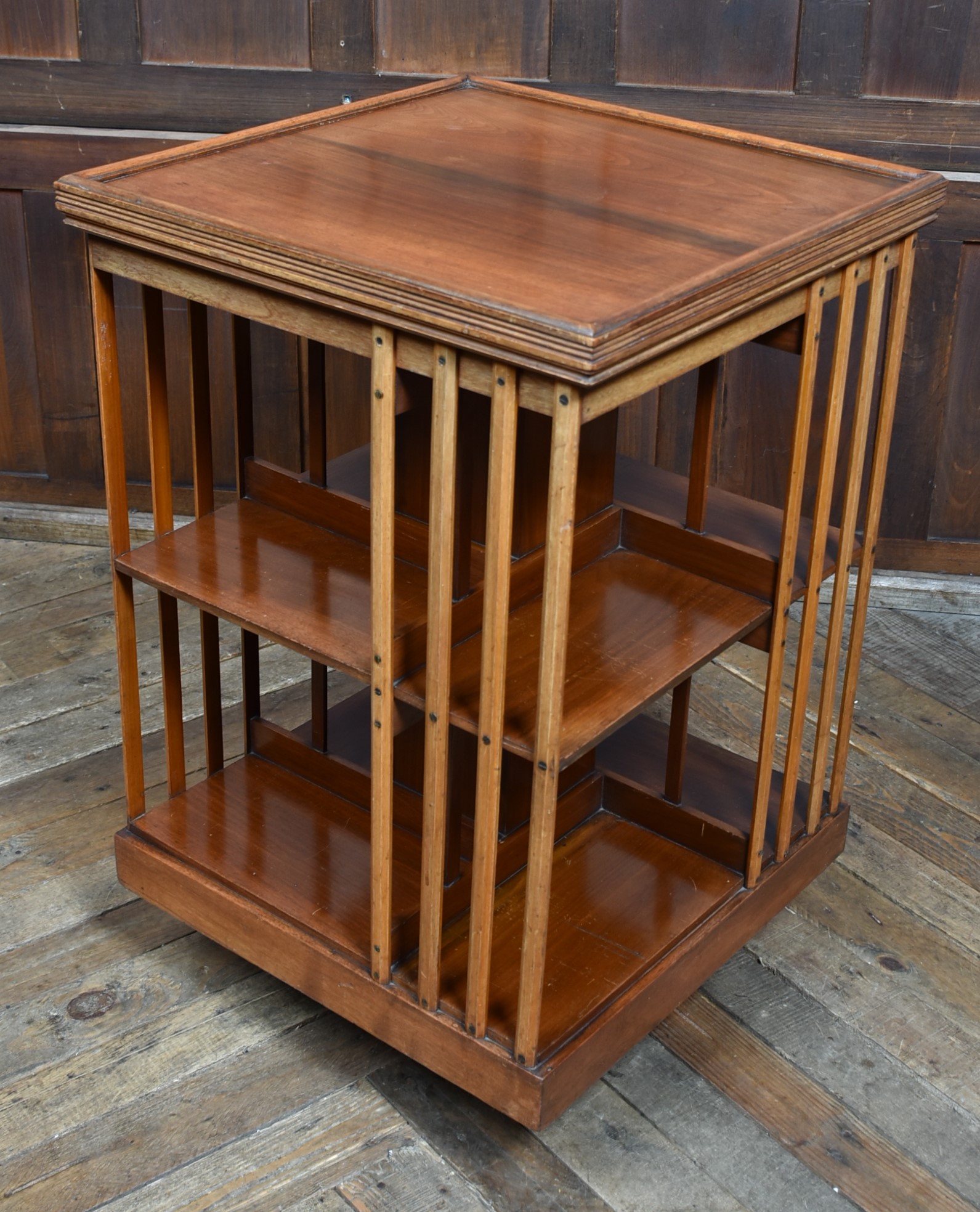 Super Edwardian walnut revolving bookcase in wonderful antique condition. The two-tier book space is united by four splats and sits on a revolving cruciform base with casters. The sturdy construction and smooth revolving action make it a practical and attractive addition to any space. It offers generous and convenient storage and display for many books, creating a small library in any room. There are many places to use these bookcases and they are not only very practical but also very attractive once they are filled with books.