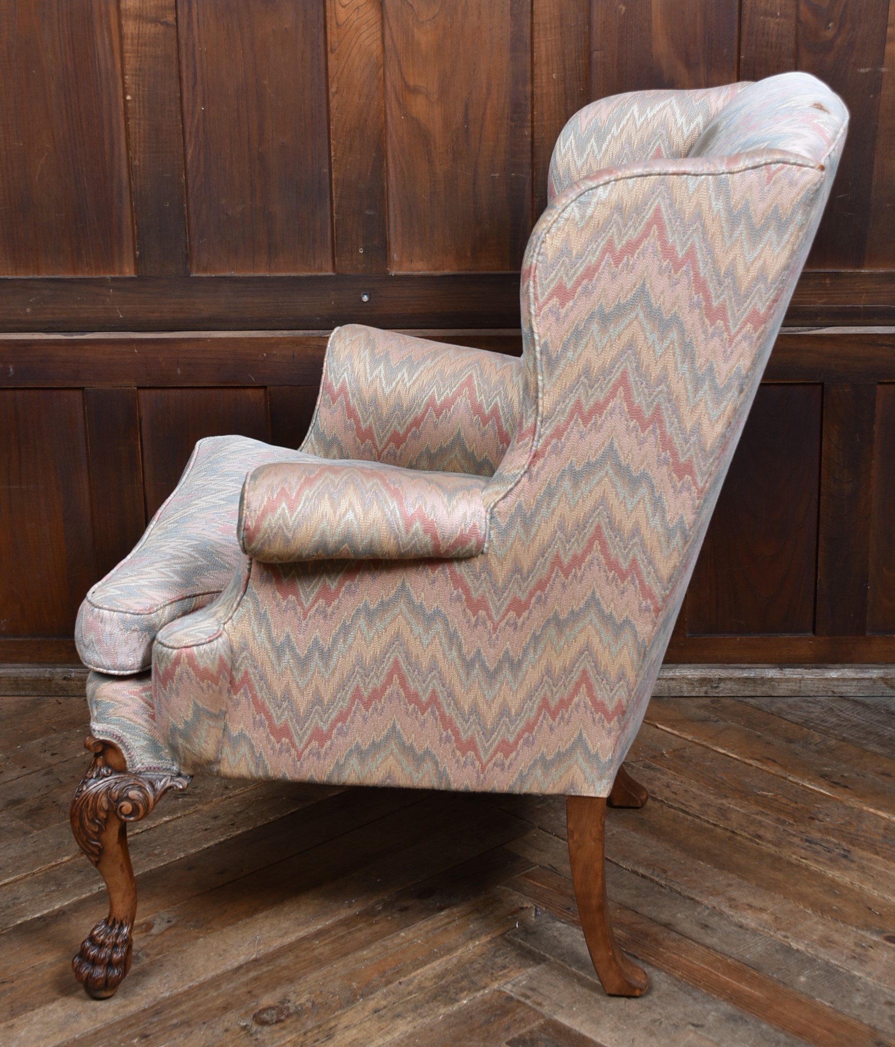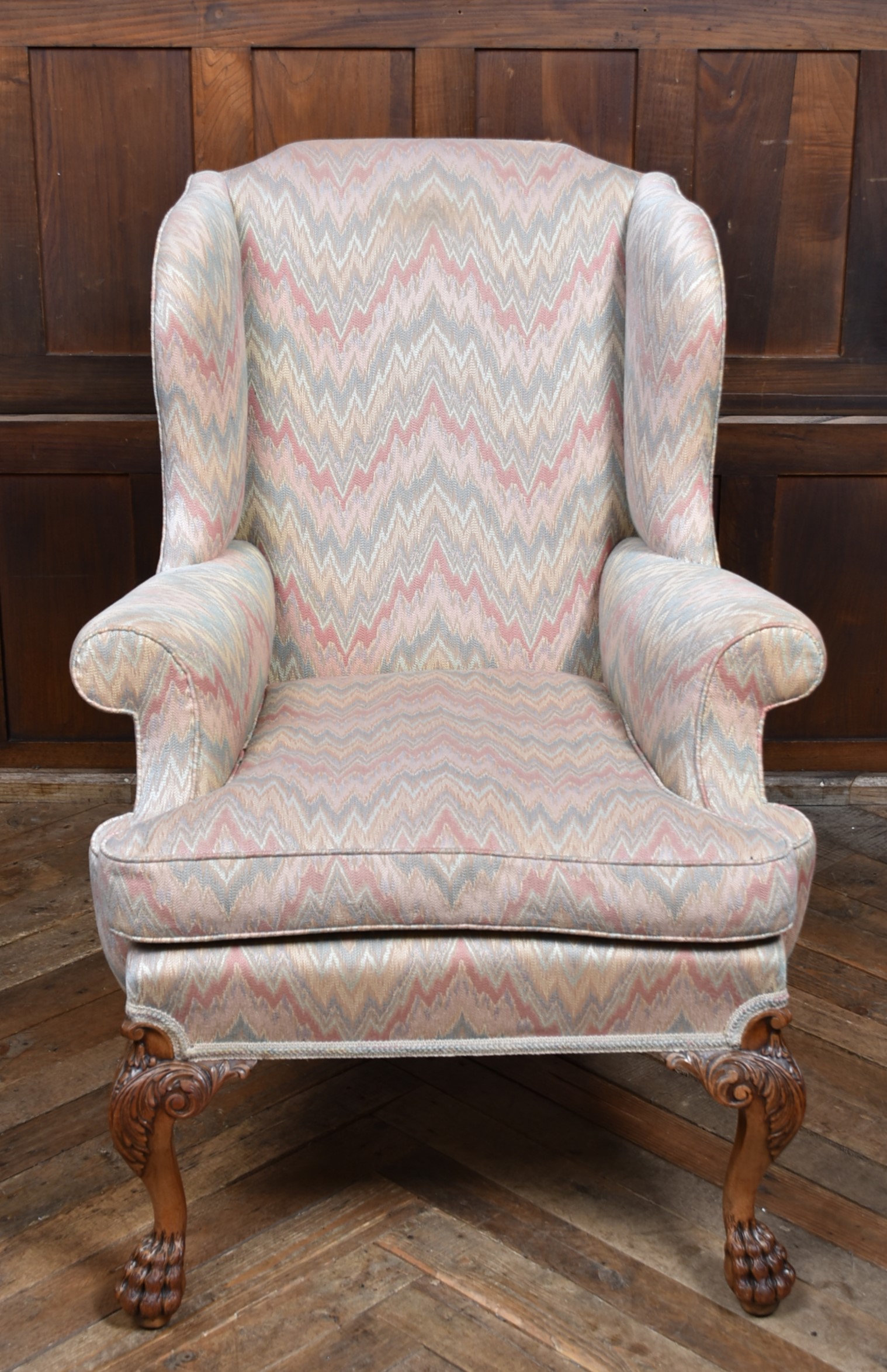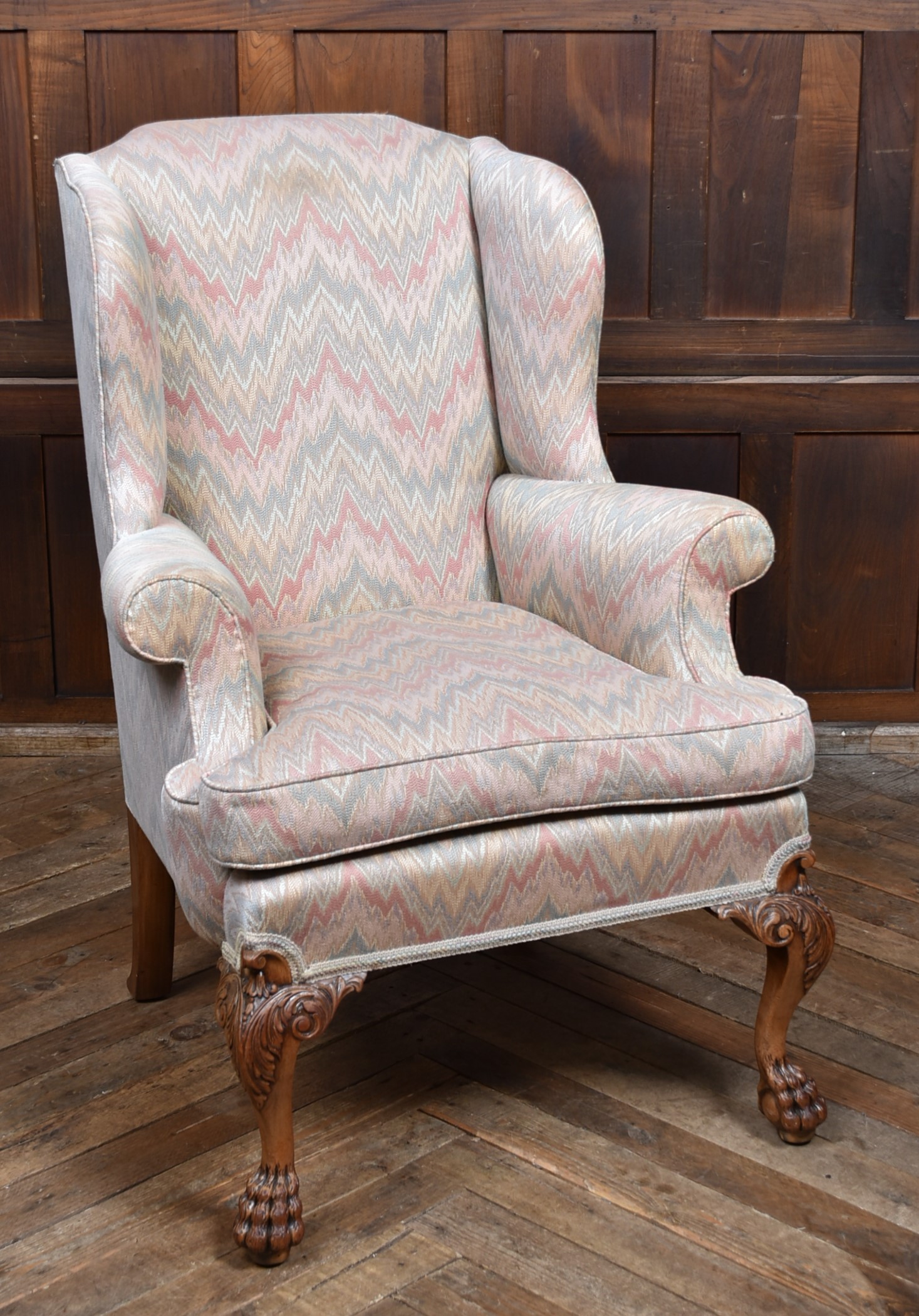A charming Edwardian wing-back armchair upholstered in a soft, pastel zig-zag fabric. The chair features rolled arms, a high winged back, and a generously cushioned seat, offering excellent comfort and support. The frame is raised on finely carved cabriole legs terminating in bold claw-and-ball feet, demonstrating the craftsmanship typical of the period. The upholstery is neatly finished and sits well against the warm tones of the timber. Elegant, comfortable, and full of character, this is a lovely Edwardian armchair that would sit beautifully in a reading nook, bedroom corner, or living space.