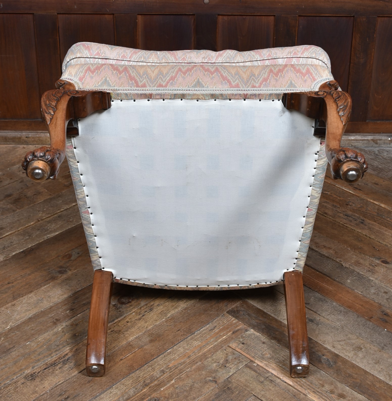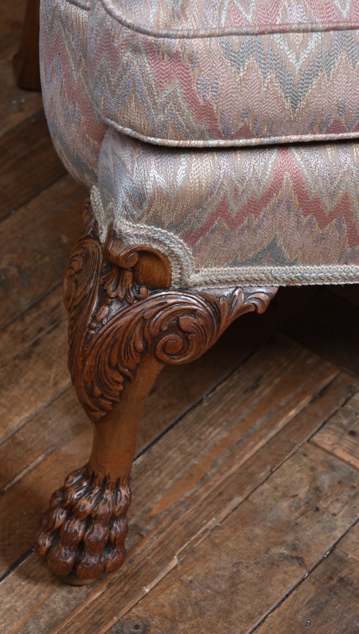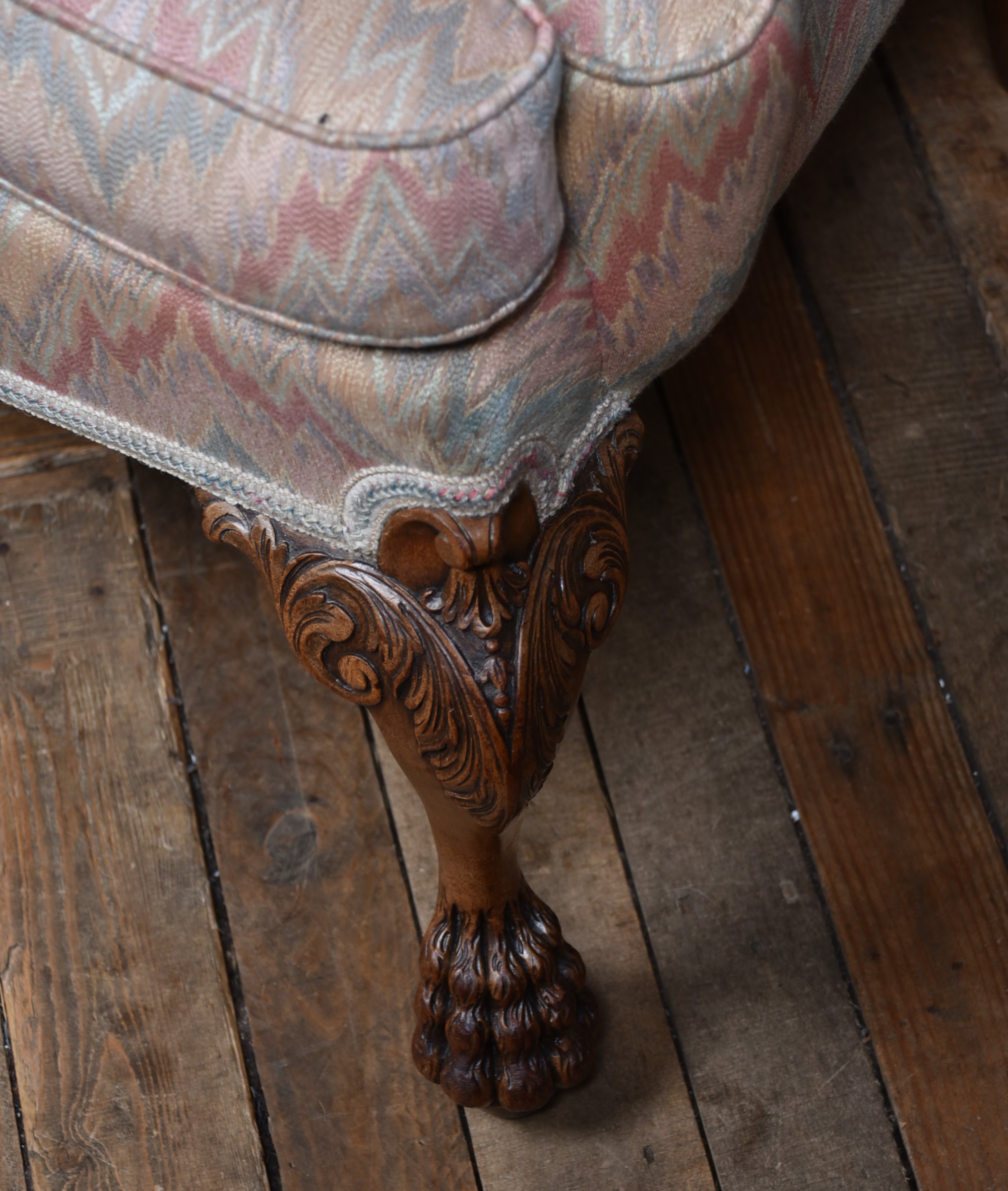 A charming Edwardian wing-back armchair upholstered in a soft, pastel zig-zag fabric. The chair features rolled arms, a high winged back, and a generously cushioned seat, offering excellent comfort and support. The frame is raised on finely carved cabriole legs terminating in bold claw-and-ball feet, demonstrating the craftsmanship typical of the period. The upholstery is neatly finished and sits well against the warm tones of the timber. Elegant, comfortable, and full of character, this is a lovely Edwardian armchair that would sit beautifully in a reading nook, bedroom corner, or living space.