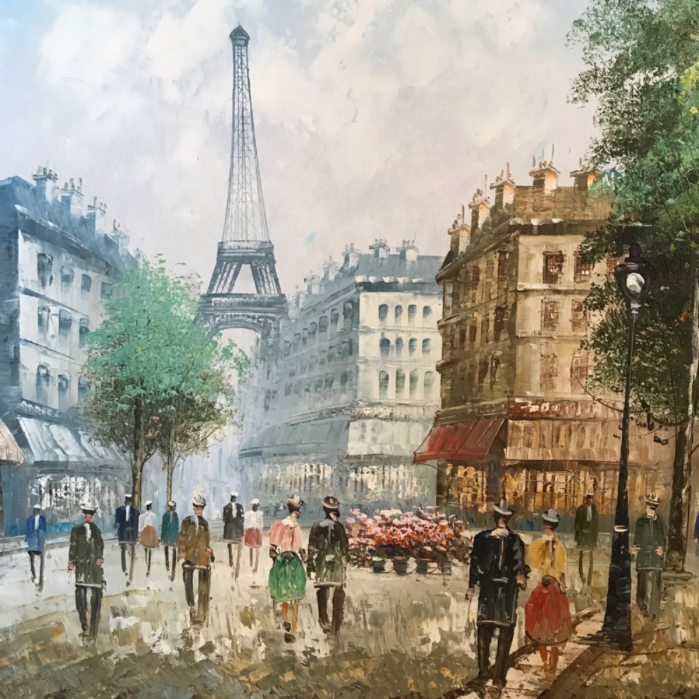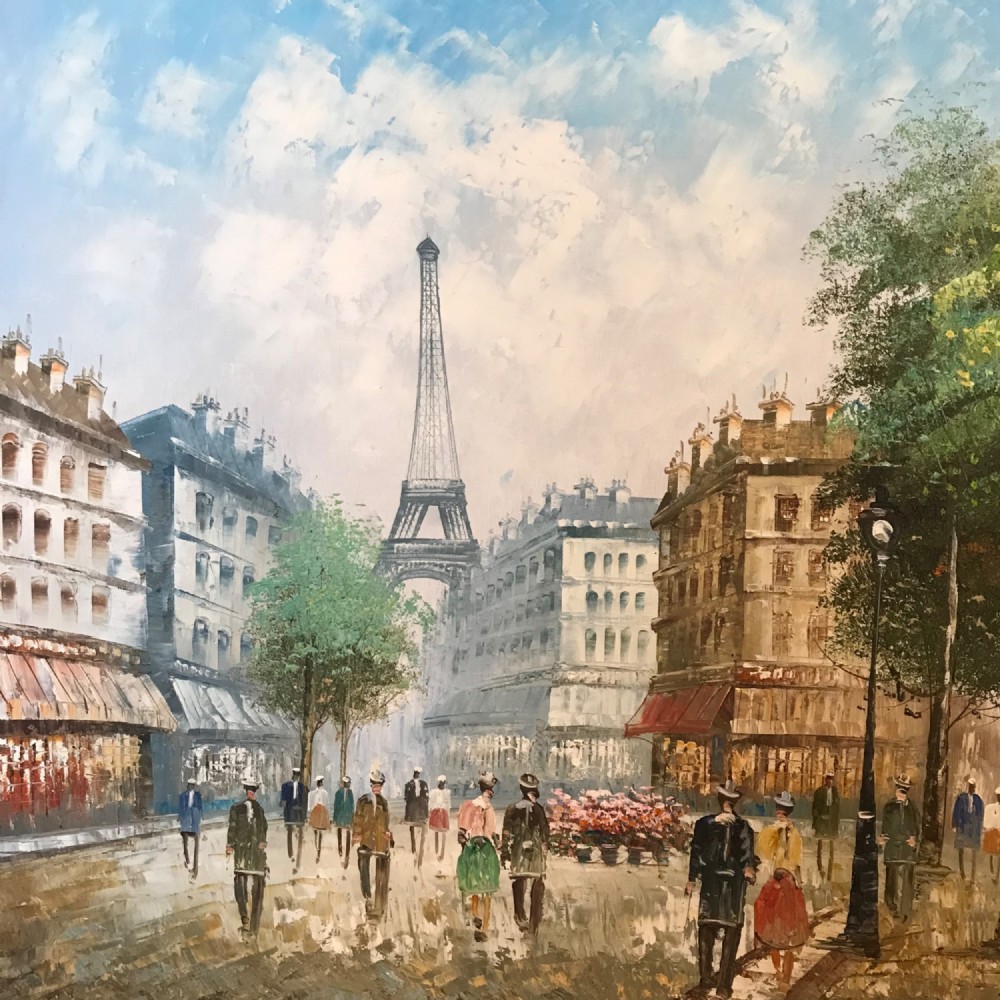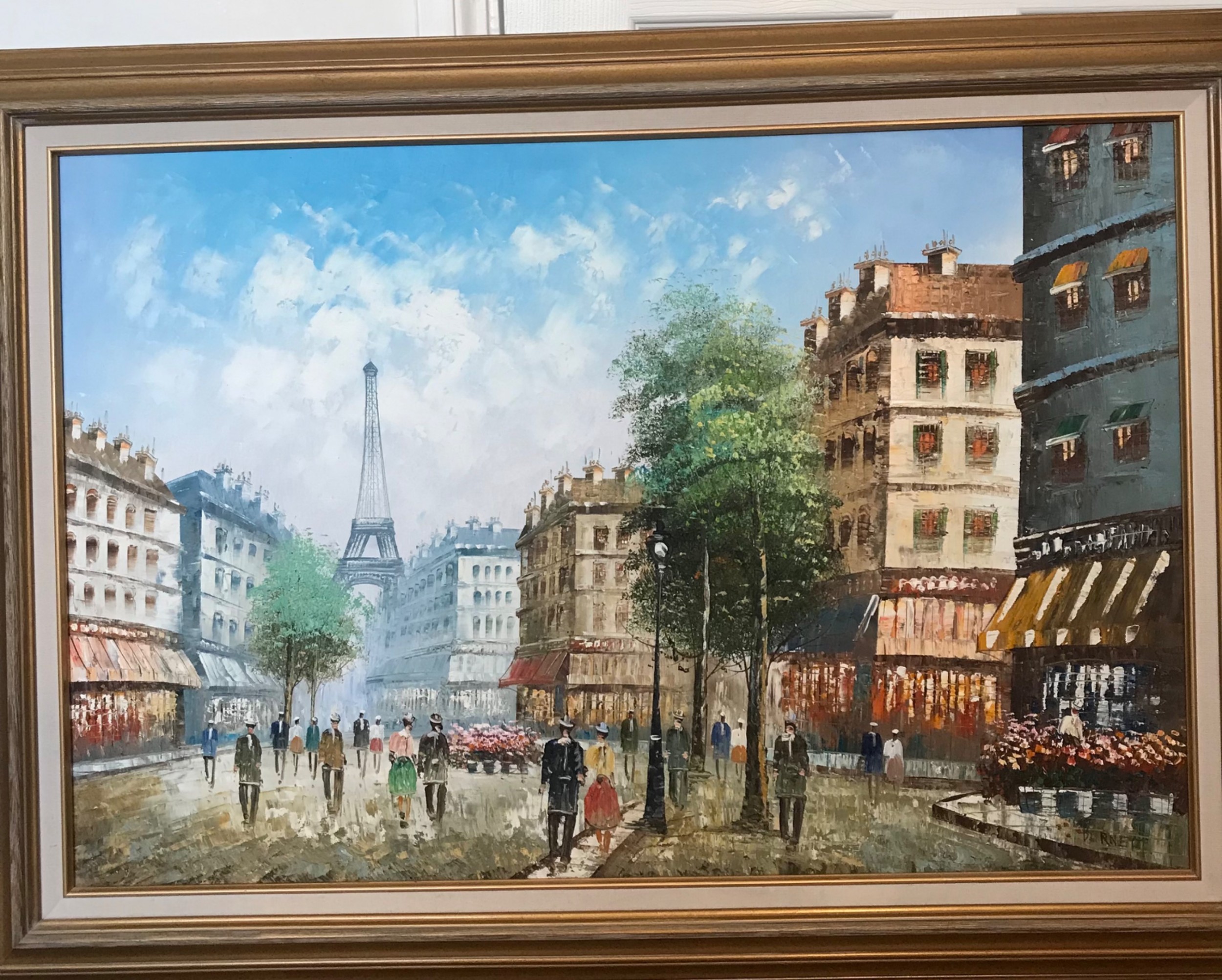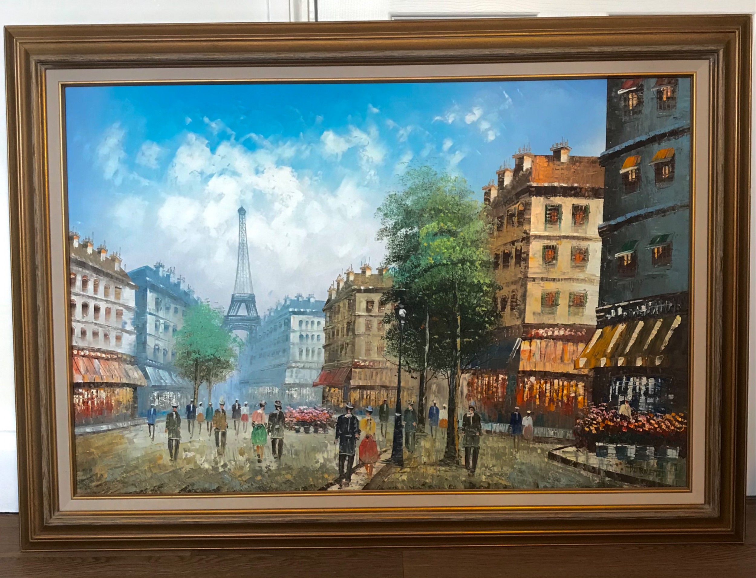 A beautiful large scale original oil on canvas painting of a Parisian street scene with the Eiffel Tower prominent in the background.
