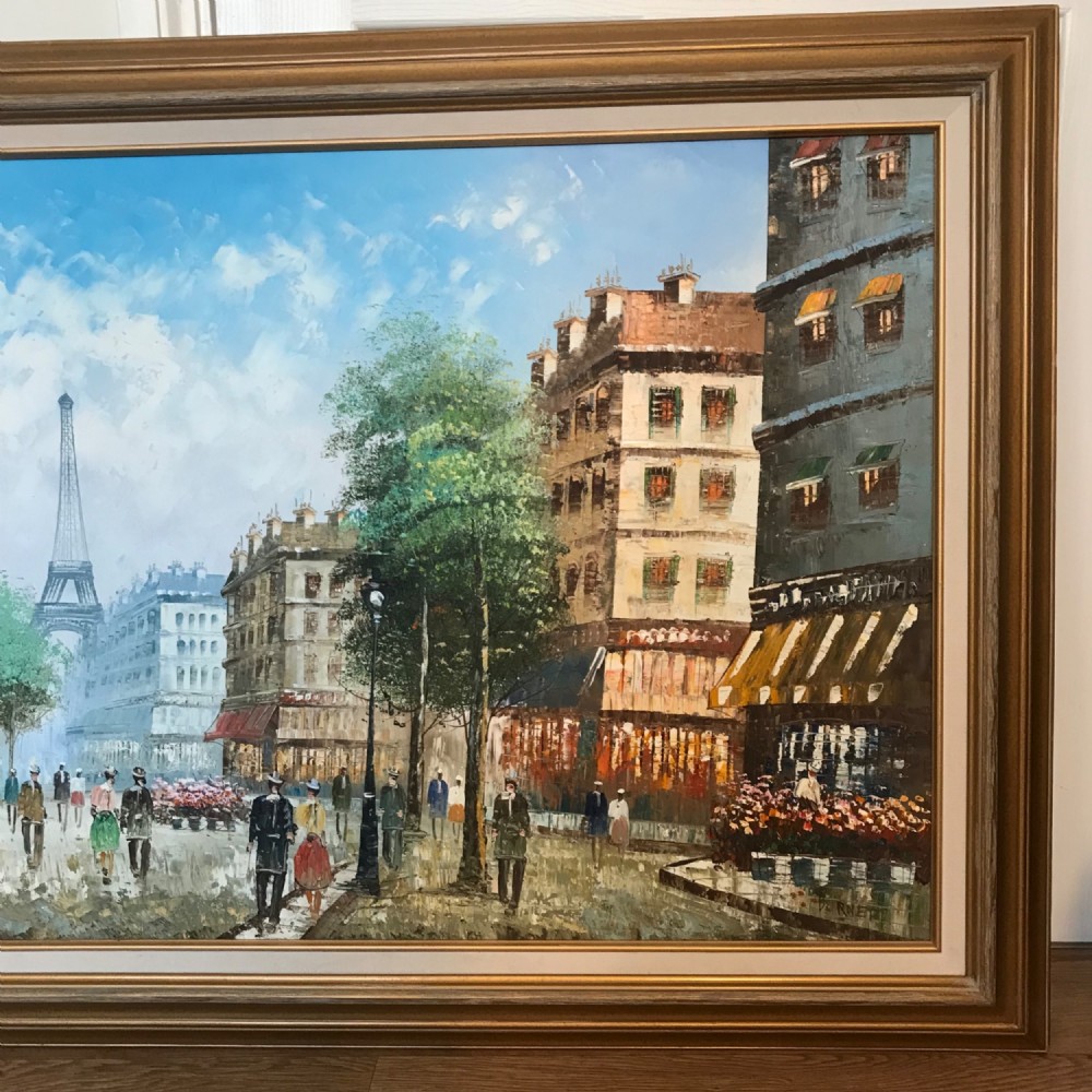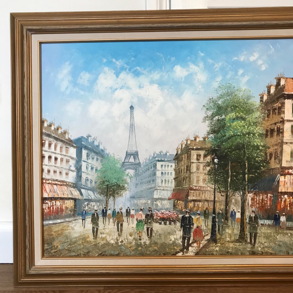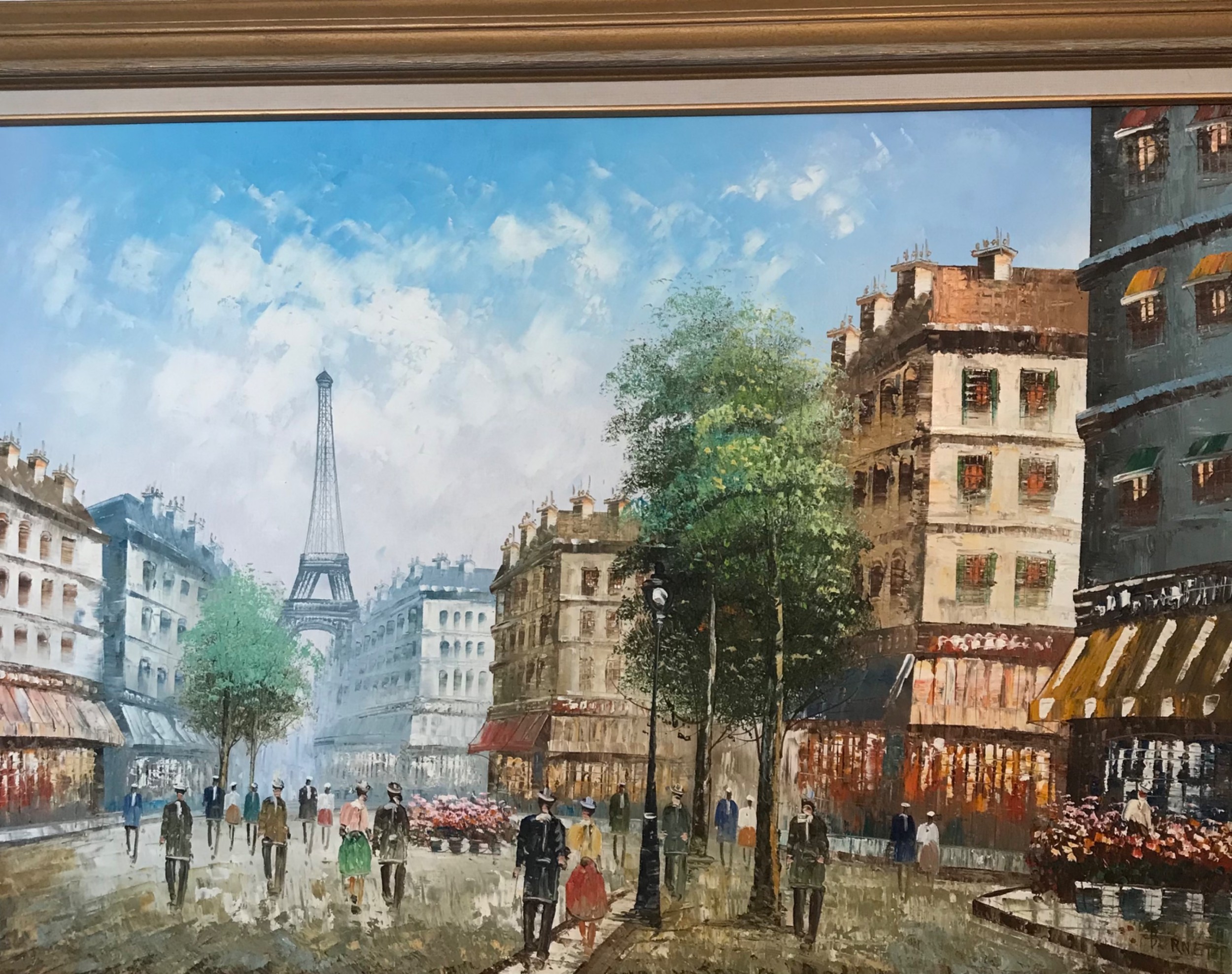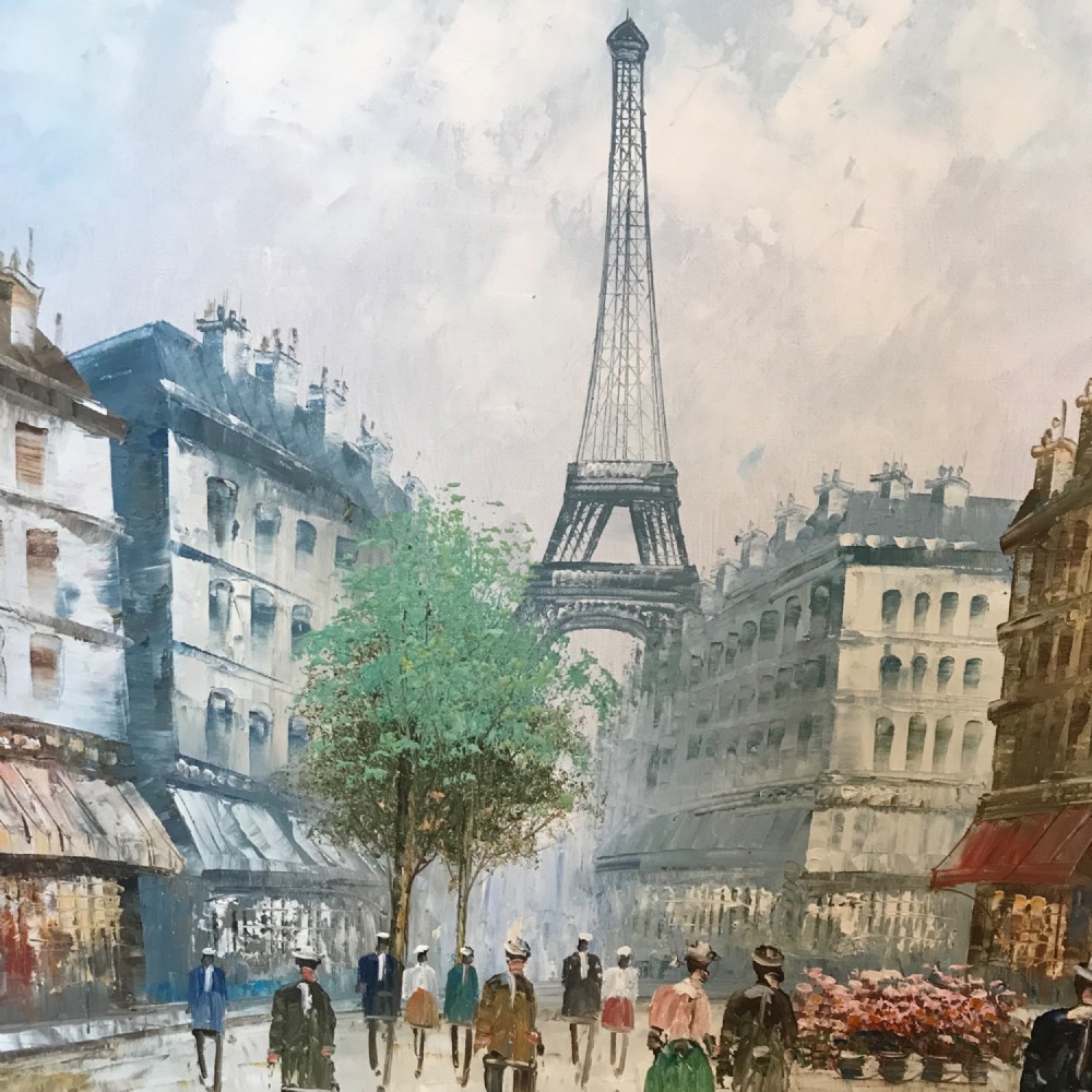 A beautiful large scale original oil on canvas painting of a Parisian street scene with the Eiffel Tower prominent in the background.