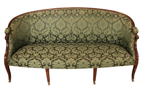 A refined Geo III English salon sofa of graceful form, featuring a curved back with outward-scrolling arms and elegant mahogany show frame. Upholstered in a rich green damask fabric with bold classical motifs, this piece exudes Georgian sophistication and charm.