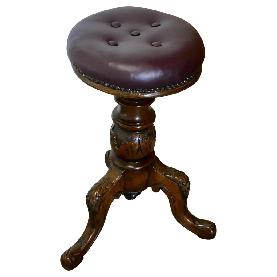 An Elegant Victorian Walnut and Leather Stool This is a very attractive and good quality piece, the stool stands on a heavy carved baluster column with 3 feet, the top is button upholstered in burgundy leather The stool is in very good attractive condition, the upholstery is new, this is a sound and attractive stool The stool is 17” in diameter at the floor, the seat is 11” in diameter, and is 21” in height NV231. Manufacture Date : 1880 Materials : Oak