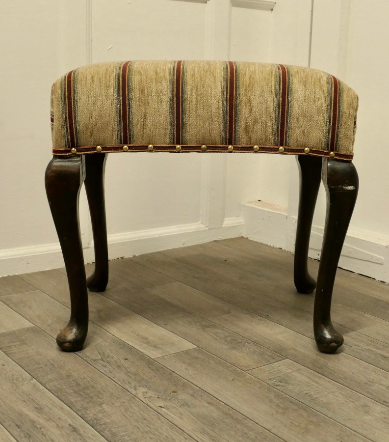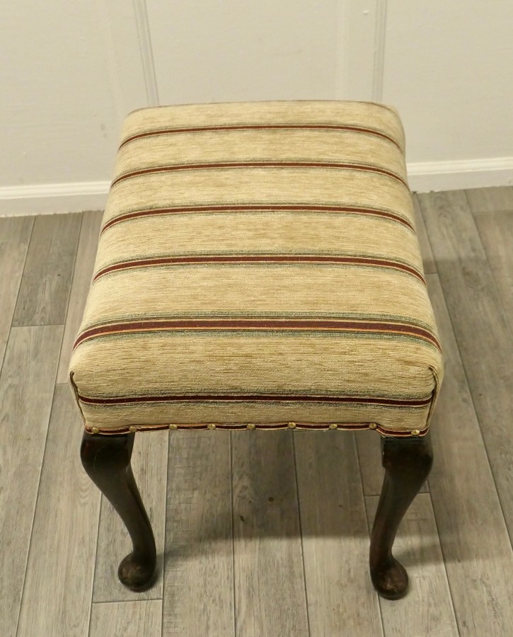 Elegant Victorian walnut occasional stool. This is a lovely quality stool is made in walnut and set on cabriole legs, it is newly upholstered with an extra thick Heavyweight Regency Striped Chenille Fabric This is a good sturdy stool with new upholstery The stool is 20” high, 21” long and 16” wide JK50 Manufacture Date : 1900 Materials : Chenille