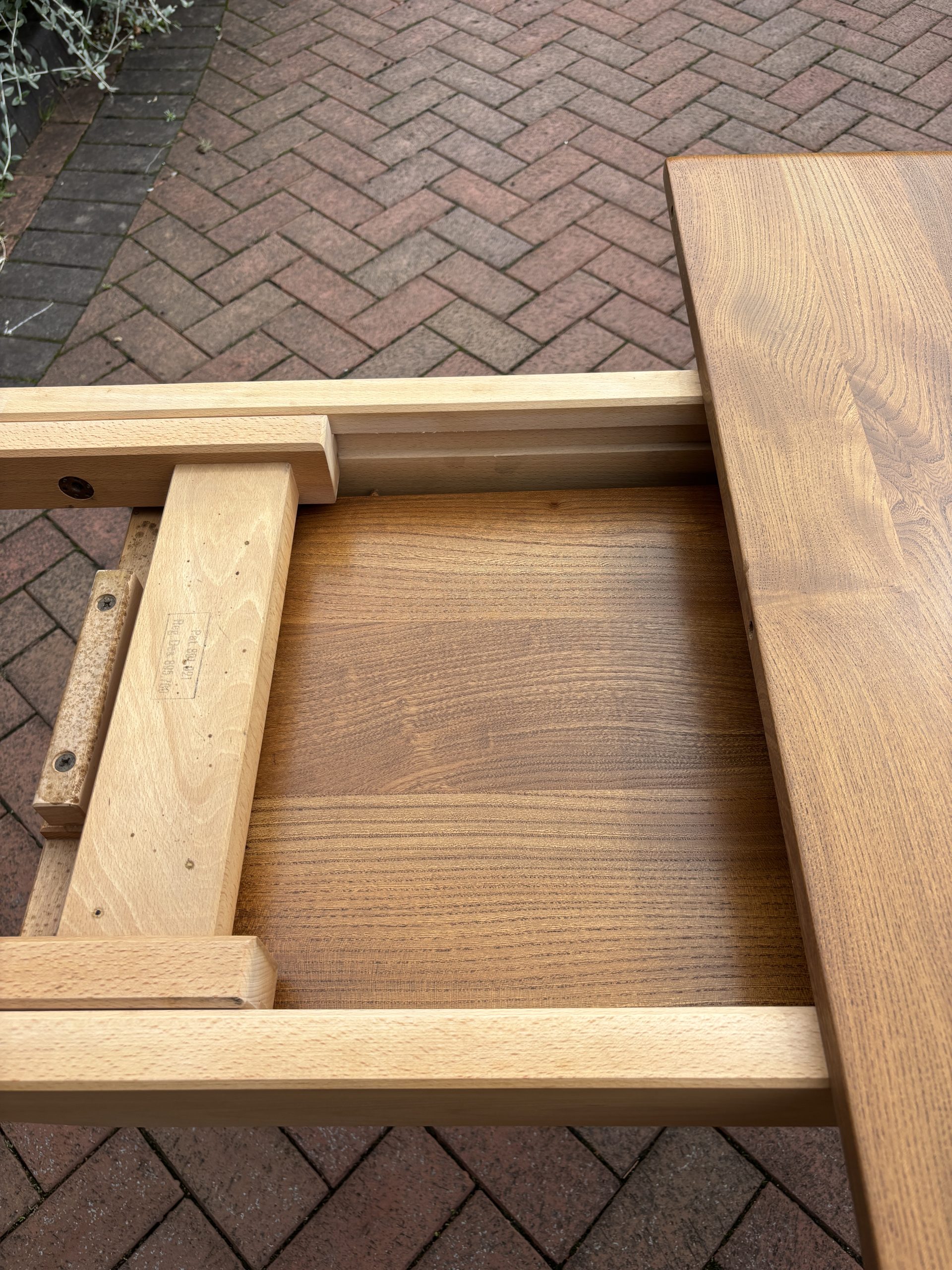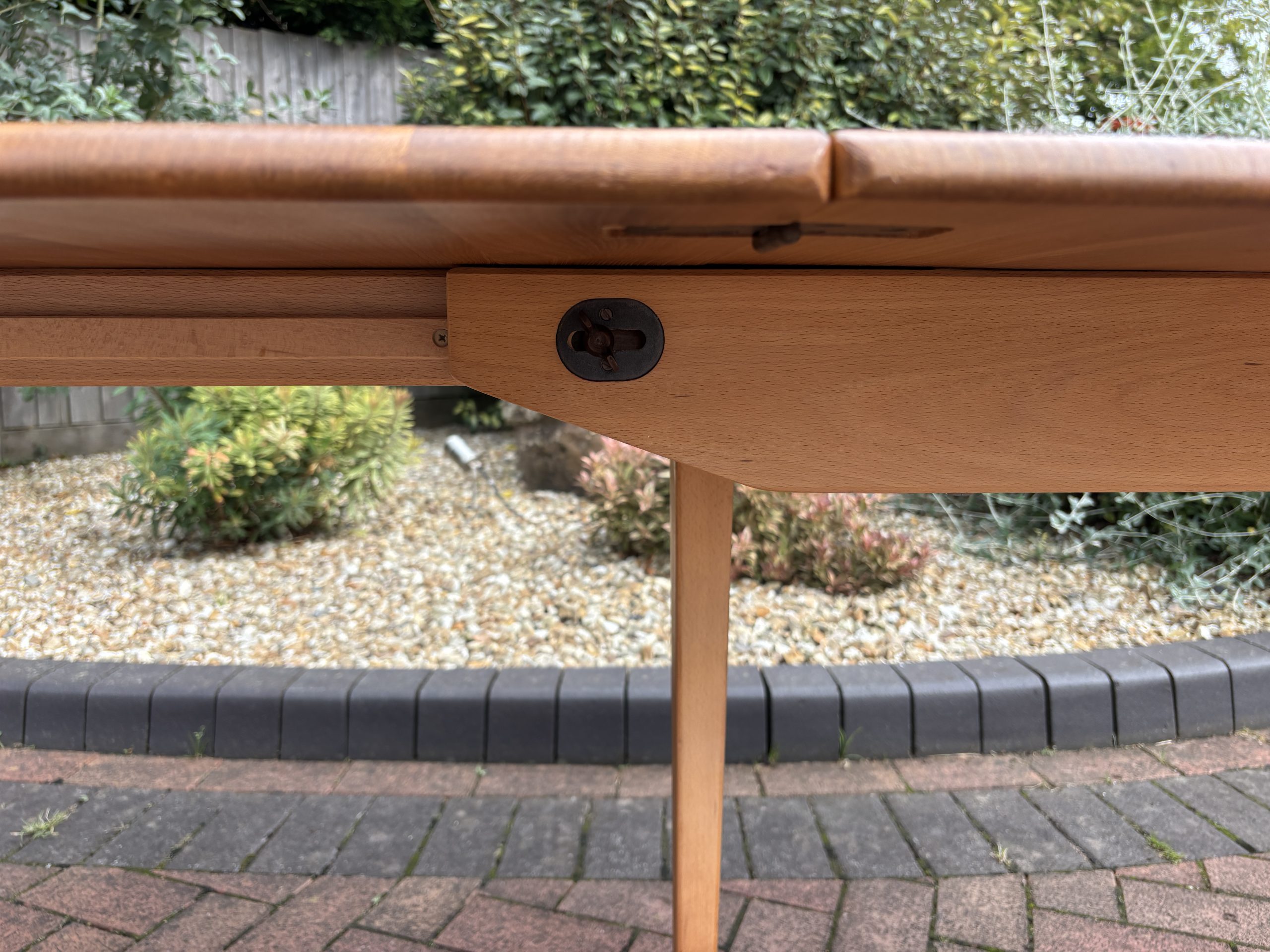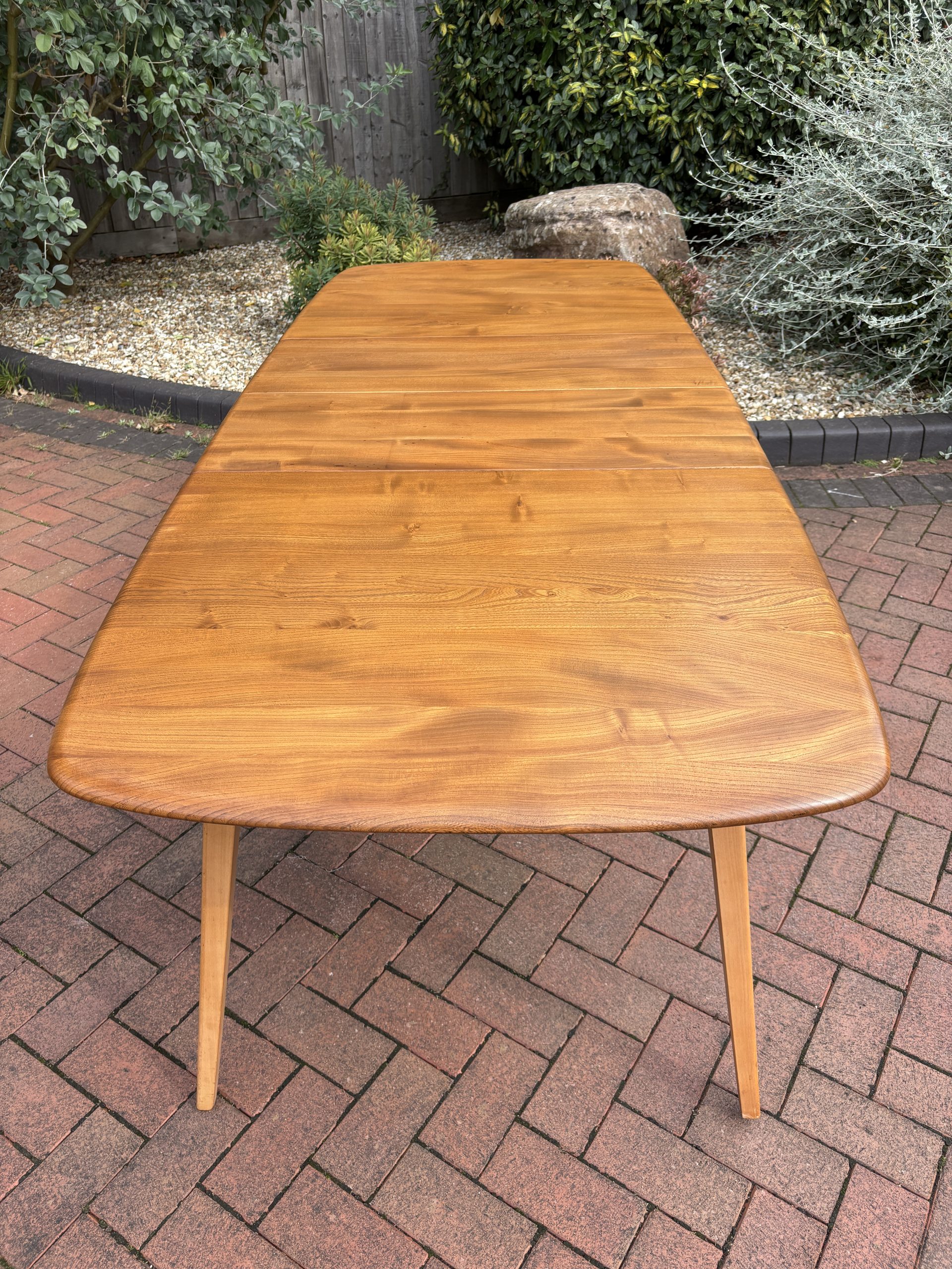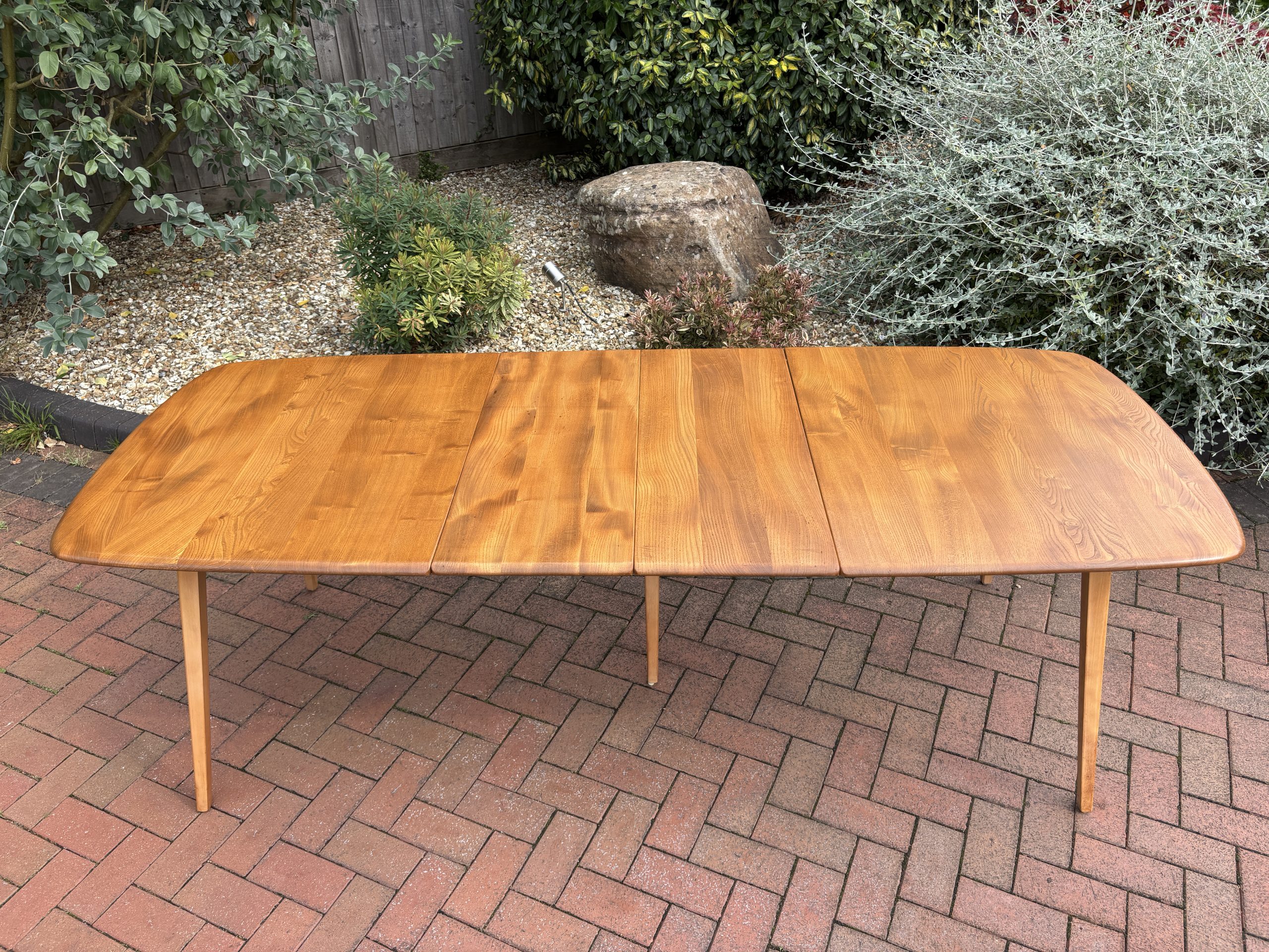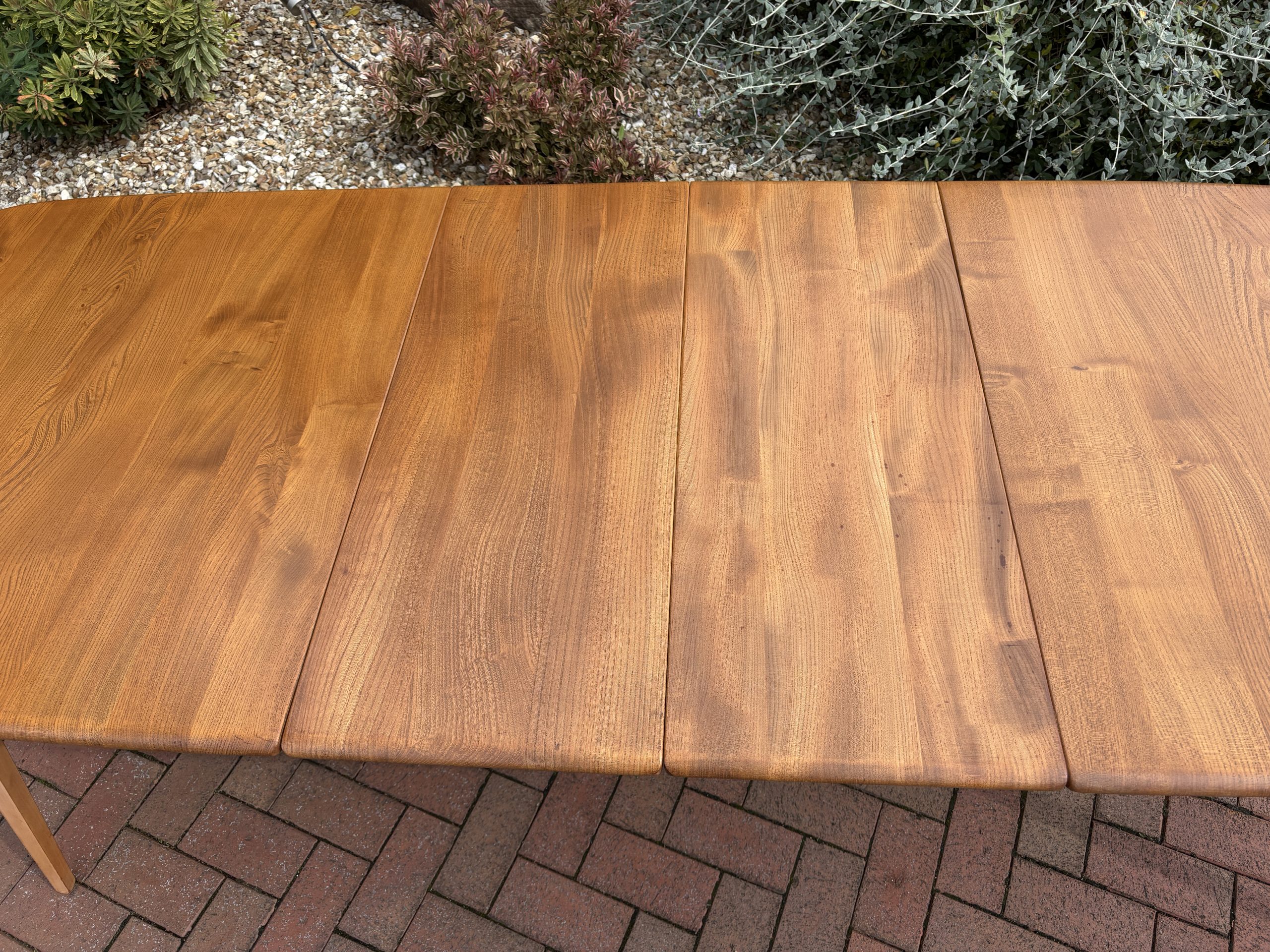 The table top is solid elm with good elm configuration, and stands on solid beech splayed legs. When extended the twin hinged extra leaf is locked tight with two keys. The leaf is stored underneath the table when not in use.