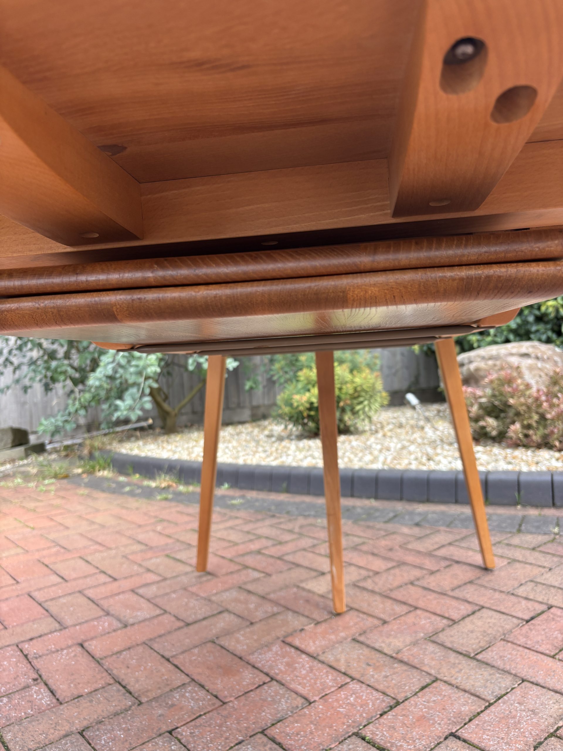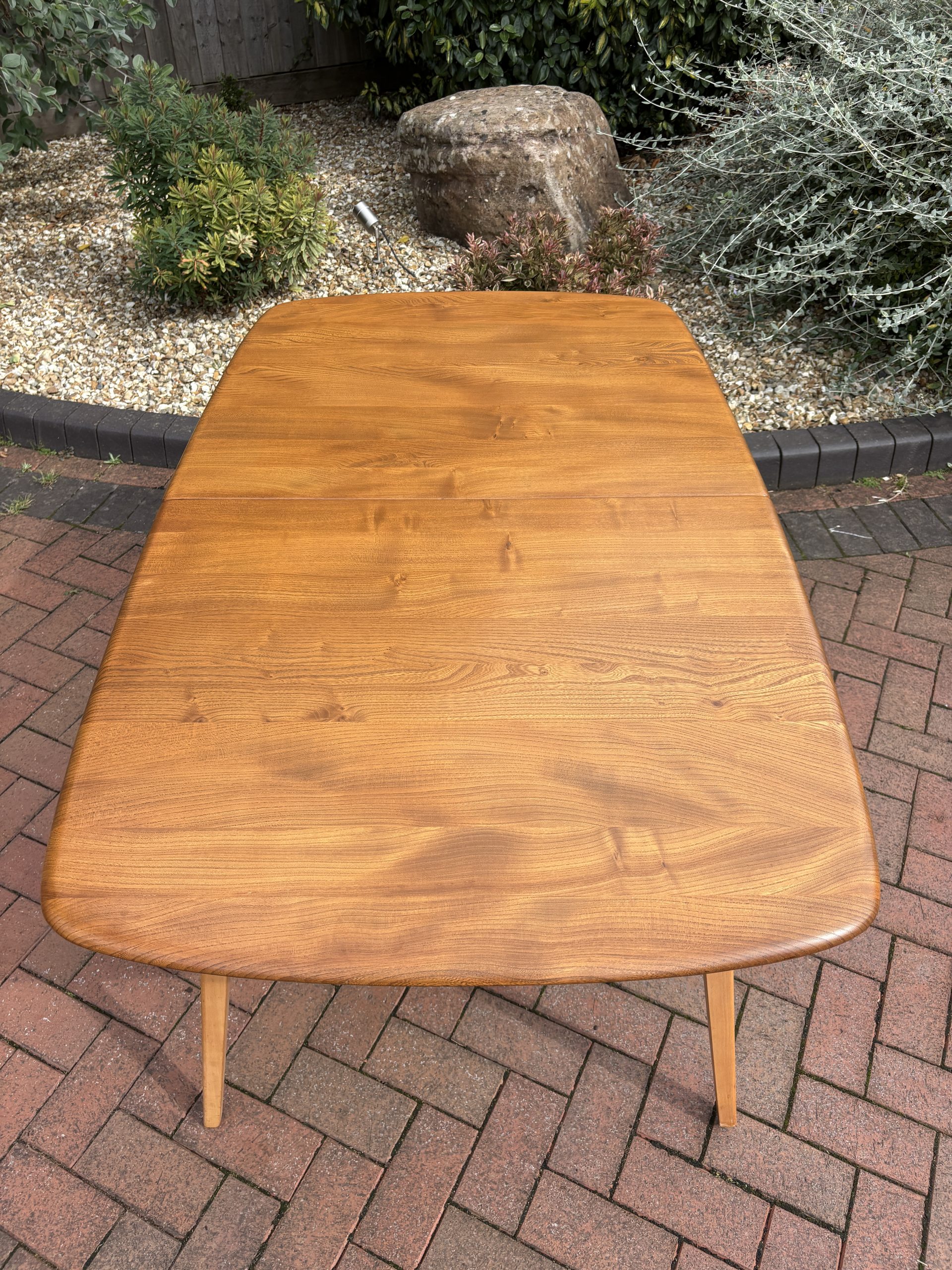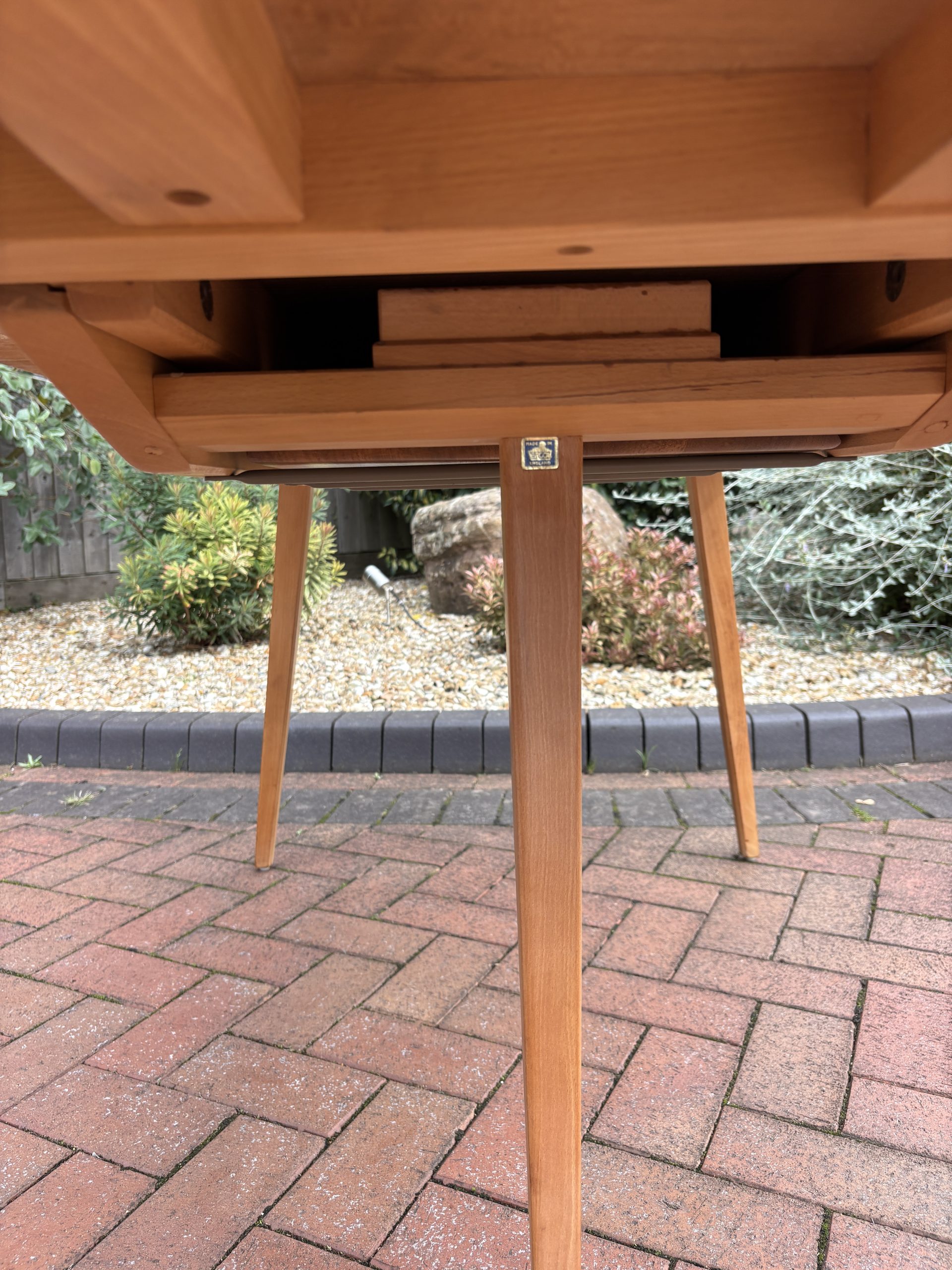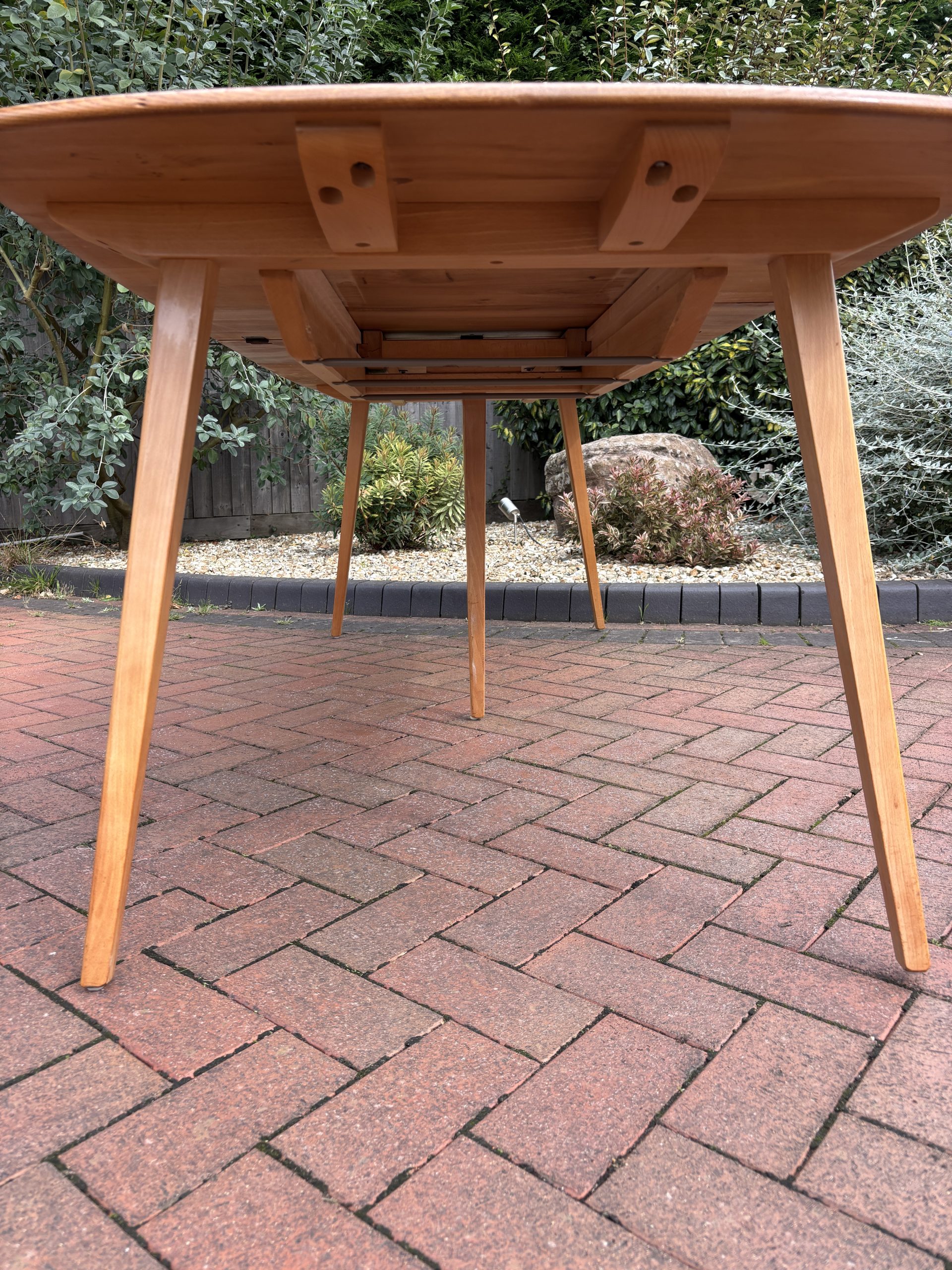 A mid century Ercol Grand Windsor extending dining table. Blue label present dating it between 1954 – 1976.