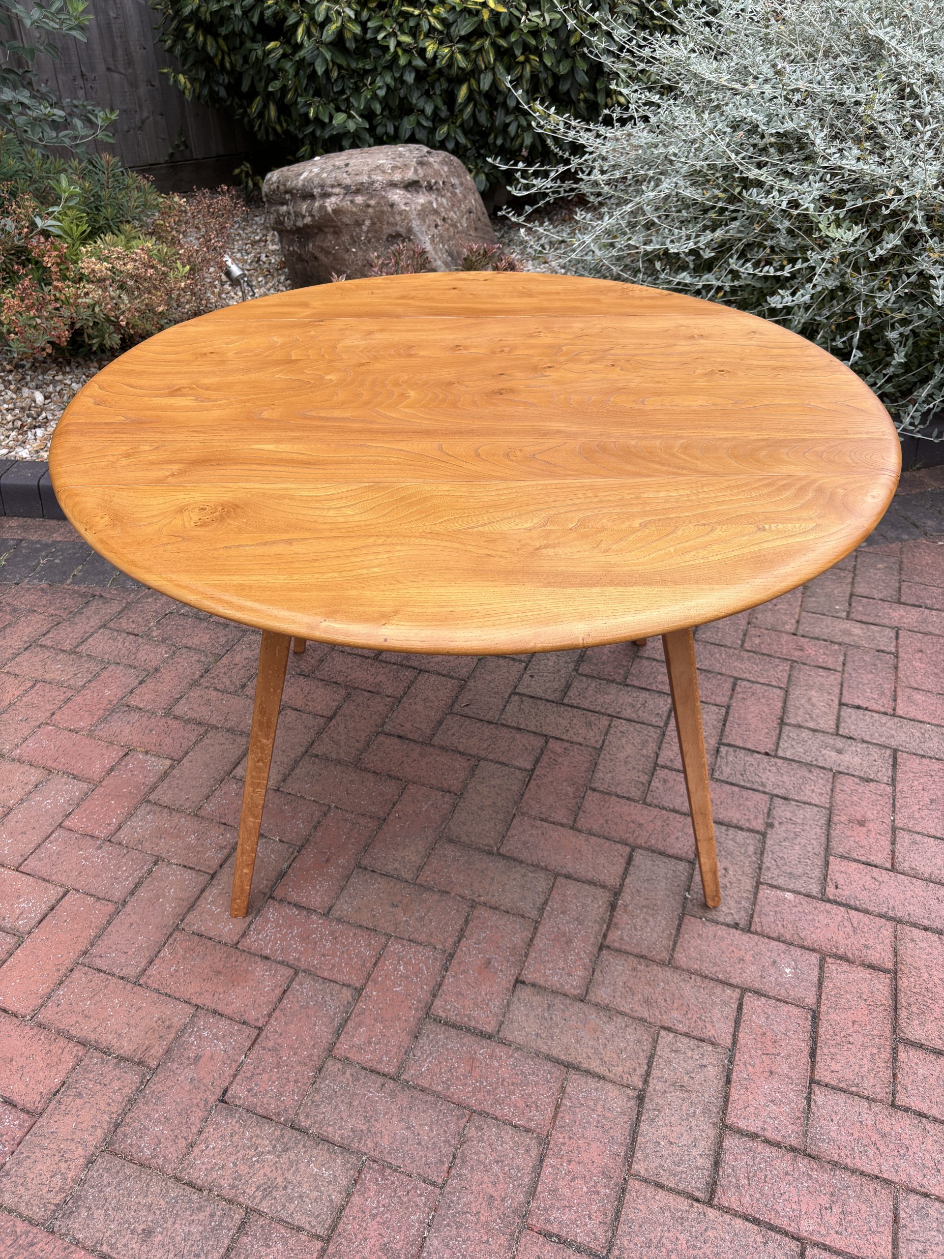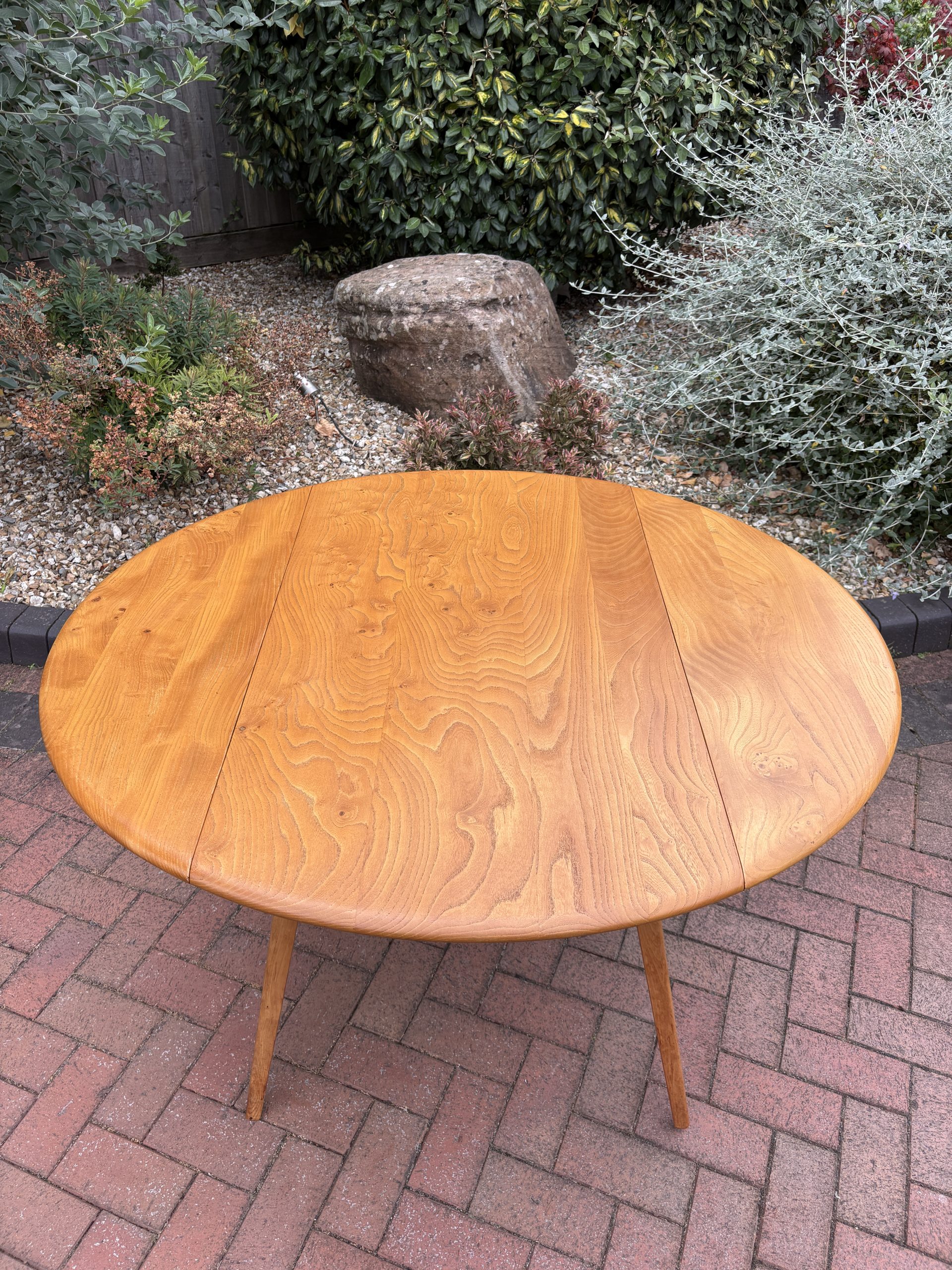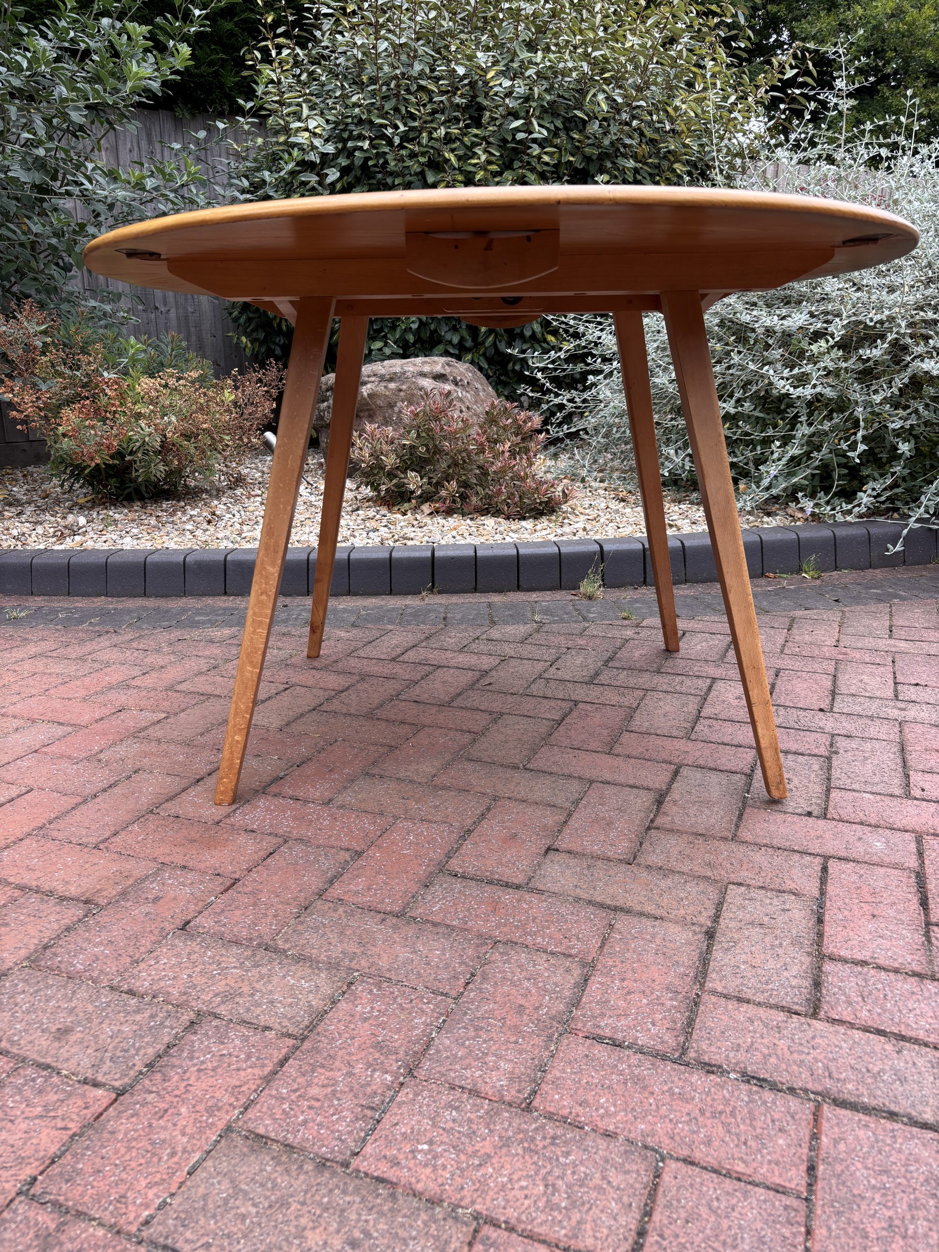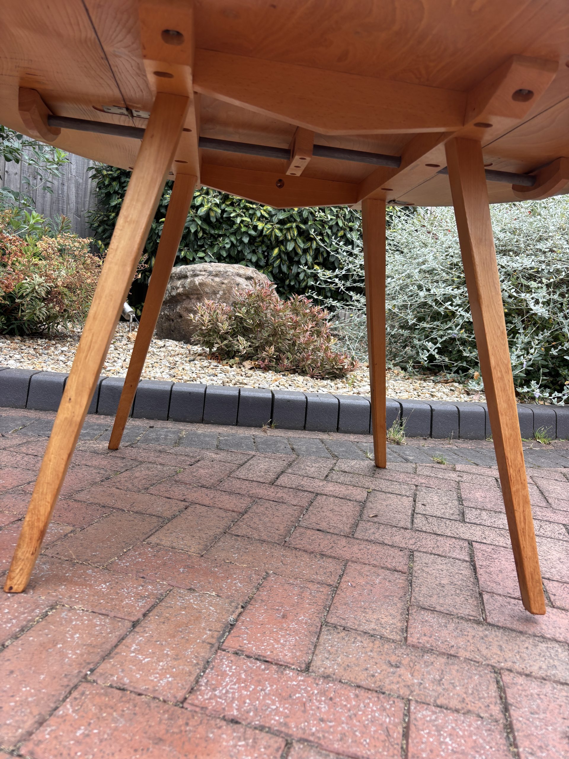 Mid Century Ercol drop leaf dining table, having a solid elm top and raised on solid beech legs. Blue label present dating it between 1954-1976.