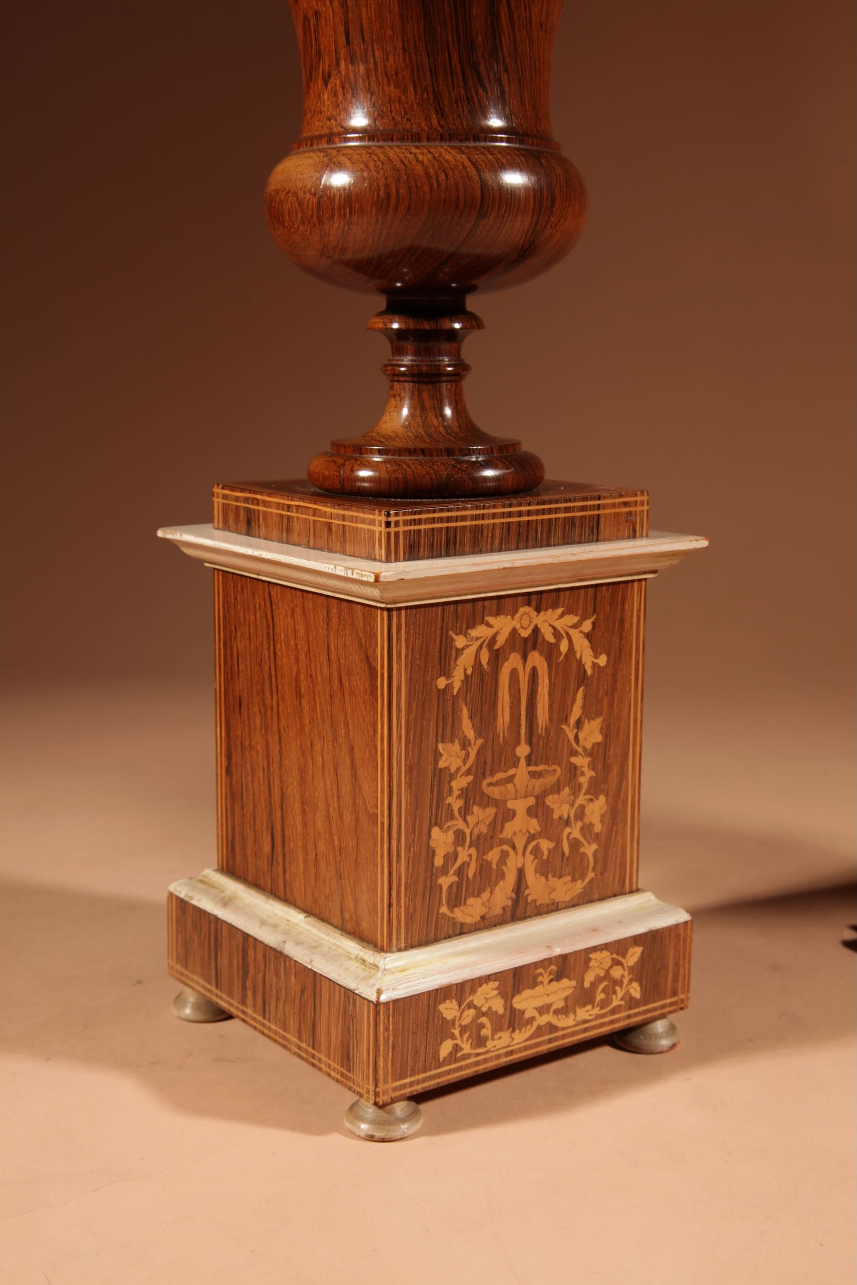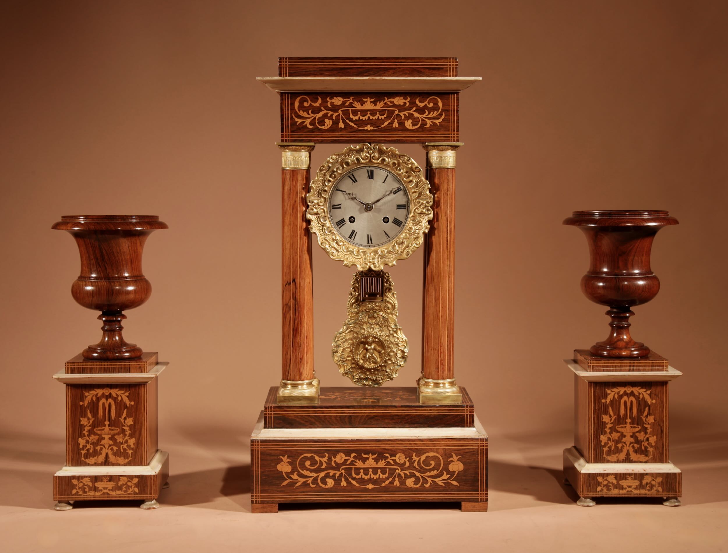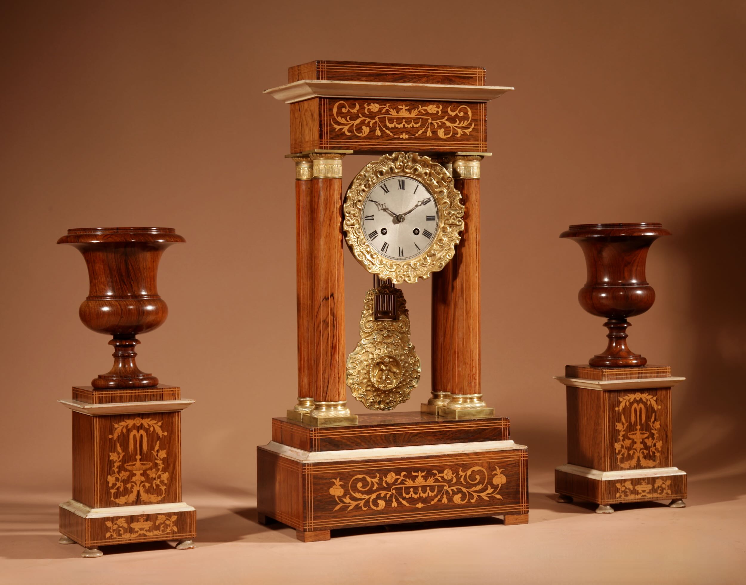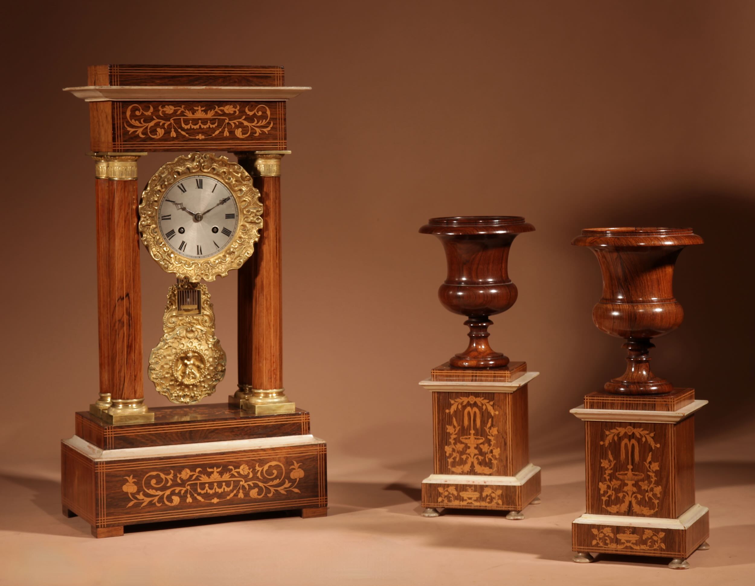 It is rare to find a portico clock garniture with these high type Medici vases.