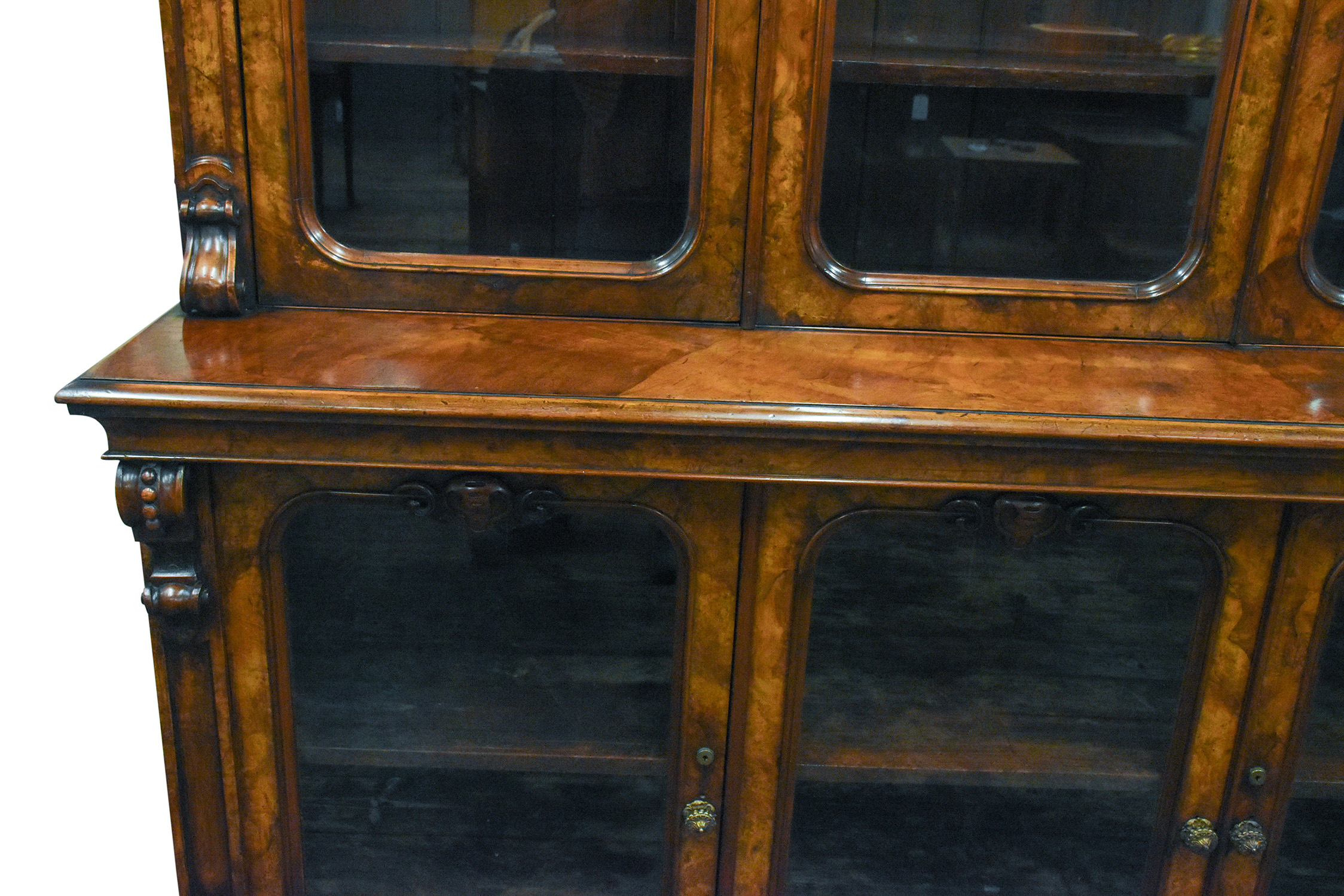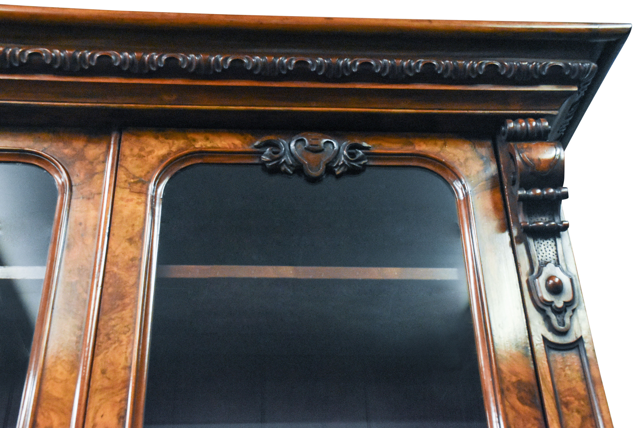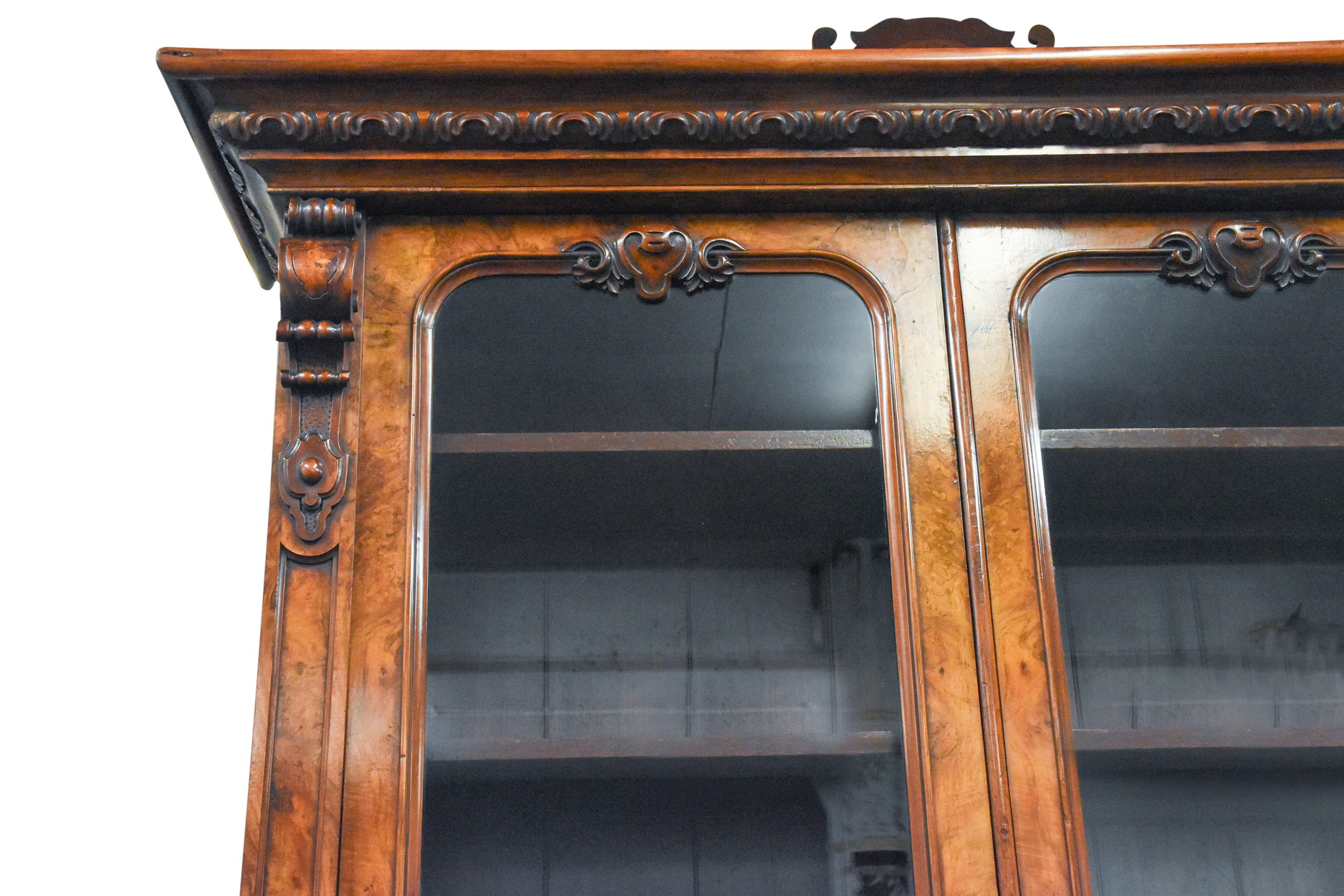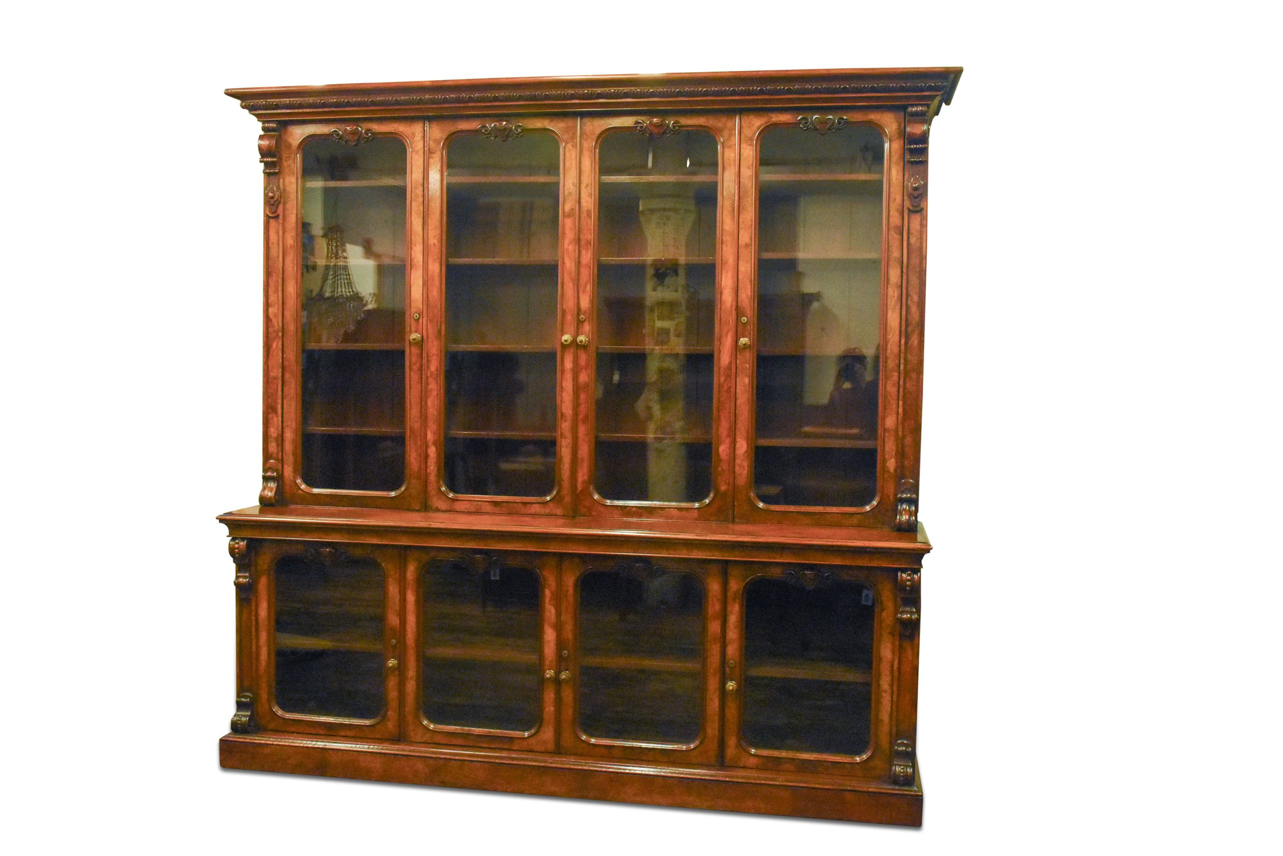 Circa 1860. Exhibition-quality four door Victorian carved burr walnut cabinet bookcase. Surmounted by a moulded, foliate carved cornice above 4 arched glazed doors with shield and foliate carved crests, cast brass handles and escutcheons and Brahma locks, opening to adjustable shelving. The base in mirror-matched figured walnut and a cavetto frieze above 4 further glazed shorter doors. The sides flanked by columns with carved capitals and corbels; all over a moulded enclosed plinth base.