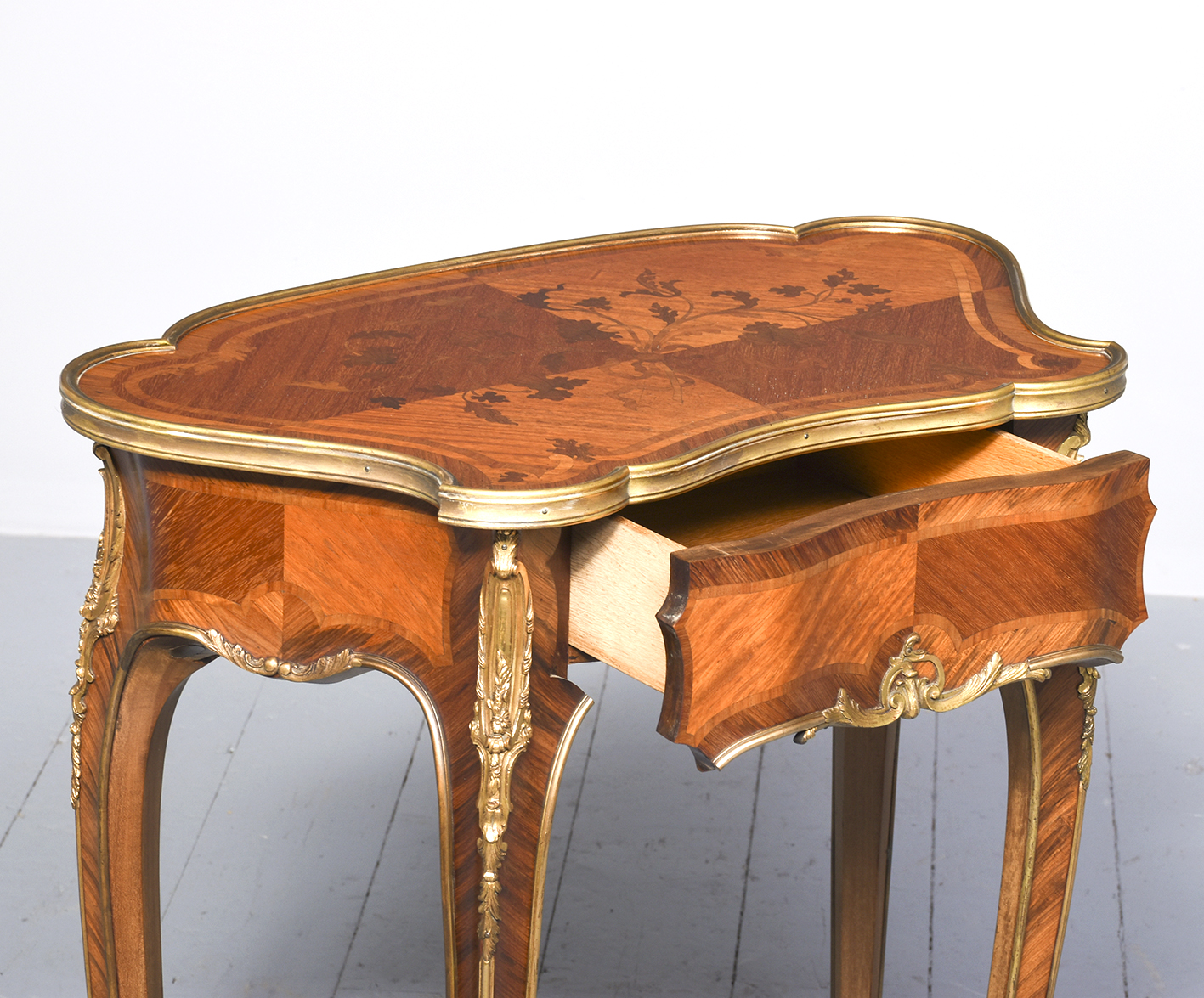 Circa 1870. An exhibition quality French inlaid parquetry ormolu mounted side table, the top with mirror matching inlay with floral inlay with swags and ribbons further cross banding, the top is enclosed by a shaped raised ormolu banding, to the front there is shape drawer with further inlay the sides and back are also in similar marquetry, all the edges are finished with an ormolu beading, the table stands on four elegant cabriole legs, the well clast mounts to the facing and the beading from the sides and the aprons continue down on three sides on the leg all resting on well-cast sabots.