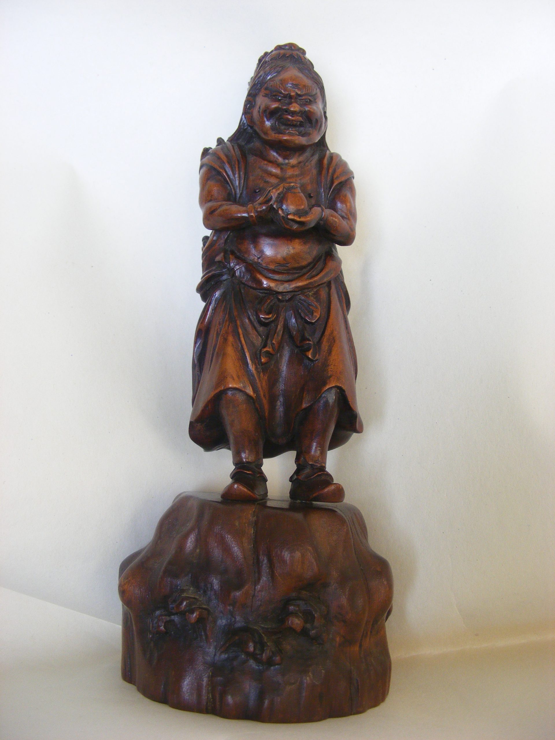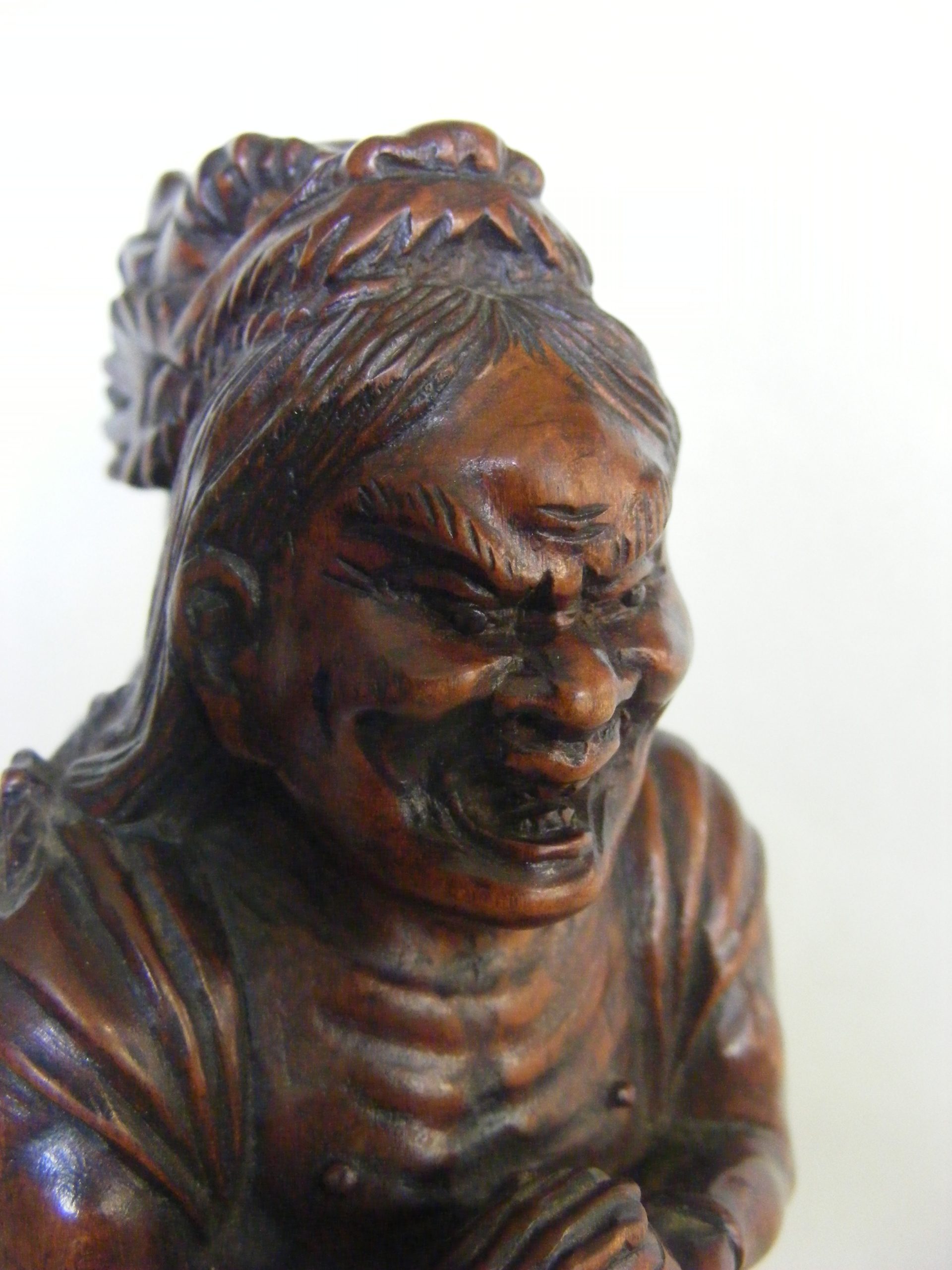 In this beautiful carved piece, Chennan Sennin has summoned the dragon and is depicted grimacing as the dragon appears to have climbed onto his back and sunk it’s teeth into the ascetic’s skull. This humorous take on the myth appears to show the dragon controlling the ascetic rather than the other way round.