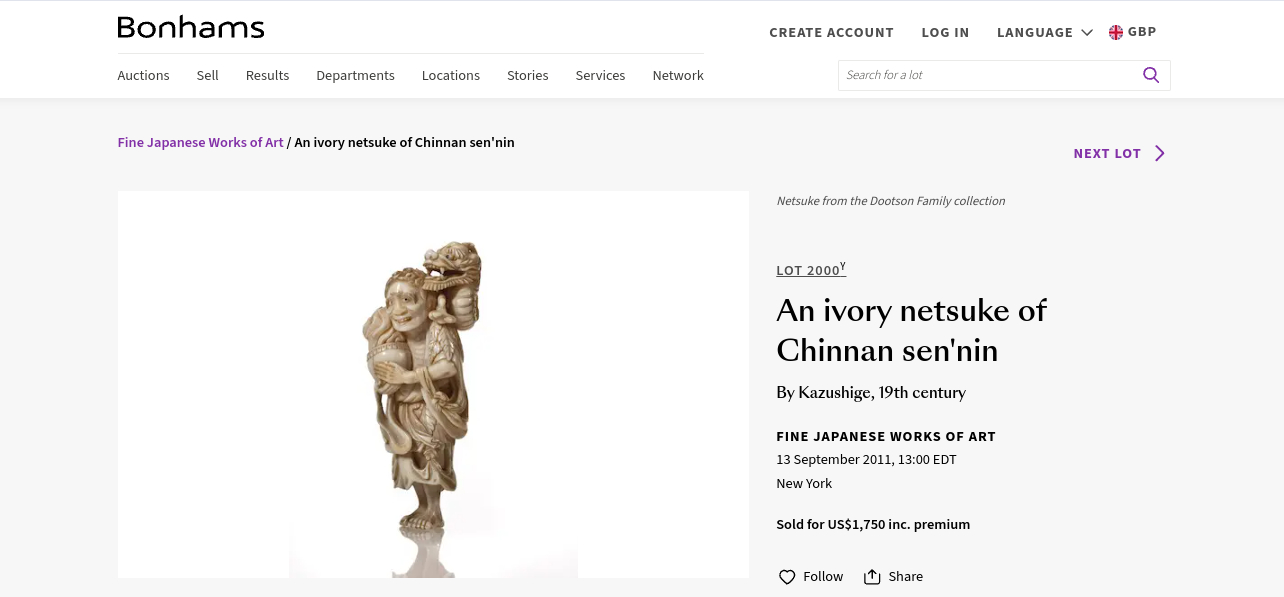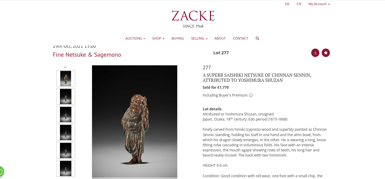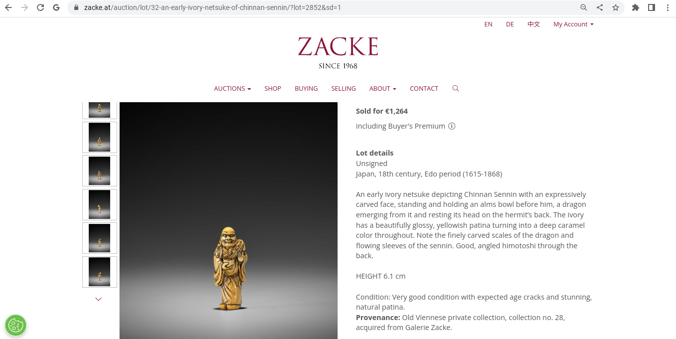 Galerie Zack sold a small ivory netsuke Chennan Sennin for 1264 Euros (2020).