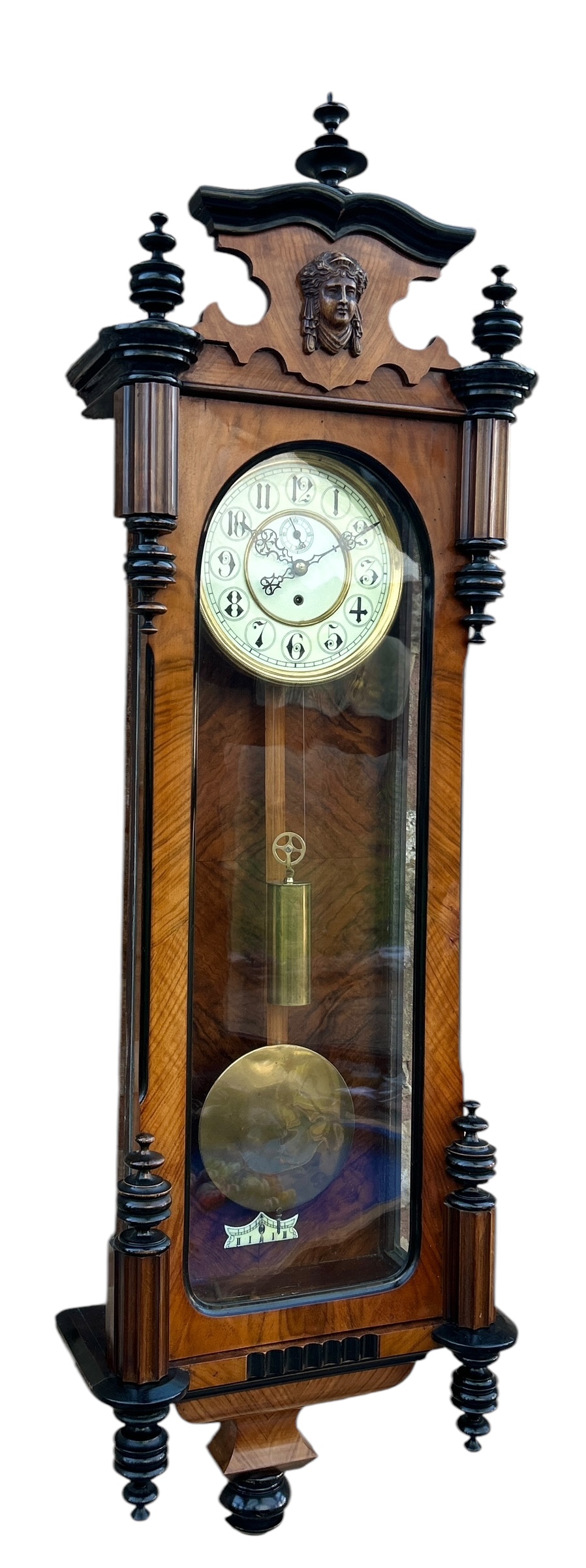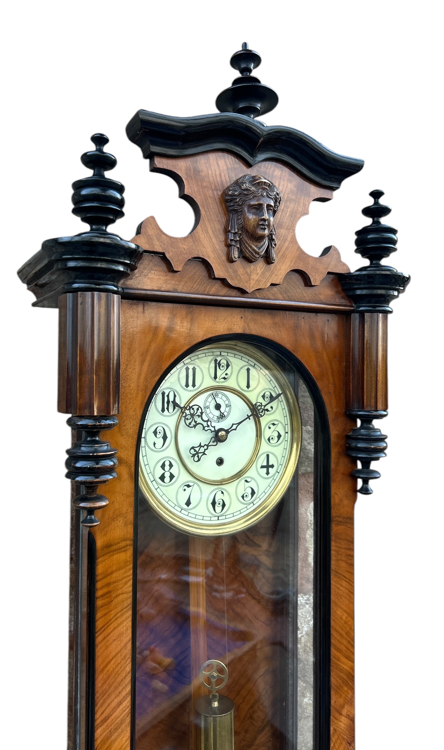 Original enamel dial with Arabic numerals very unusual for a Vienna, original finely cut ornate foliate hands. Ebonized turned finials and mask finial at the top.