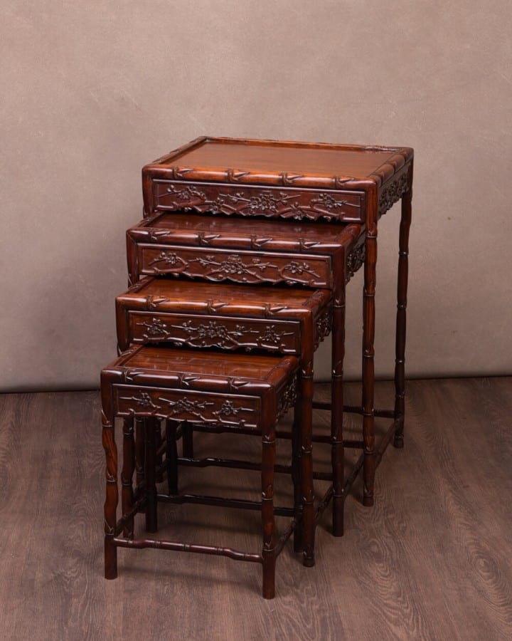 Fantastic set of 4 Chinese tables with faux bamboo frames in excellent original condition. These tables are made from a Chinese hardwood which is part of the rosewood family. Each of the four rectangular tables have beautifully carved friezes faux bamboo edges, legs & cross stretchers. These very useful little tables are in excellent condition with only odd age-related marks will look fantastic wherever they are place in the home and as they tuck into each other wont take up much room.