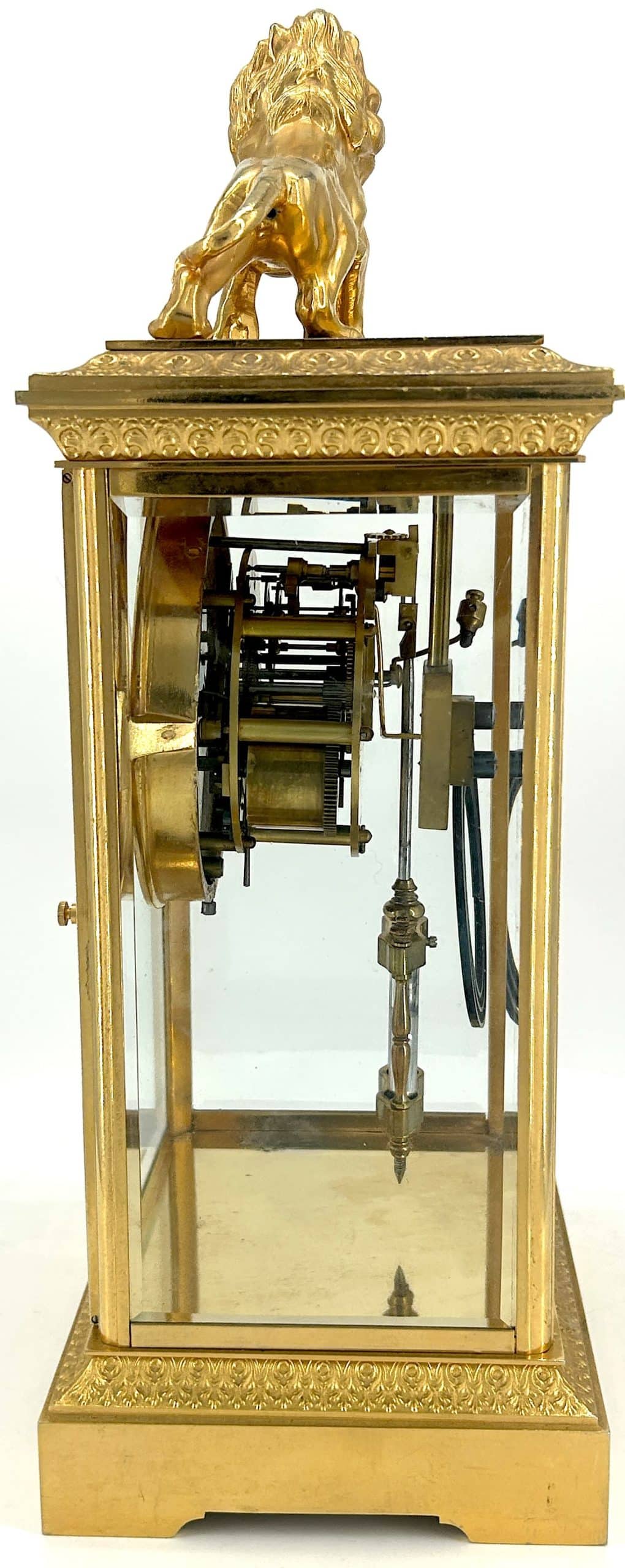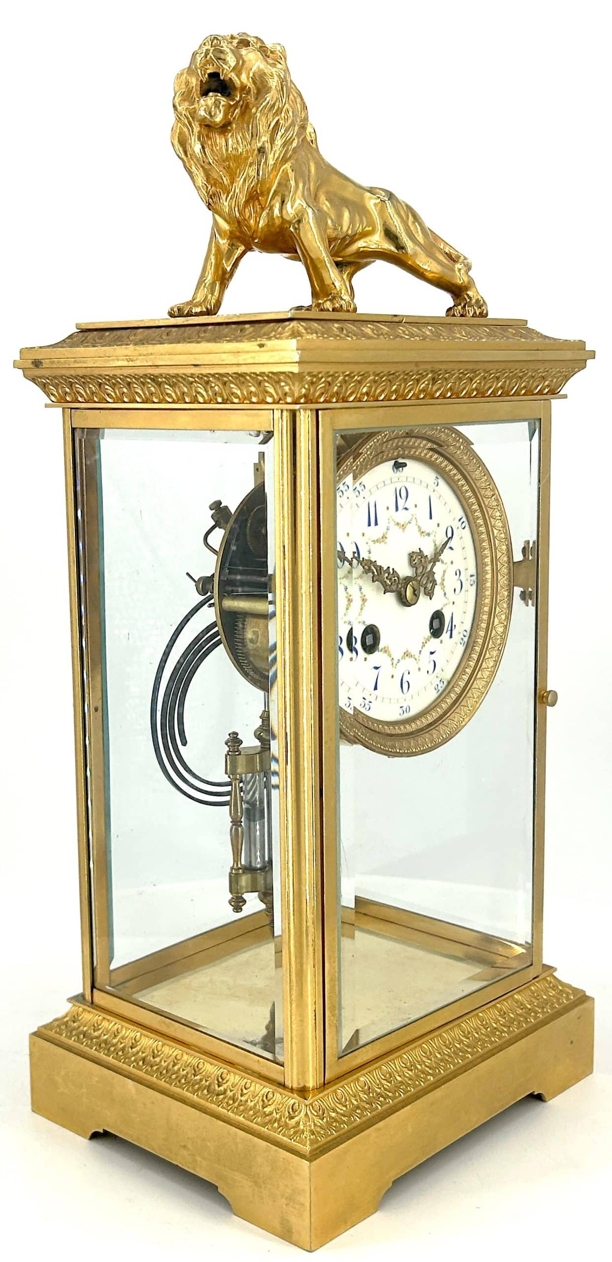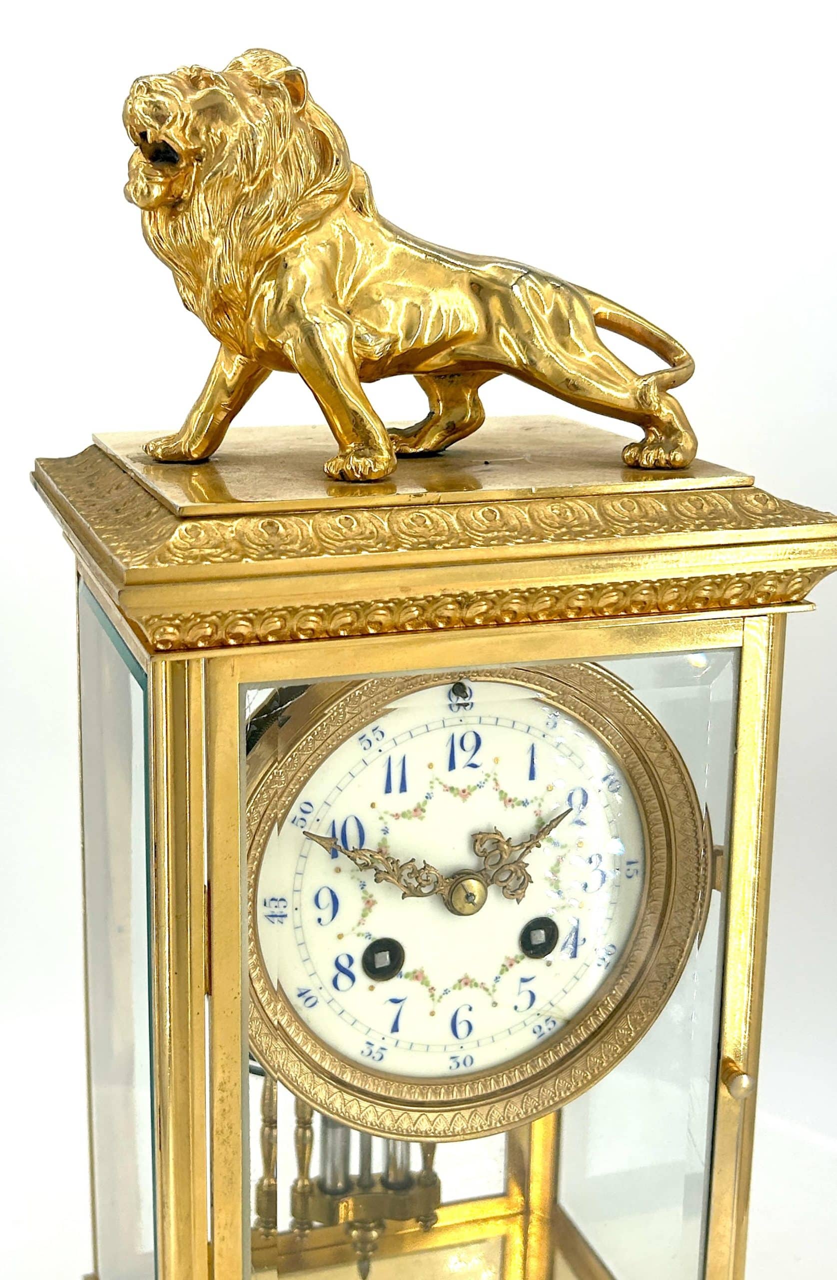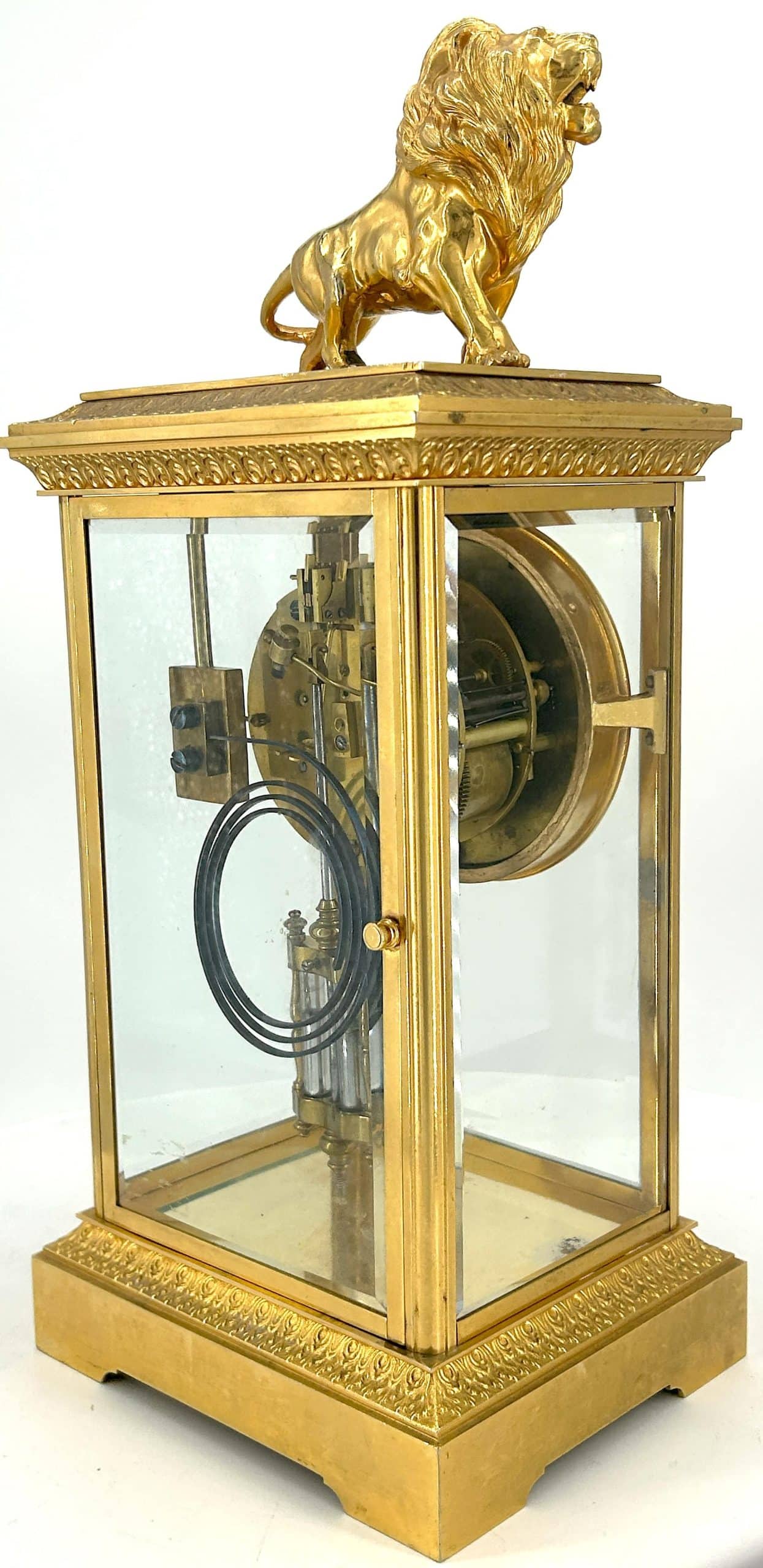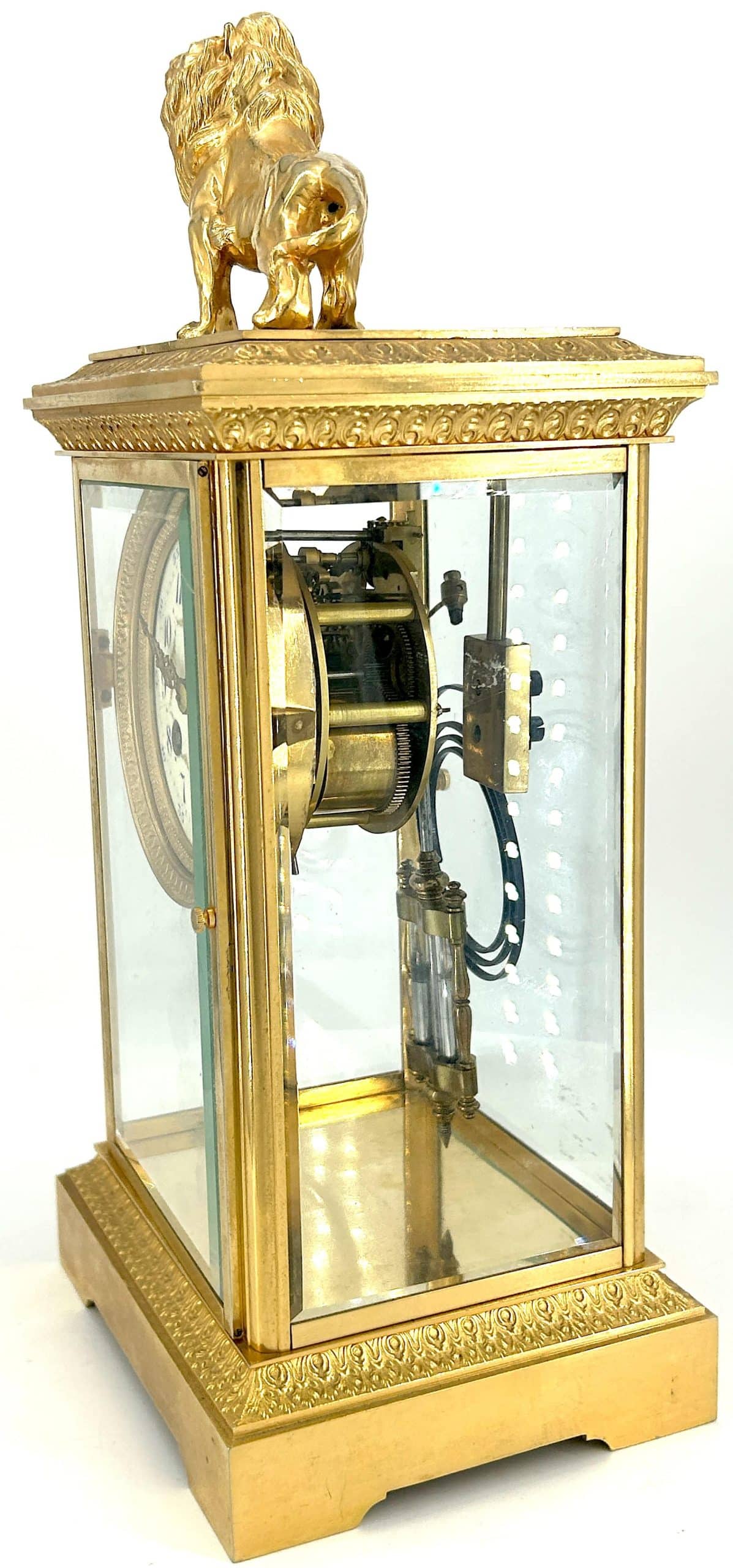 Amazing French Table Regulator mantle clock in a a bronze ormolu case with 4 glass panels topped with a bronze ormolu lion figure. French 8 day gong striking movement, fantastic collectors piece.