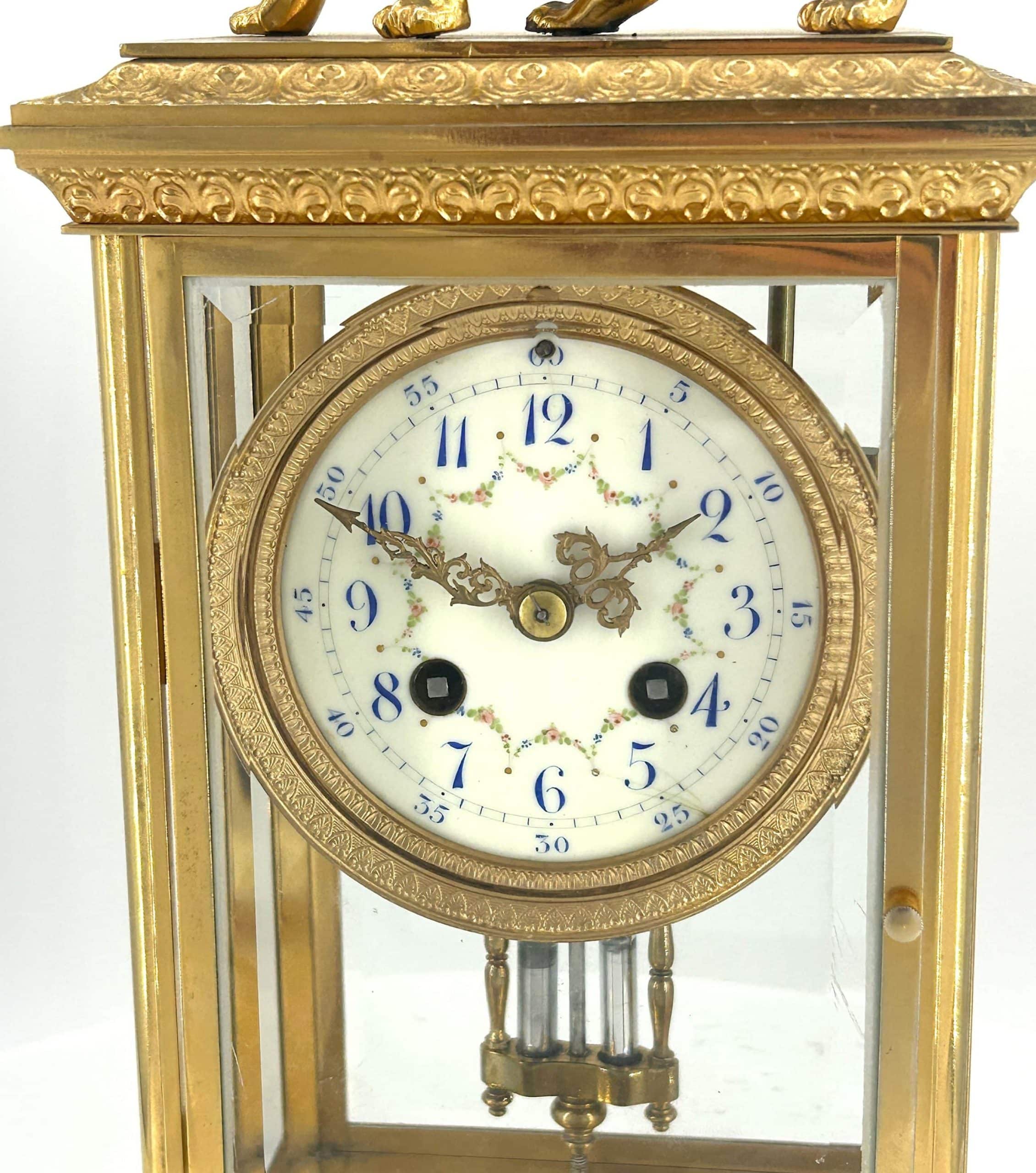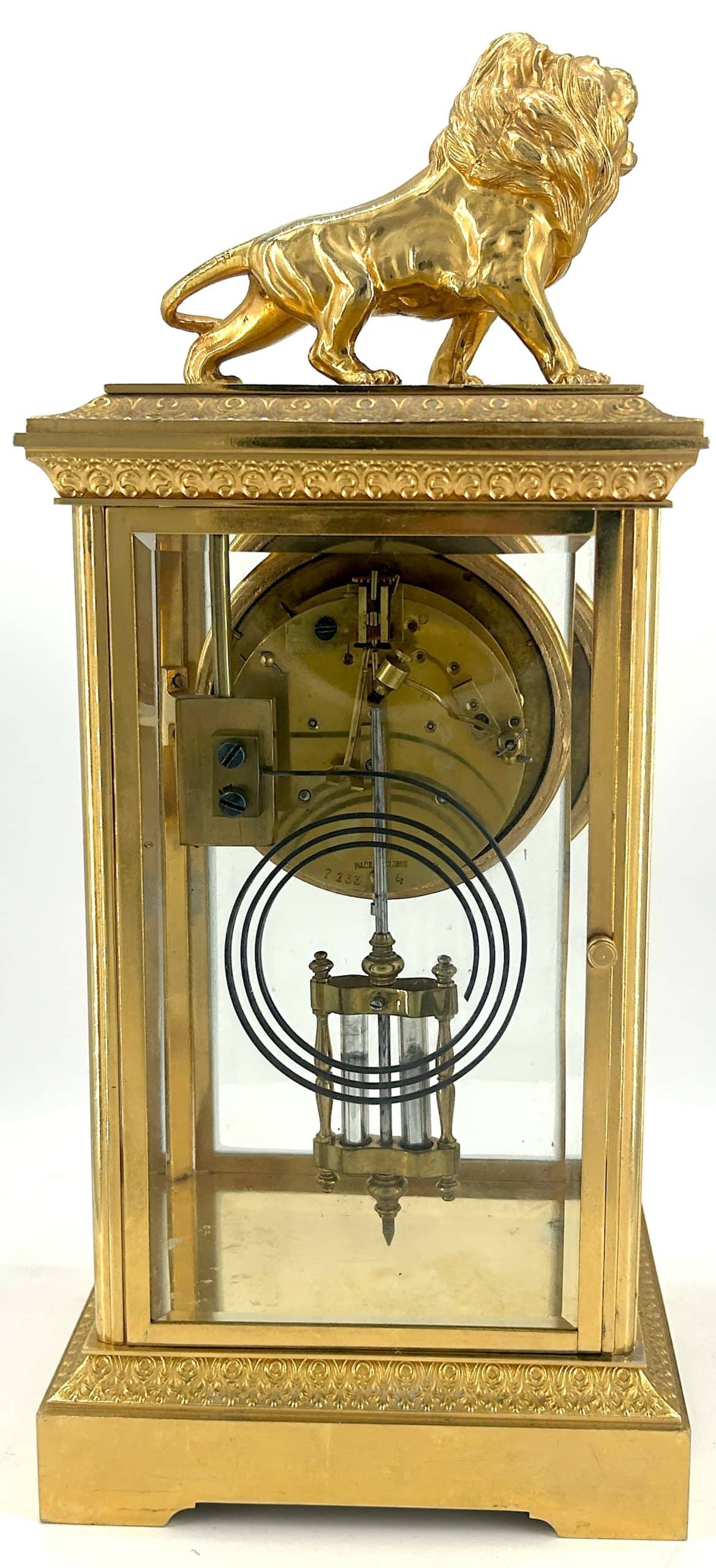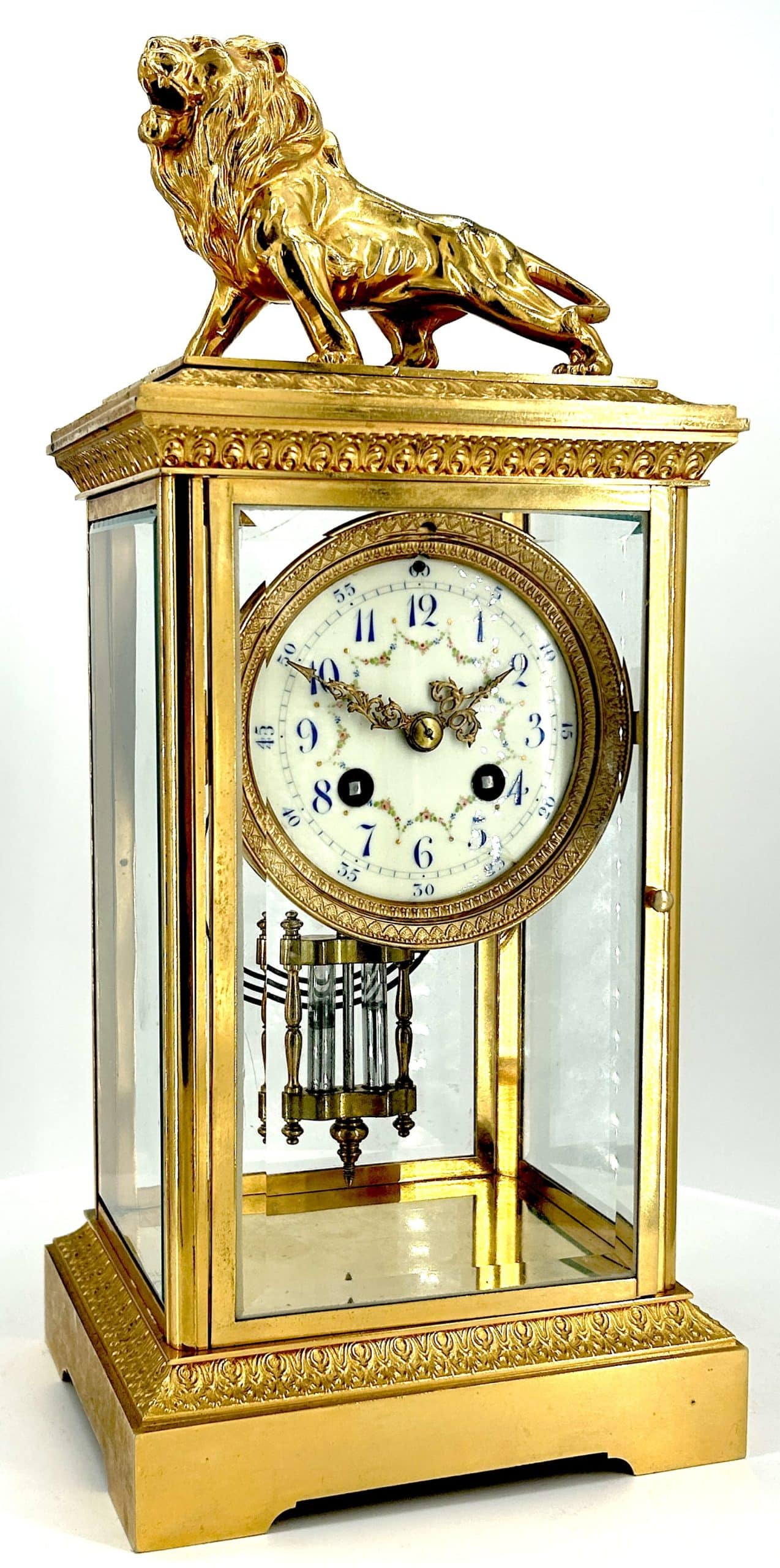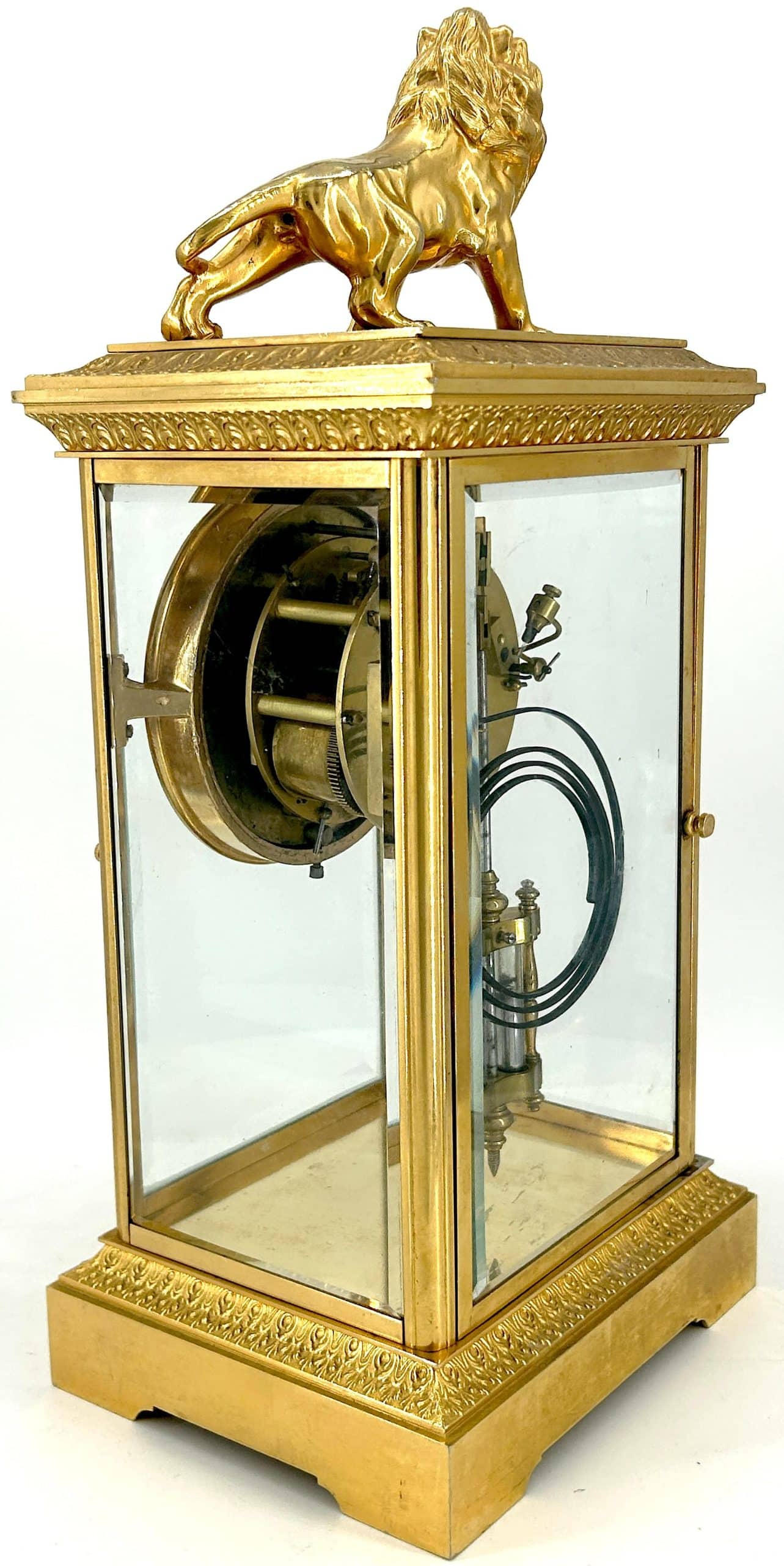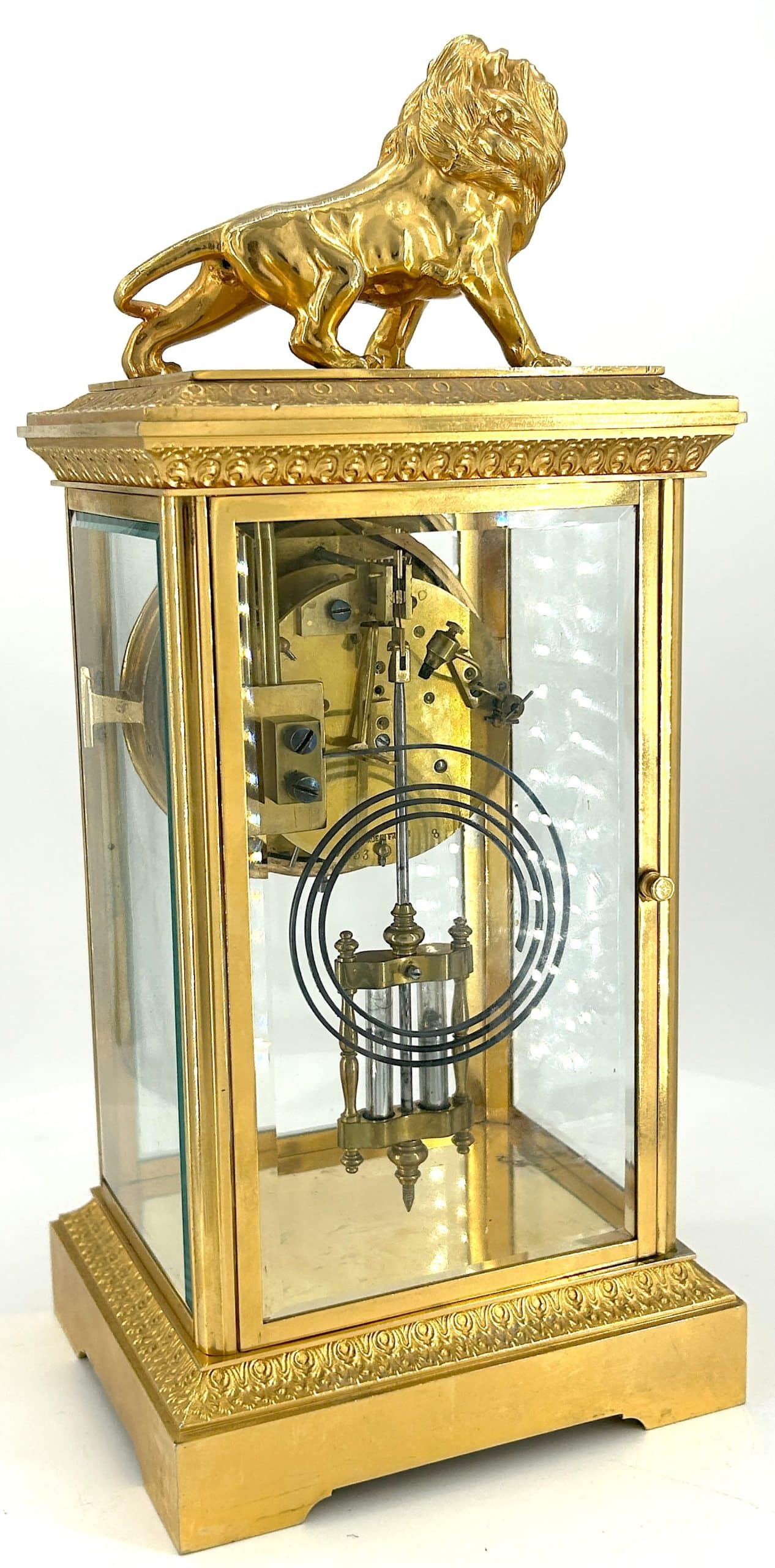 Amazing French Table Regulator mantle clock in a a bronze ormolu case with 4 glass panels topped with a bronze ormolu lion figure. French 8 day gong striking movement, fantastic collectors piece.