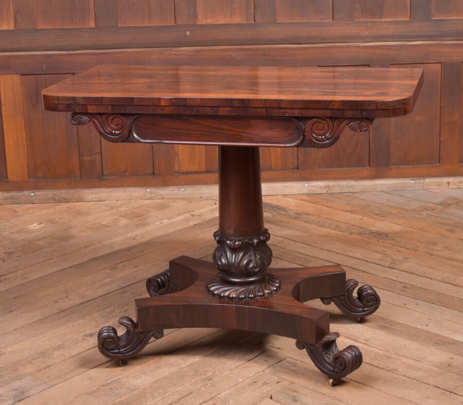 Fabulous quality Victorian card/ games table in stunning rosewood. It’s wonderful grained top rotates to reveal a hidden storage recess with plenty of room inside to store the cards, games, etc and folds over to reveal a green baize games surface. The baize is a bit worn and has some historical marks however this only adds to its charm. It’s beautifully carved frieze is supported on a beautifully turned column with carved base, finishing on a qua-trefoil base with carved scrolled feet with original castors. The superb quality and condition shows high craftsmanship and would look stunning in any home.