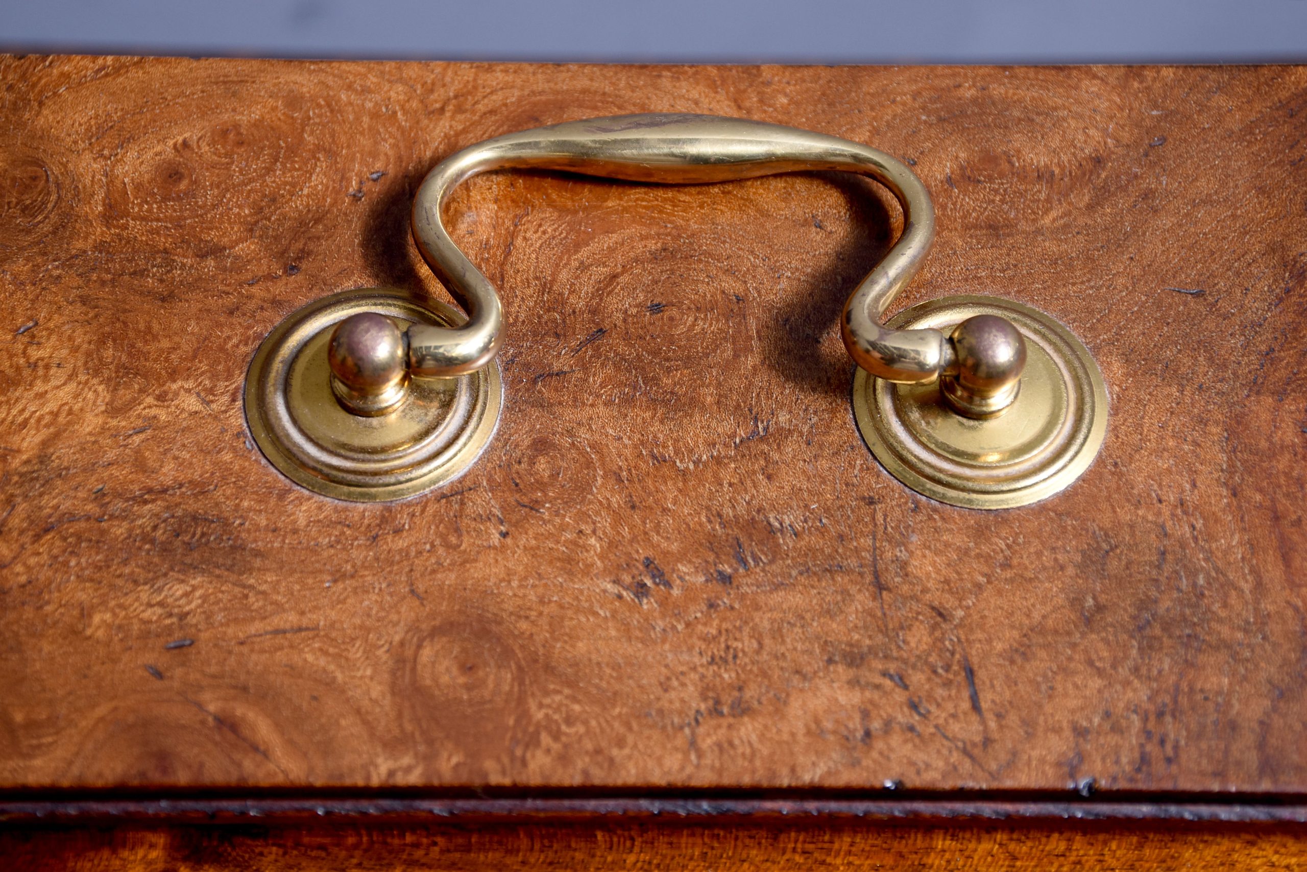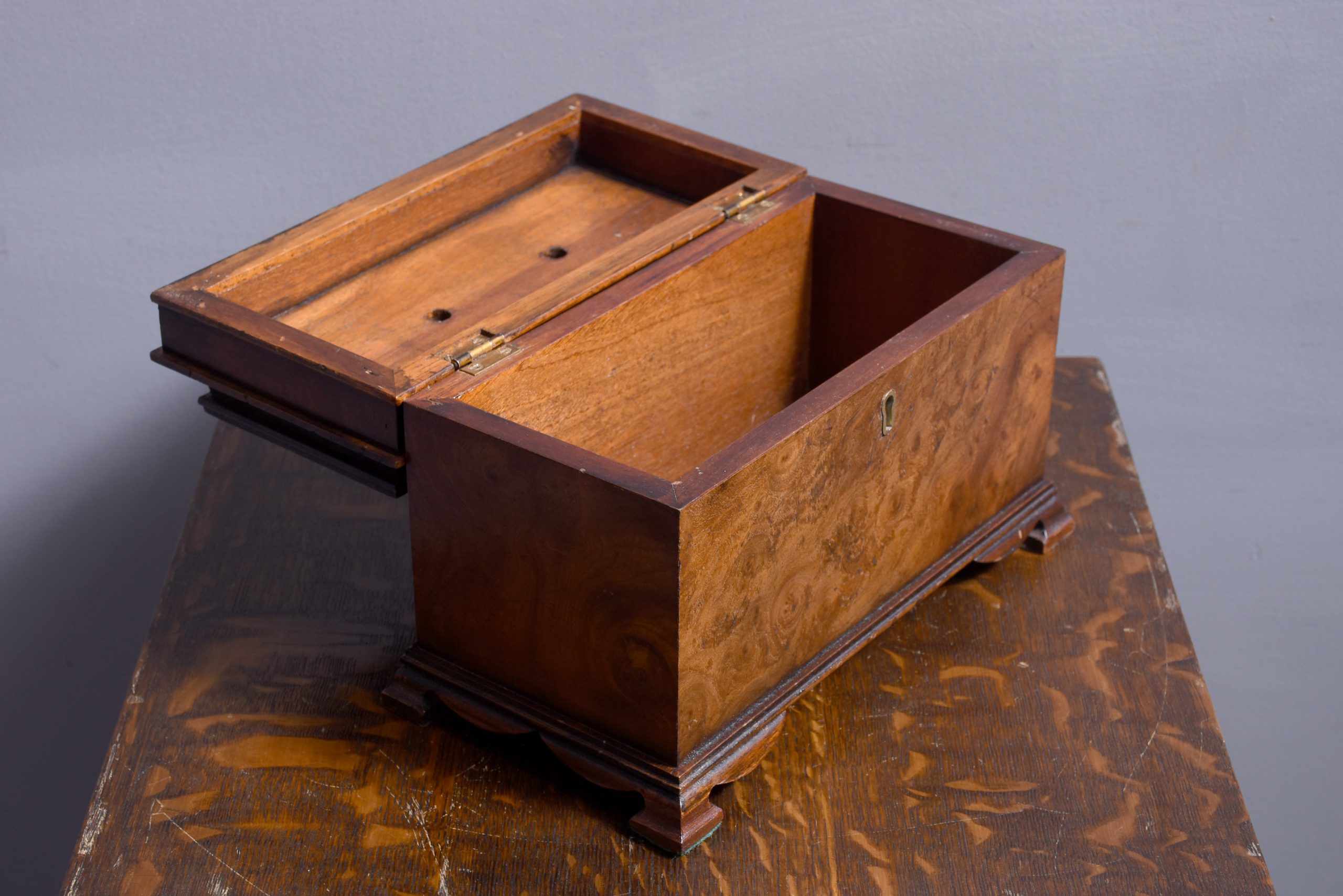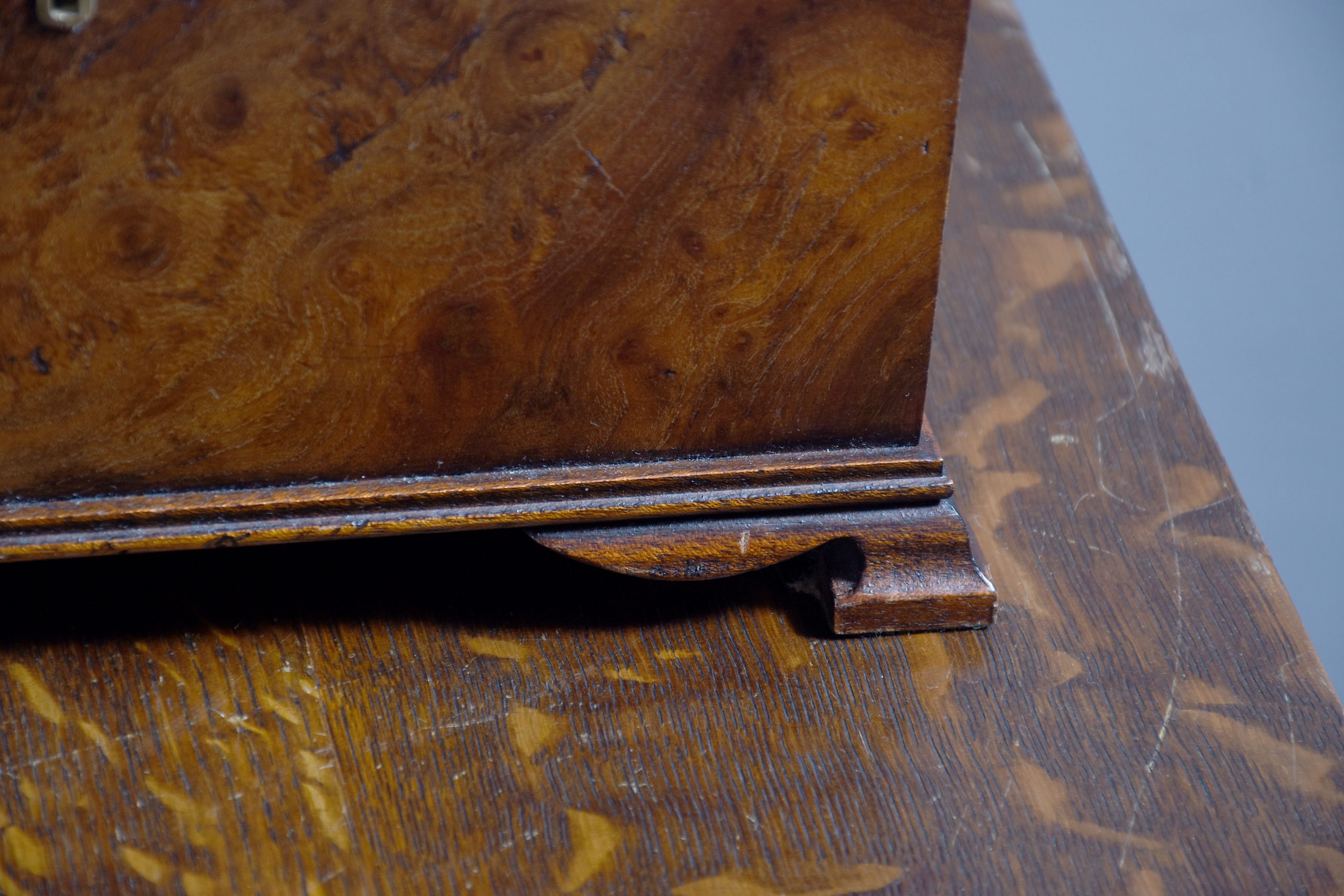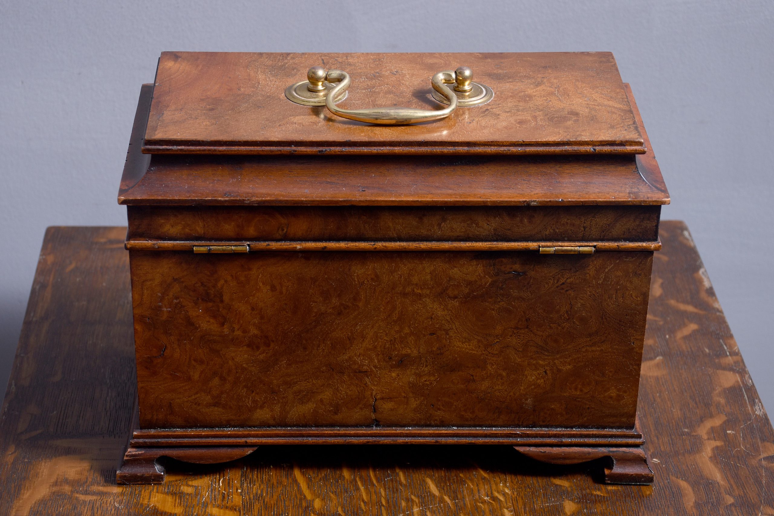 The sarcophagus shaped lid with swan-neck brass handle and beaded frieze opens to a simple interior. The front and side with figured and burr walnut veneers. All on a moulded base with shaped ogee bracket feet.