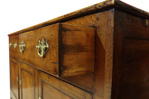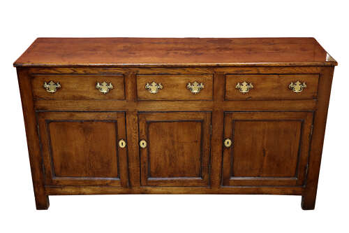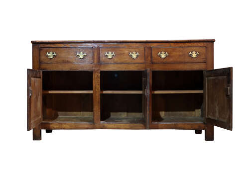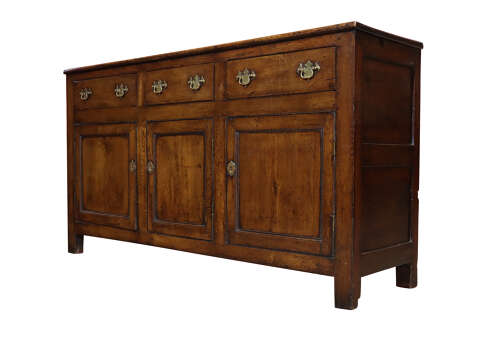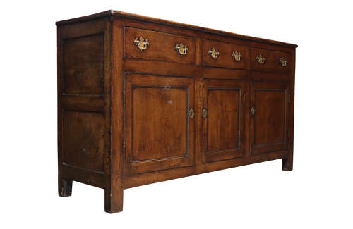 A superb 18th century oak dresser base of excellent colour and patination, fitted with three drawers above three panelled cupboard doors. The drawers retain later period-style brass handles, replaced in the late 18th century. With its well-proportioned form, original panelled sides, and wonderfully warm, rich surface, this is an exceptional example of rural Georgian cabinetry.