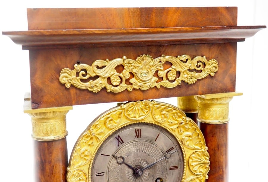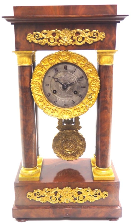 Fine Antique Flame Mahogany Mantel Clock French Striking Portico Mantle Clock