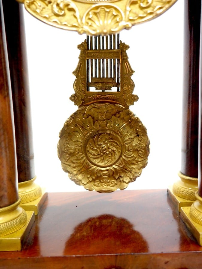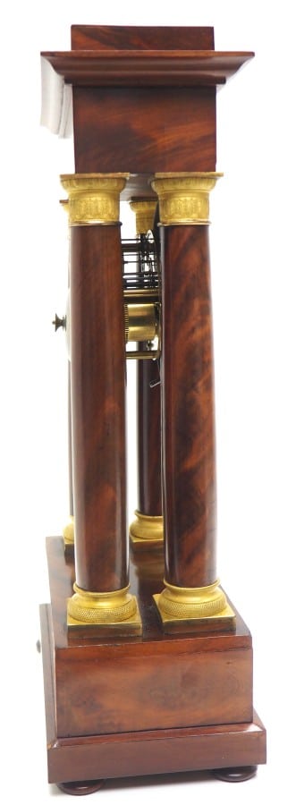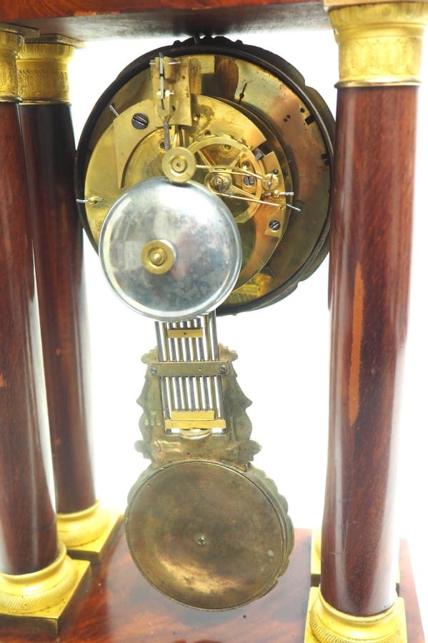 This is a lovely portico case, with fine ormolu capped 4 pillar supports with visible embossed brass pendulum. Wonderful large carved brass bezel this is an open bezel. Standing on fine turned bun feet and lovely hand cut ormolu mounts.
