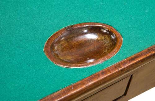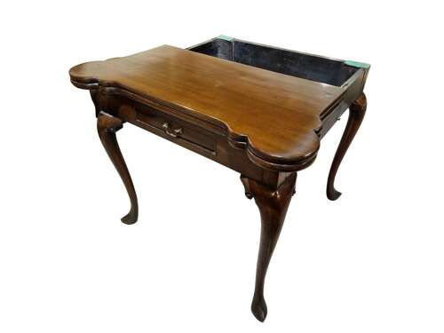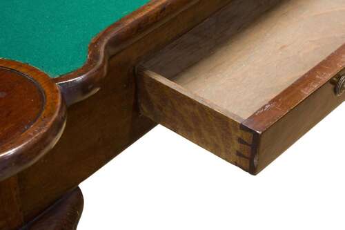 The table is fitted with a useful drawer to the frieze and retains its original concertina-action mechanism, allowing the rear leg to swing out smoothly to support the open top. The shaped top with rounded corners is both elegant and practical, offering generous playing space.
