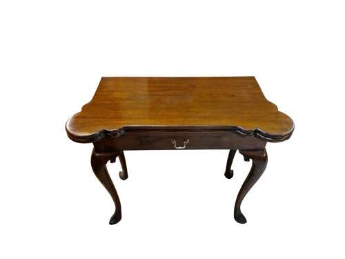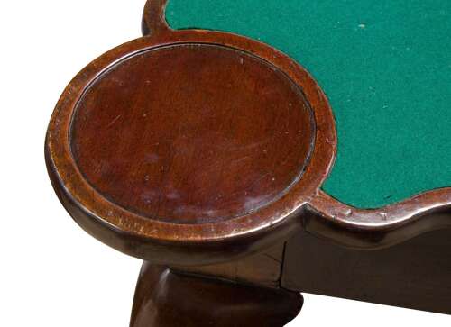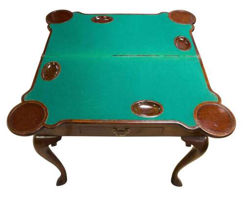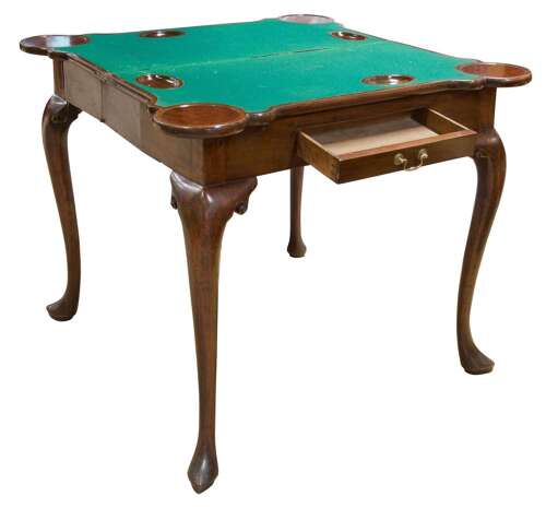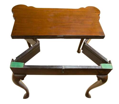 A fine mid-18th century George II mahogany concertina action card table, circa 1750. The well-figured folding top opens to reveal a baize-lined playing surface with shaped corners and integrated dished recesses for counters and coins.