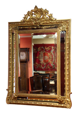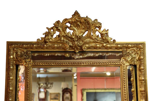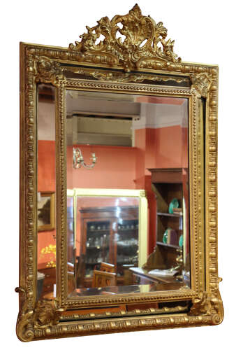 A striking late 19th century French giltwood mirror of elegant rectangular form, richly adorned with an elaborate pierced crest featuring scrolling acanthus foliage and classical ornament.