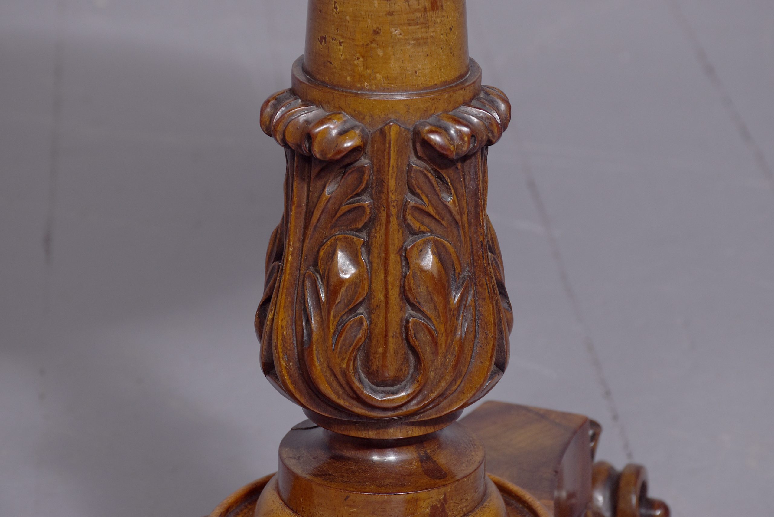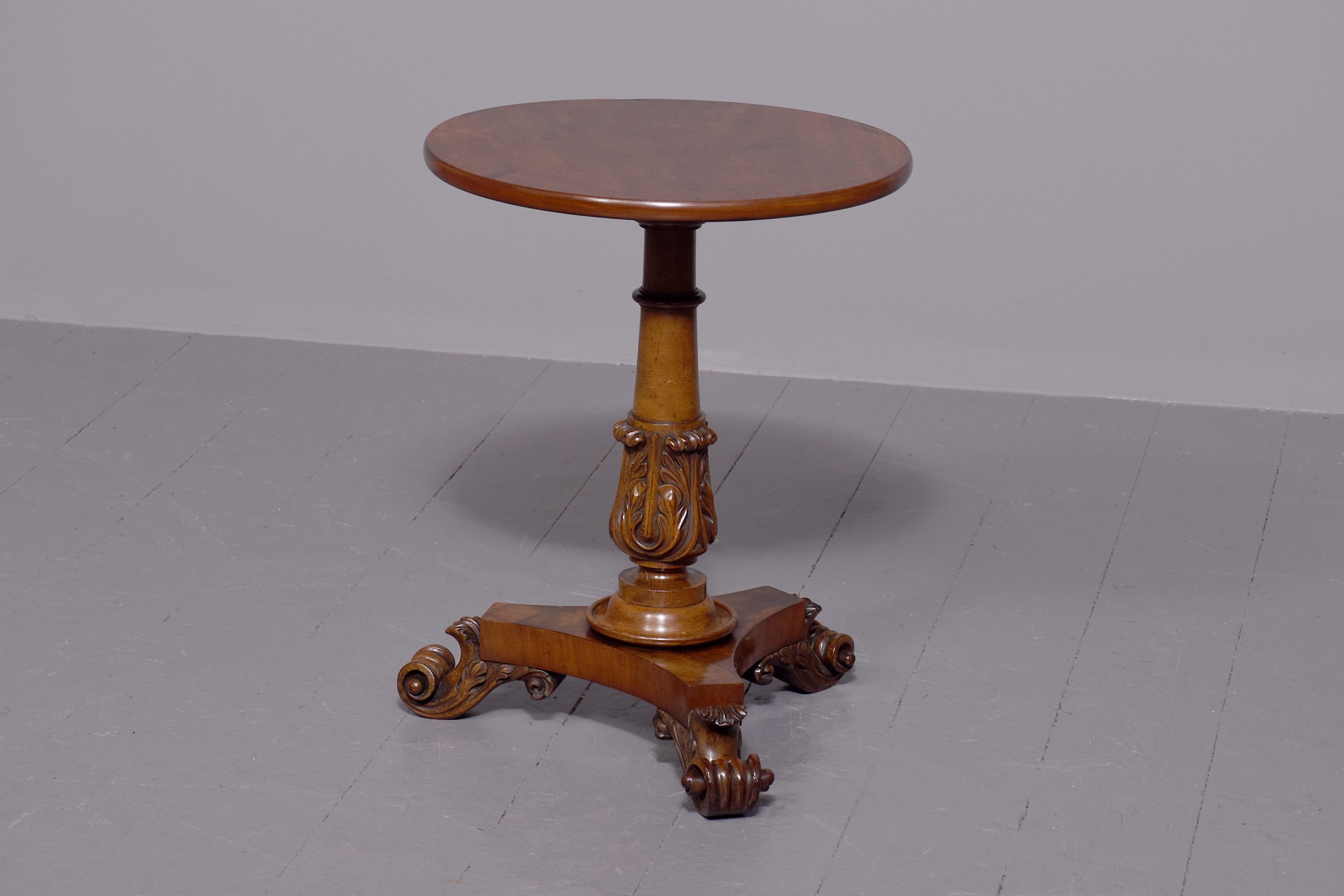 Circa 1830 with alterations. Fine quality carved mahogany William 4th wine table. The circular top with a mellow colour and nice figuring over a tapering acanthus carved stem with a turned collar above a flame mahogany tripartite base with elaborate acanthus carved scrolled feet. Fine quality functional item in pristine condition.