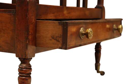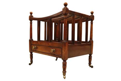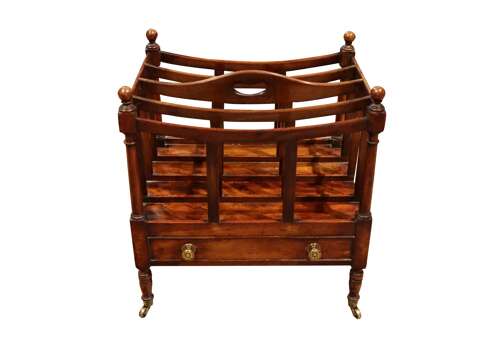 A good quality Regency period mahogany Canterbury of elegant and practical form, dating to circa 1825. The piece is raised on turned supports terminating in its original brass castors, allowing for easy movement, and retains a useful frieze drawer fitted with original turned brass handles.