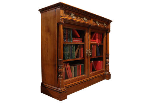 The bookcase is framed by turned and reeded architectural columns and stands on a solid plinth base. The walnut timber has a warm, rich colour with a well-preserved patina.