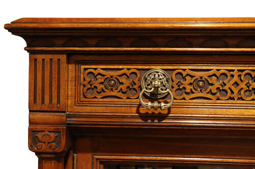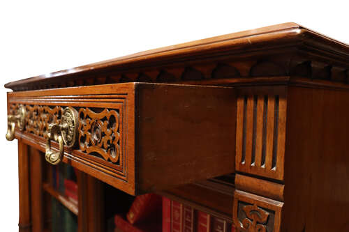 The upper section features two beautifully carved frieze drawers, each with pierced foliate panels and bold brass ring handles — a classic Gillow detail rarely found on bookcases of this size. The drawers are hand-dovetailed and run smoothly, offering discreet storage above the glazed cabinet.