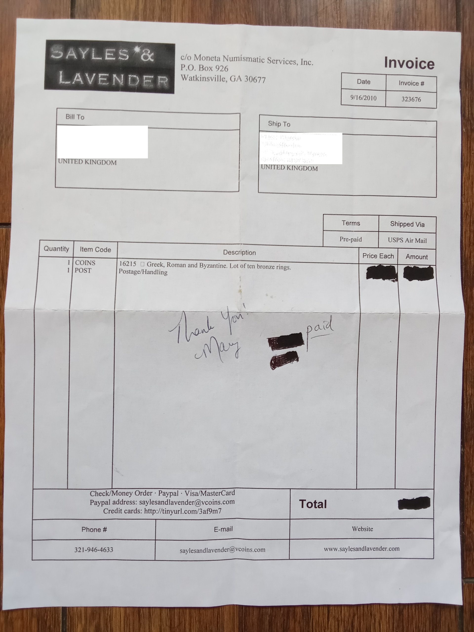 These are straight out of a private collection and come with the original receipt from the US based COIN dealers Sayles & Lavender from their antiquities department Moneta Numismatic Services Inc. (as stated at the top of the receipt).