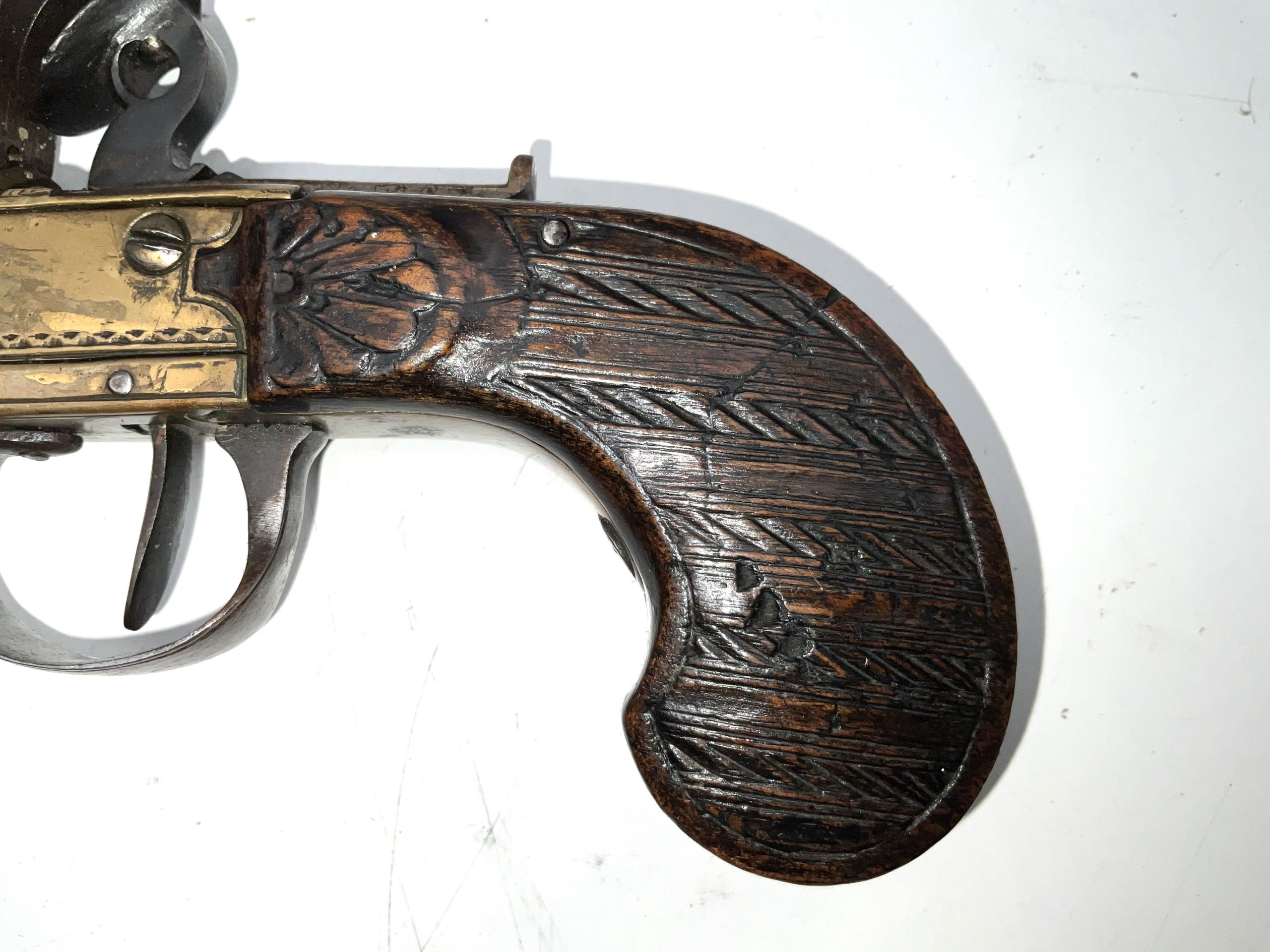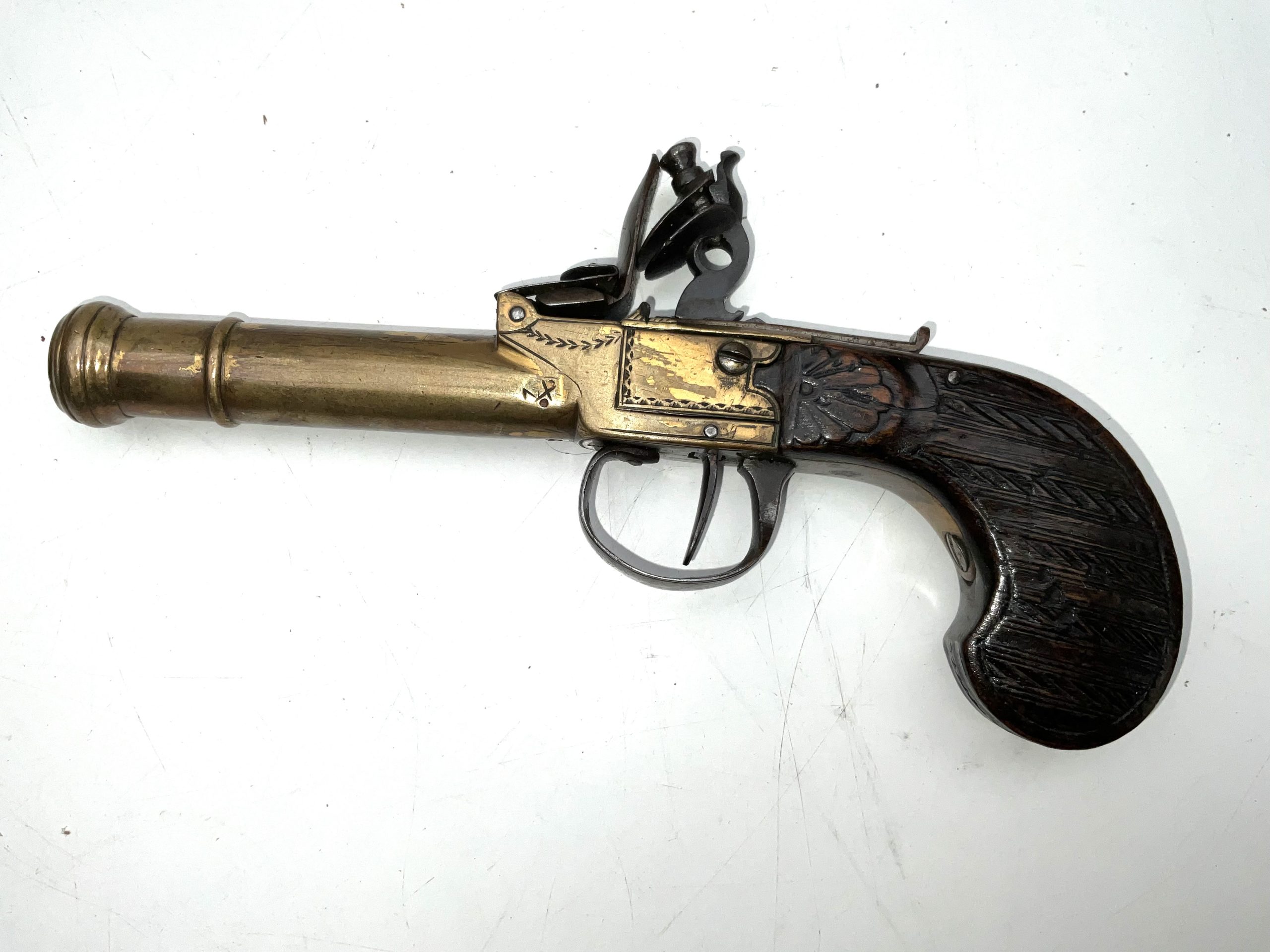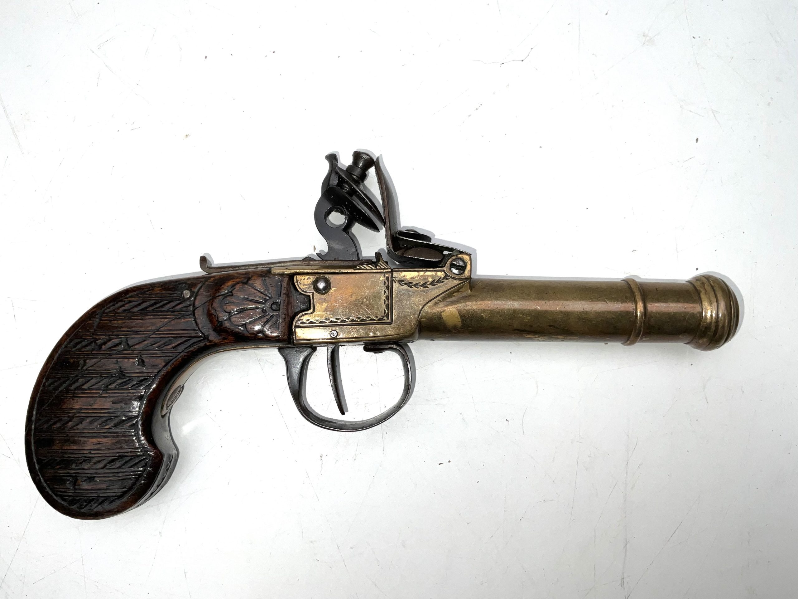 Early 18th century, in good working order and condition 10mm bore working safety on half and full cock, superb carved walnut grip having overall length of 20 cm heights 11 cm depth being 28 mm, offering free UK delivery reference DBSS Tel: +44 7505 165 843 We accept online payments for all our items listed: Bank transfer cash on collection or if wishing over the phone using your debit or credit cards, also doing layby payments plan, or email giving your address details & contact number and we shall send you your items invoice to make payment with your card. Send your request to – john.strong2@gmail.com