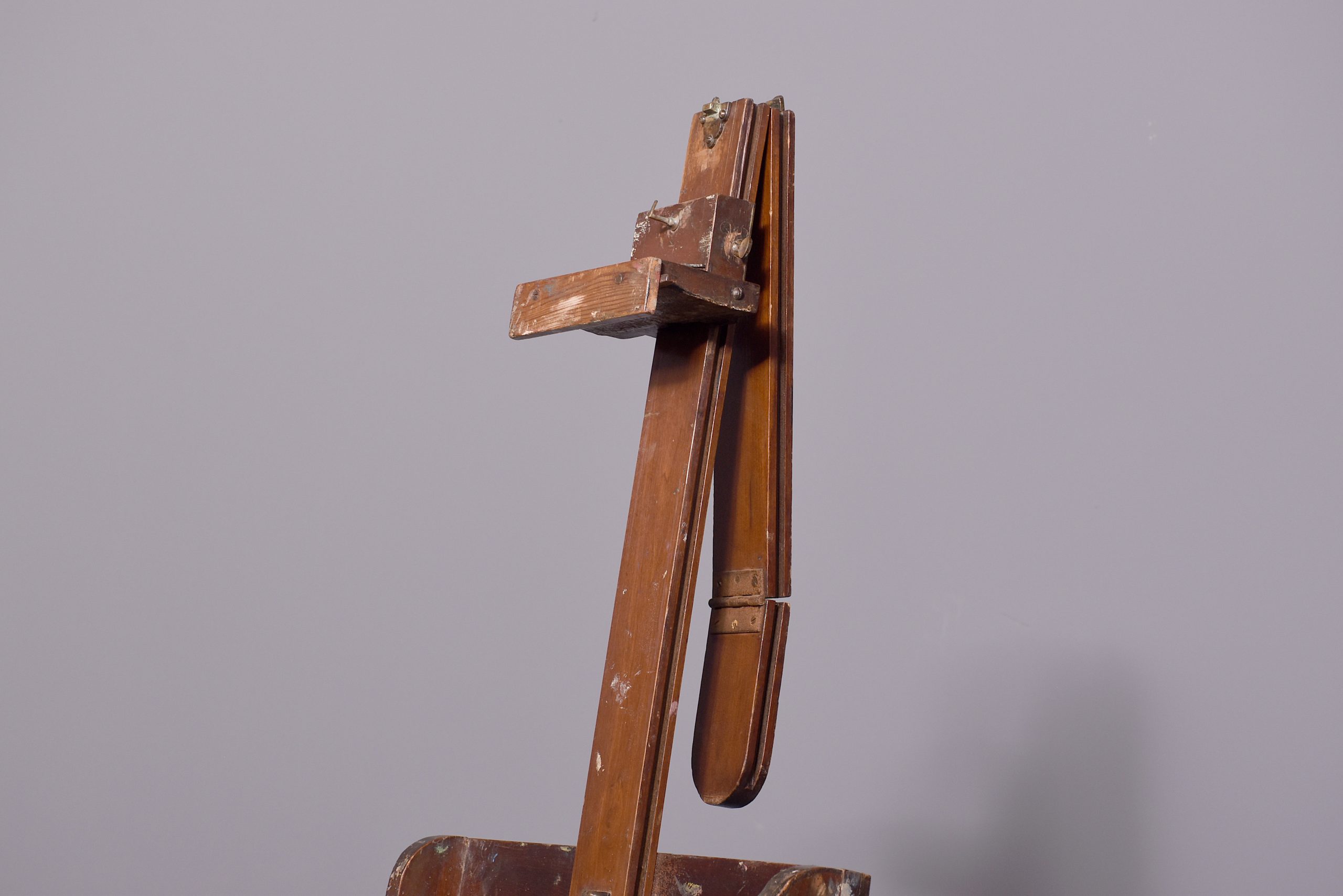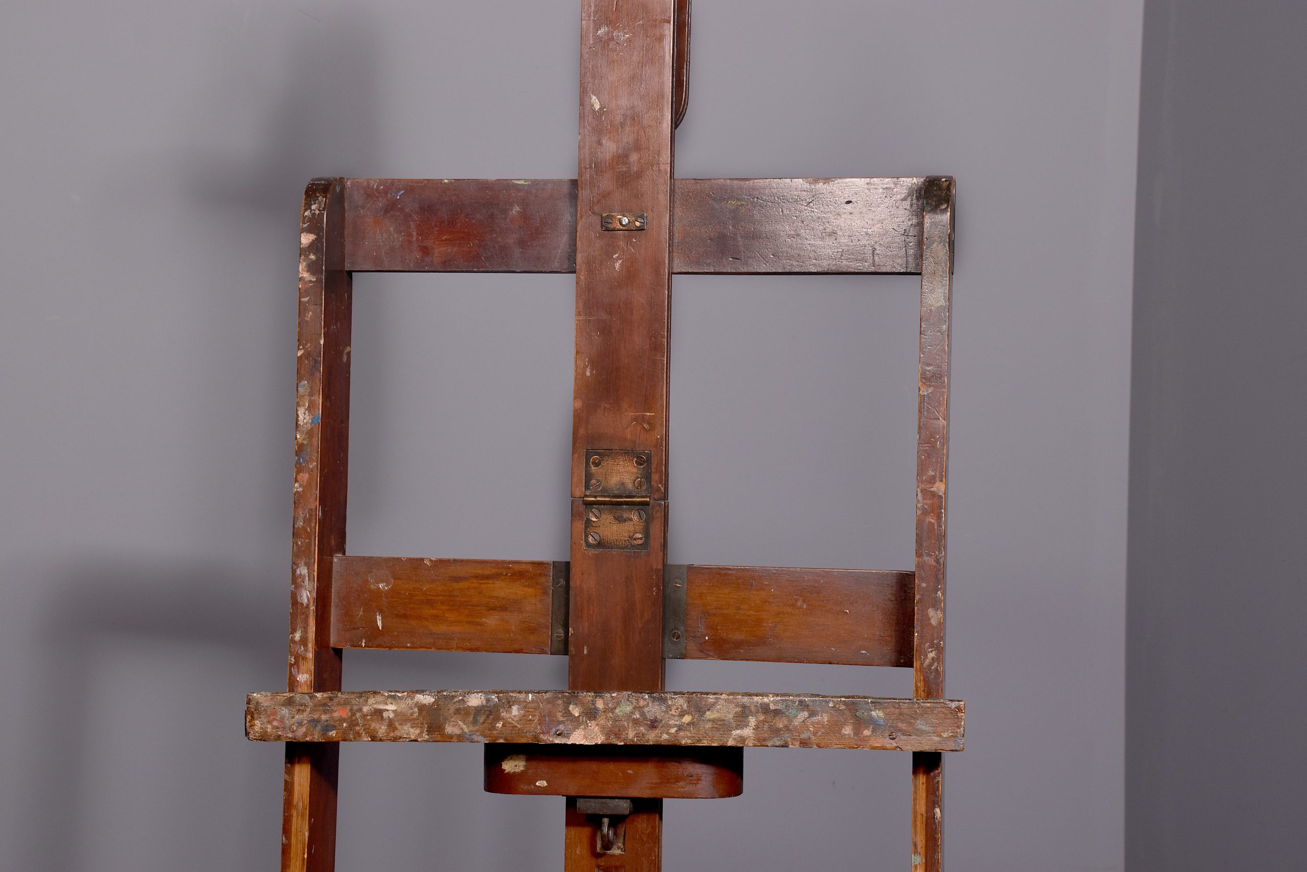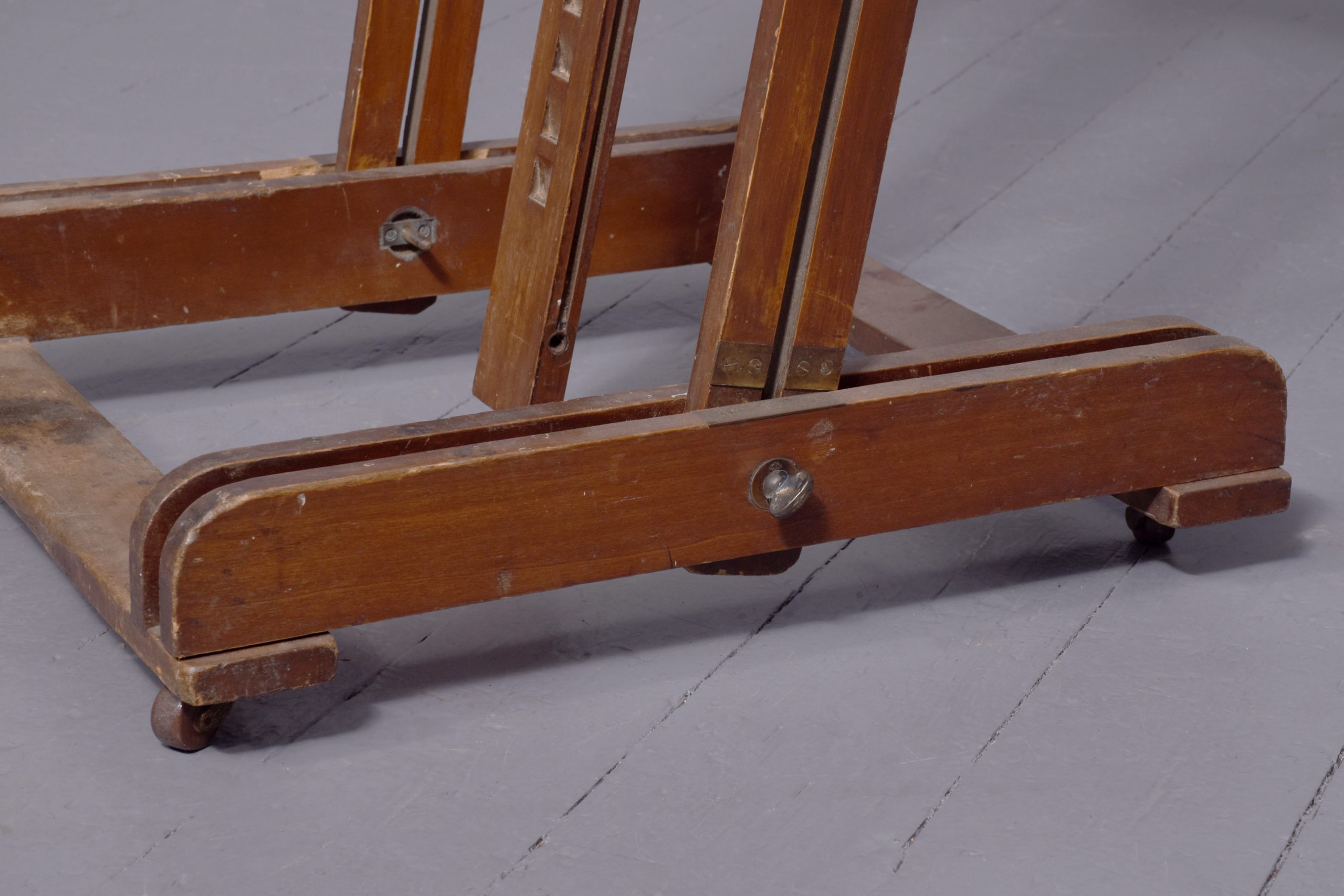 Circa 1900. A stained beech and mahogany folding artist’s easel by ‘L.K.W Crowley’, with a simple shaft which is adjustable, the rise and fall sections are on a folding mechanism, the top with a bracket for holding the painting in place, the bottom with a large flat section on a ratchet for adjusting, with brass hinges and runners. The two uprights are held in place by butterfly nuts in the low base, the easel can be folded up to a neat size.
