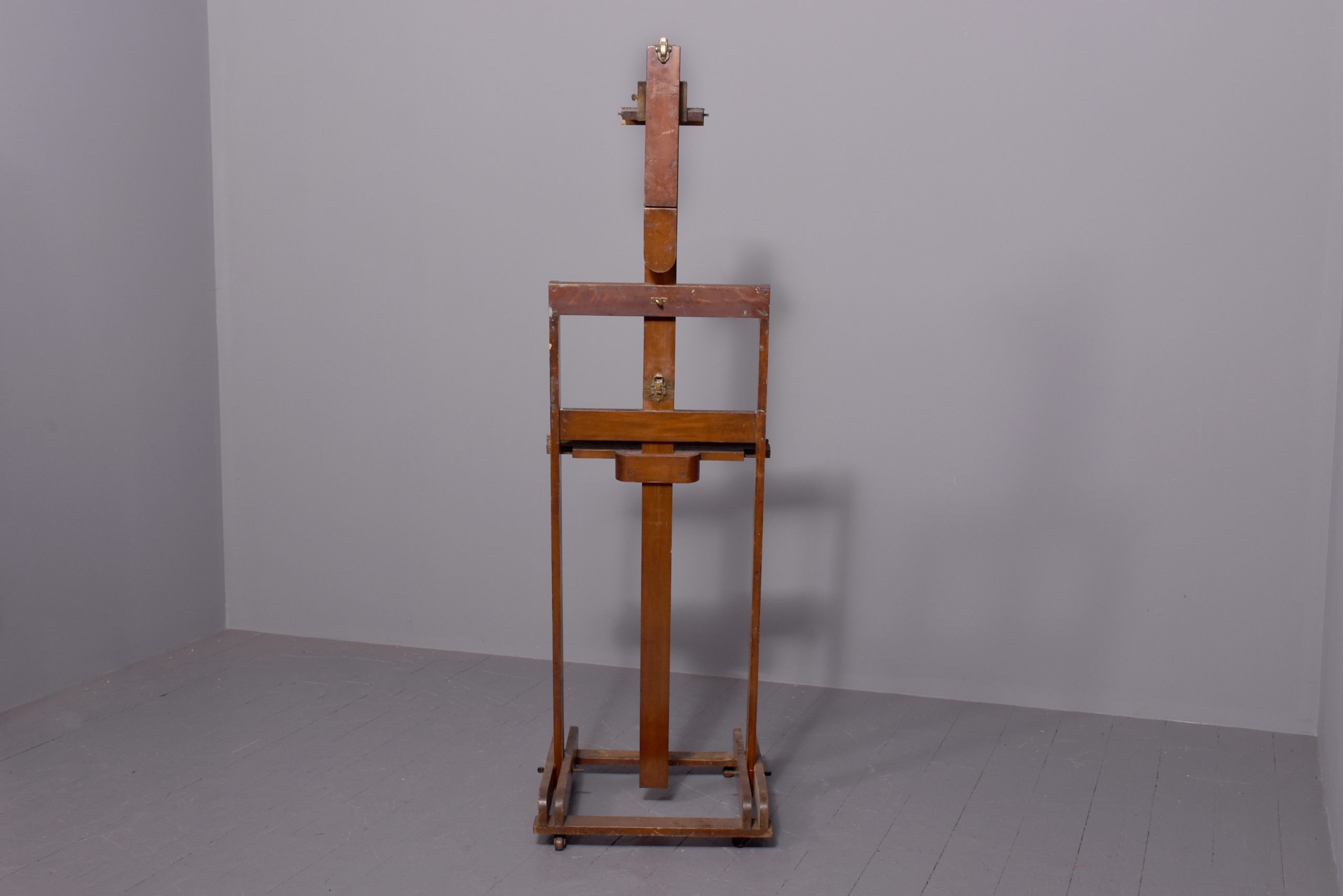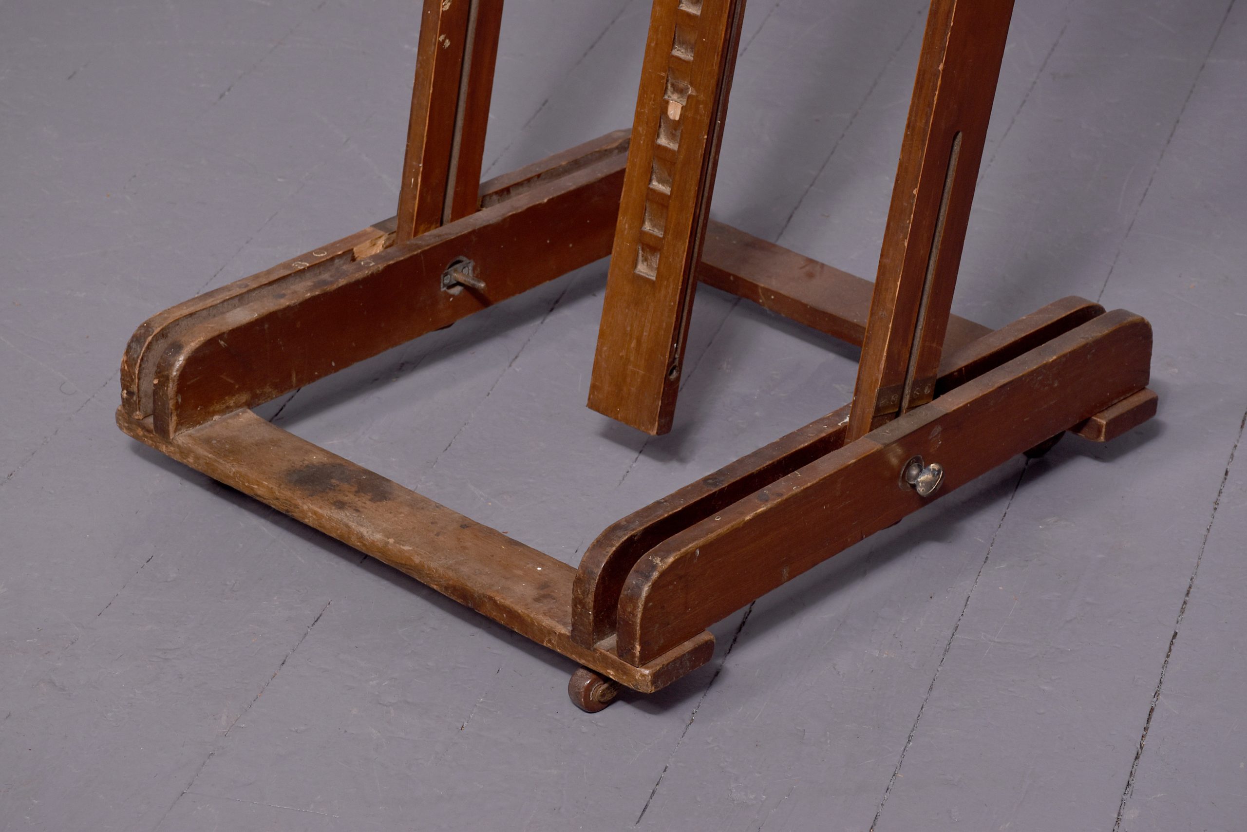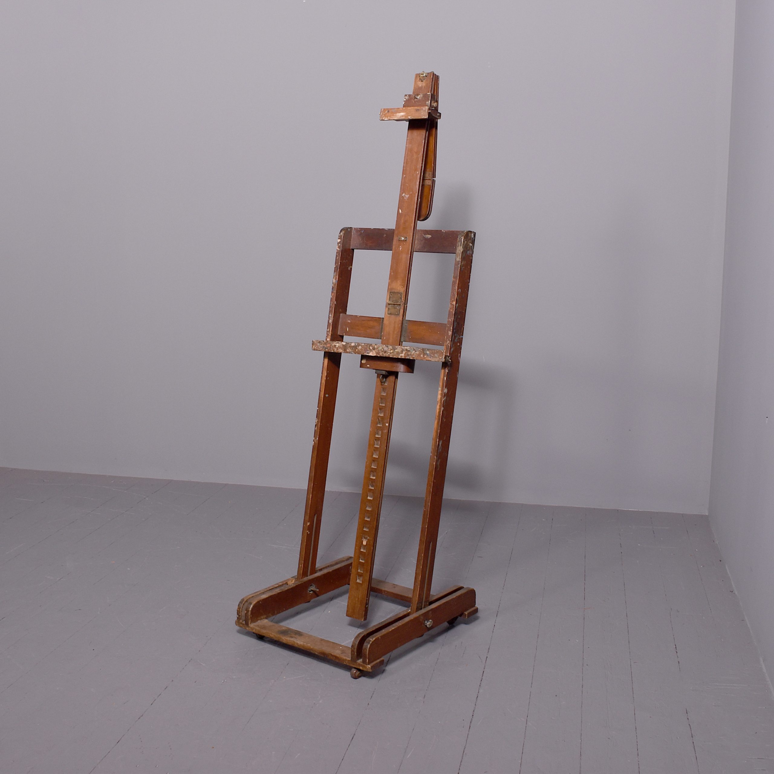 Circa 1900. A stained beech and mahogany folding artist’s easel by ‘L.K.W Crowley’, with a simple shaft which is adjustable, the rise and fall sections are on a folding mechanism, the top with a bracket for holding the painting in place, the bottom with a large flat section on a ratchet for adjusting, with brass hinges and runners. The two uprights are held in place by butterfly nuts in the low base, the easel can be folded up to a neat size.