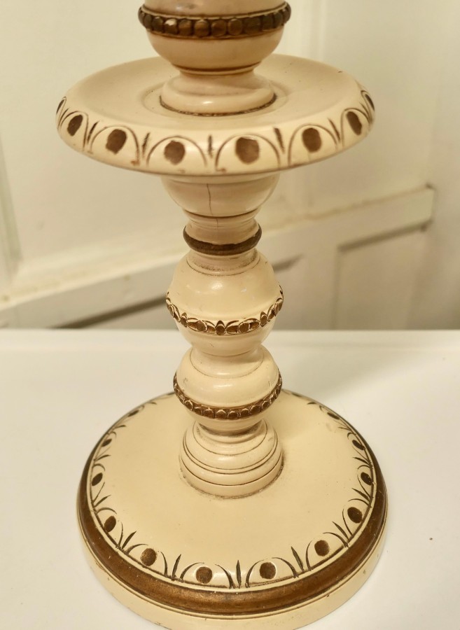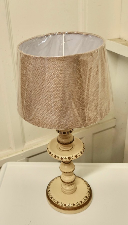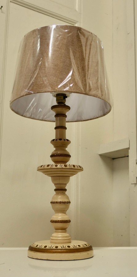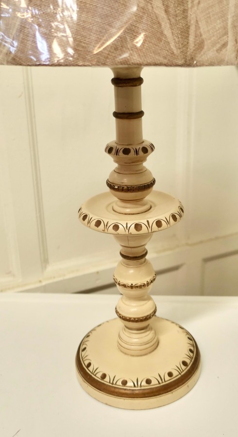 Folk Art Style carved and painted table lamp. This lamp has a carved decoration painted in cream with gold highlights, the lamp comes with a new coarse linen lamp shade. The lamp is 25” high with the shade which is 11” in diameter. THM157. Manufacture Date : 1960 Materials : Softwood