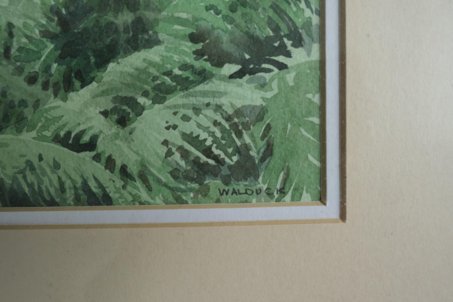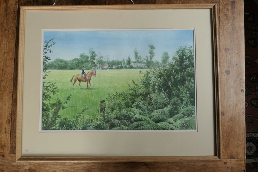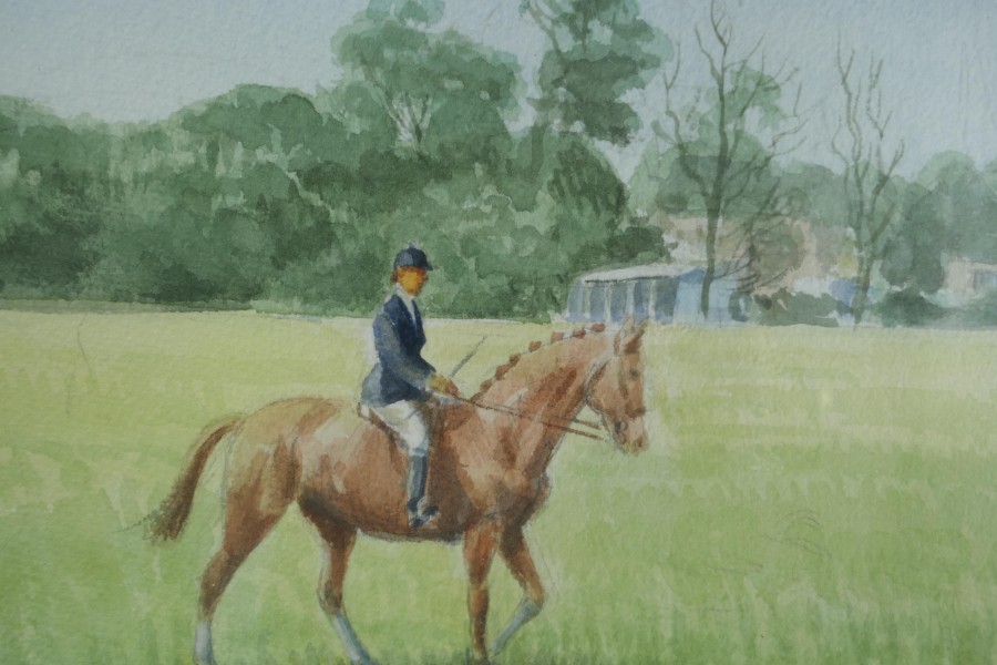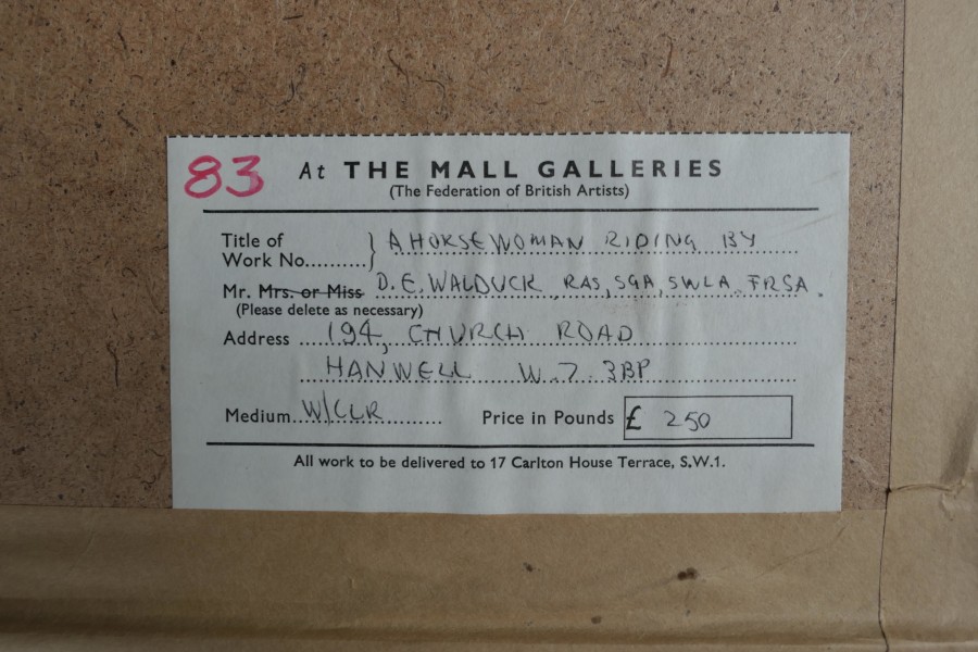 Framed and Glazed Ink and Watercolour by Desmond Walduck Desmond Walduck is a comic book artist known for his work on Dan Dare 1920-1995 This painting is of A Horse Woman Riding By it is set in a moulded wooden, the painting is signed WALDUCK and has a Certificate of Authenticity on the back The frame is 21” x 28” SW21 Manufacture Date : 1985 Materials : Paper
