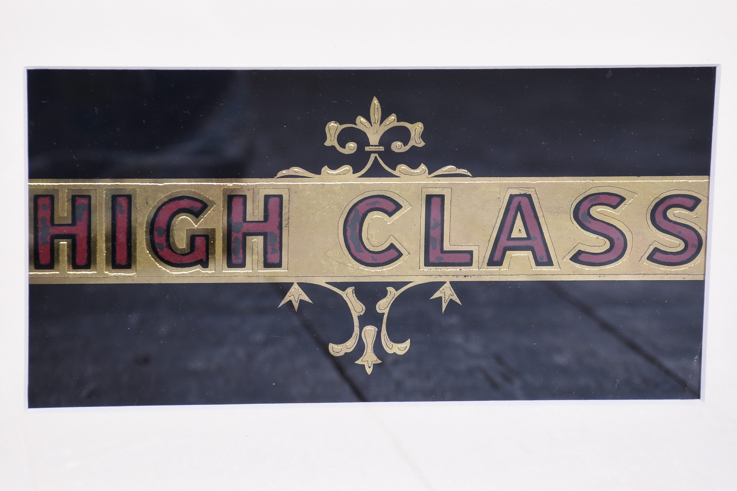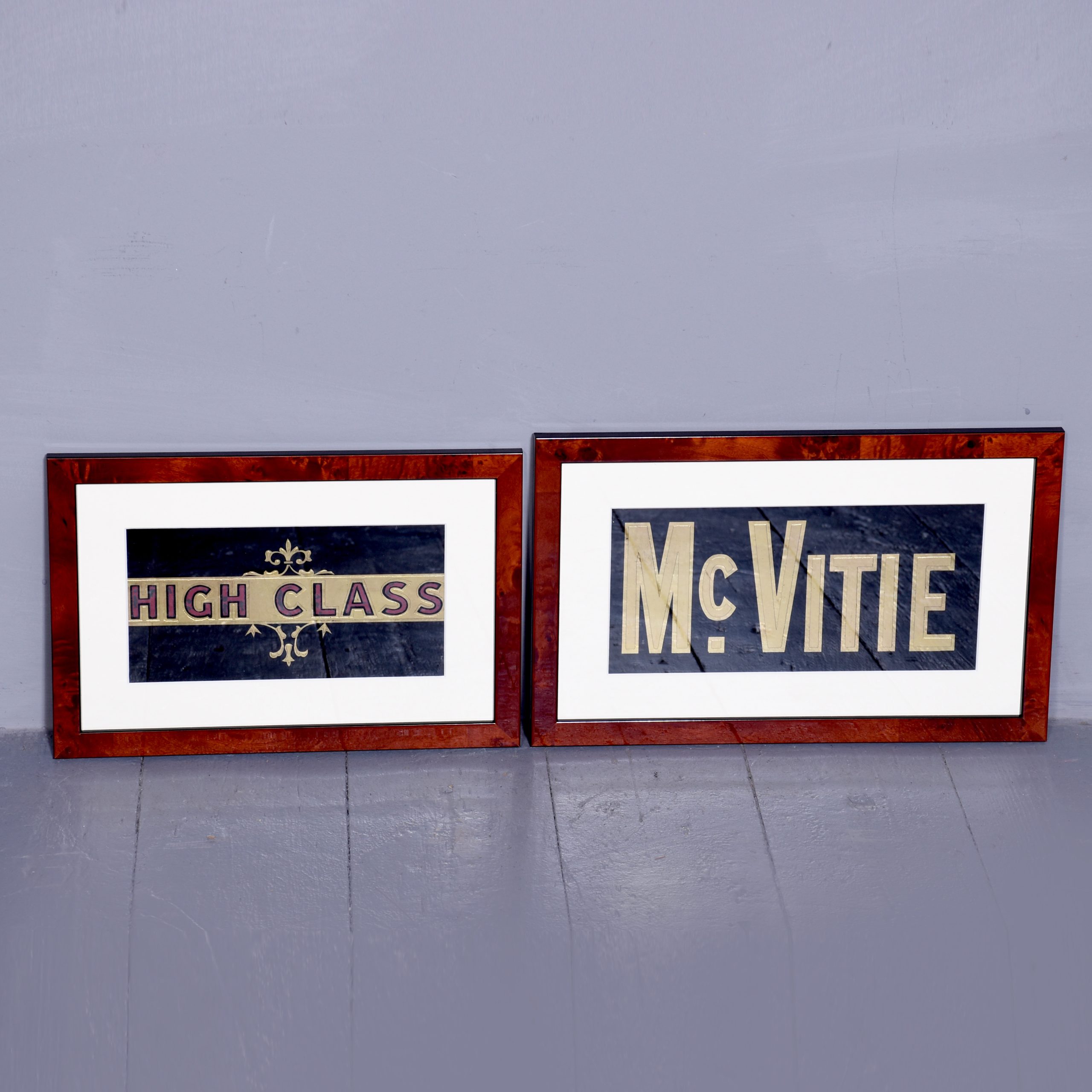 Circa 1870. A framed fragment of advertising for ‘McVitie’, the reverse painted glass with etched glass and gold leaf, on a black background, mounted and framed in a burr wood frame.