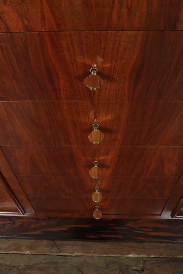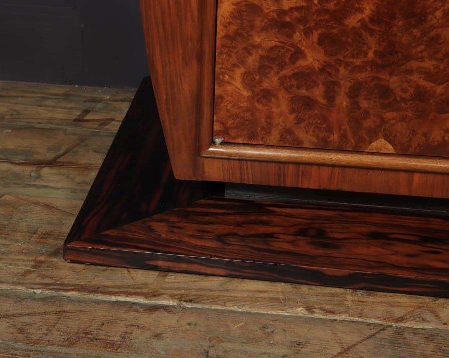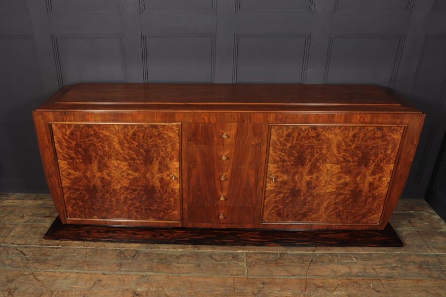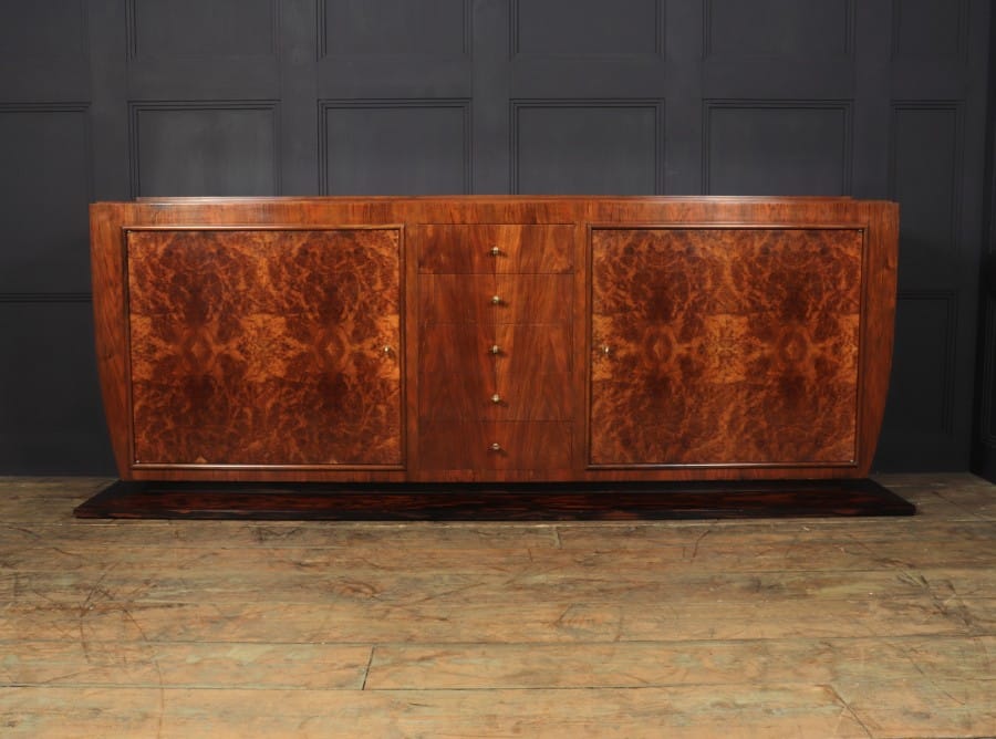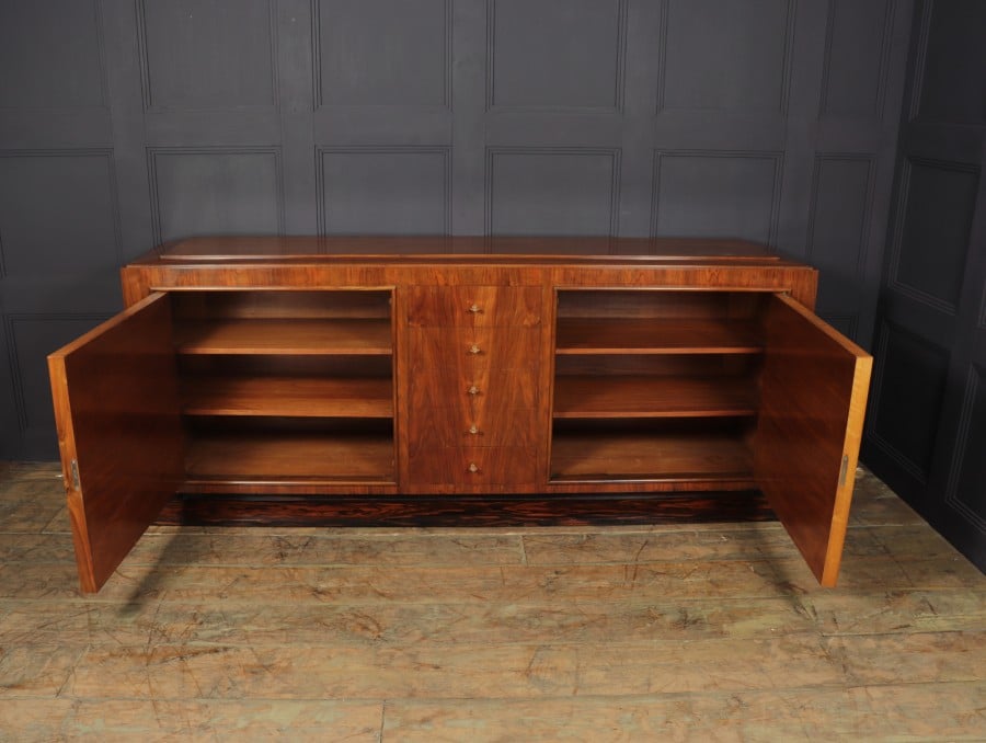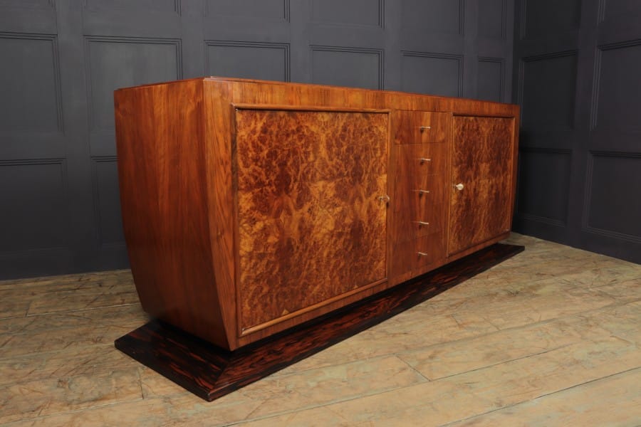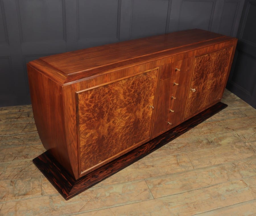 A large French Art Deco sideboard, produced in walnut with burr walnut on the doors and crown cut Macassar ebony on the base. There are five central lockable drawers and two large doors with shelves behind, the sideboard has been fully hand polished and is in excellent condition throughout.