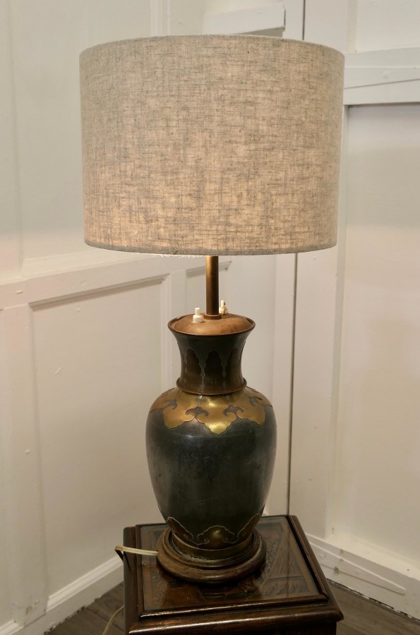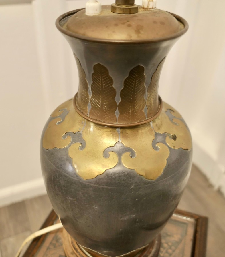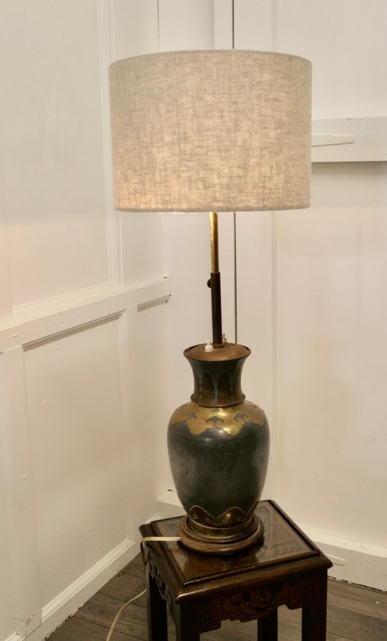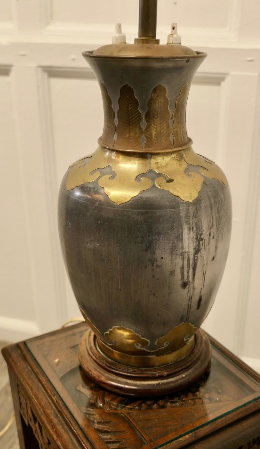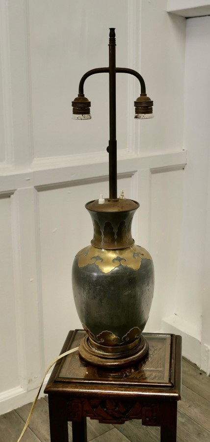 French Arts %26 Crafts adjustable brass and pewter table lamp. This is a large piece it has twin lamps which are separately switched and are height adjustable together. A superb bulbous and very stylish base made in brass and grey metal which looks like pewter. The lamp is in good condition, working and is shown with a used lampshade, this can be included if requested The lamp is 25” up to 31” high. GF76 Manufacture Date : 1920 Materials : Brass