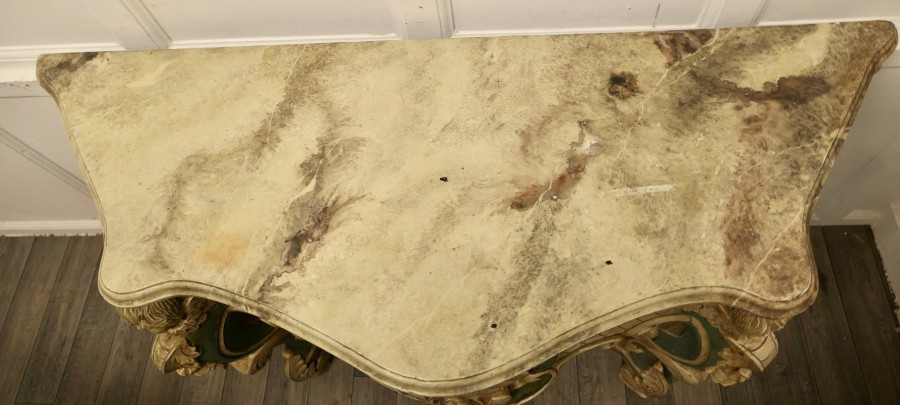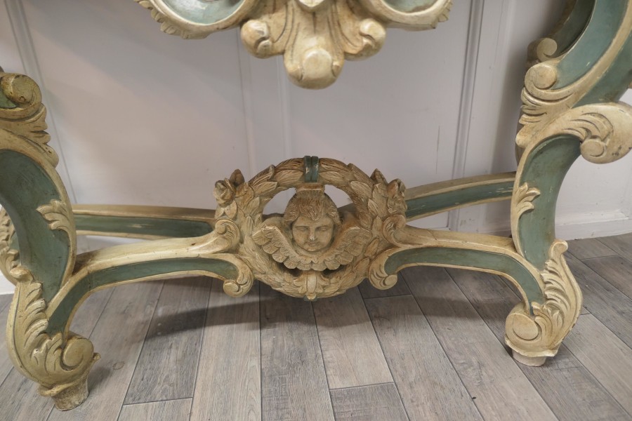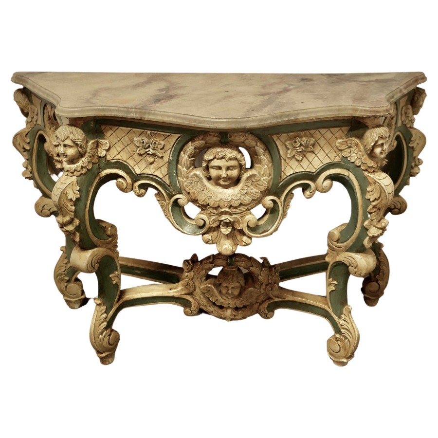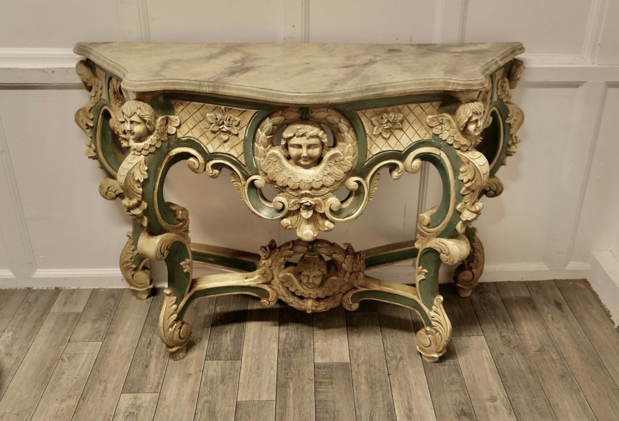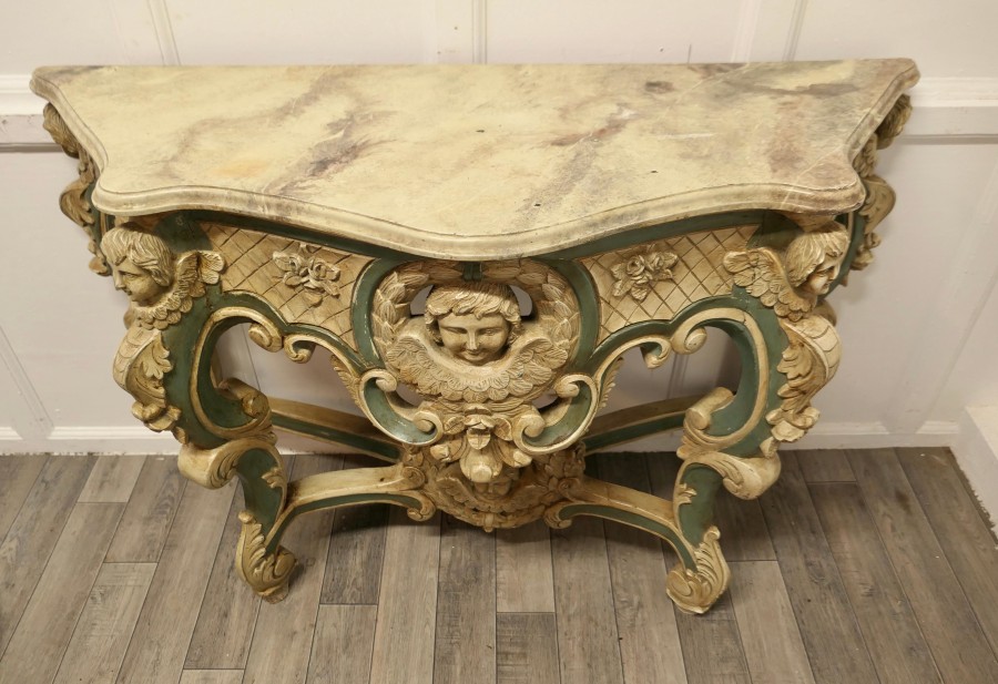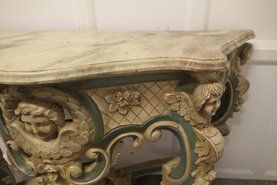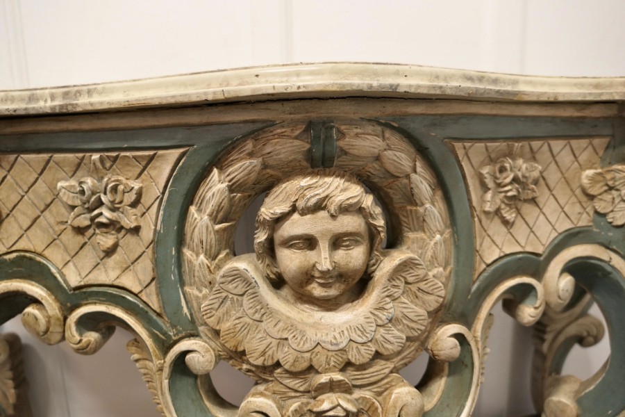 French Baroque console table, carved and painted with the faces of angels This is a very attractive piece, the table is hand carved with bold figural, scroll and shell decoration, it has a scalloped bow fronted shape with a moulded edge to the simulated marble top and an elaborate crossing stretcher beneath The table is sturdy and the decorative carvings are seen in fine detail, they are in an Ivory colour with a blue green detail to the legs and stretcher The table is 32” high, 50” wide at the back and 18 deep JK210. Manufacture Date : 1860 Materials : Paint