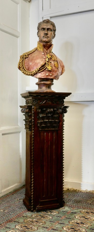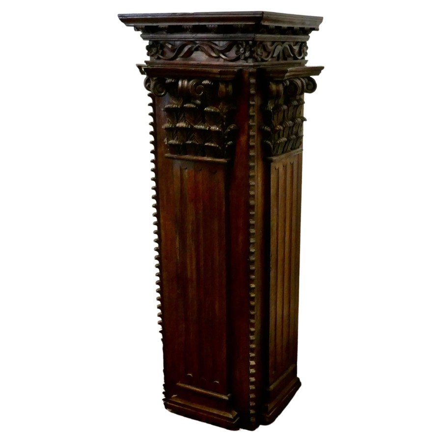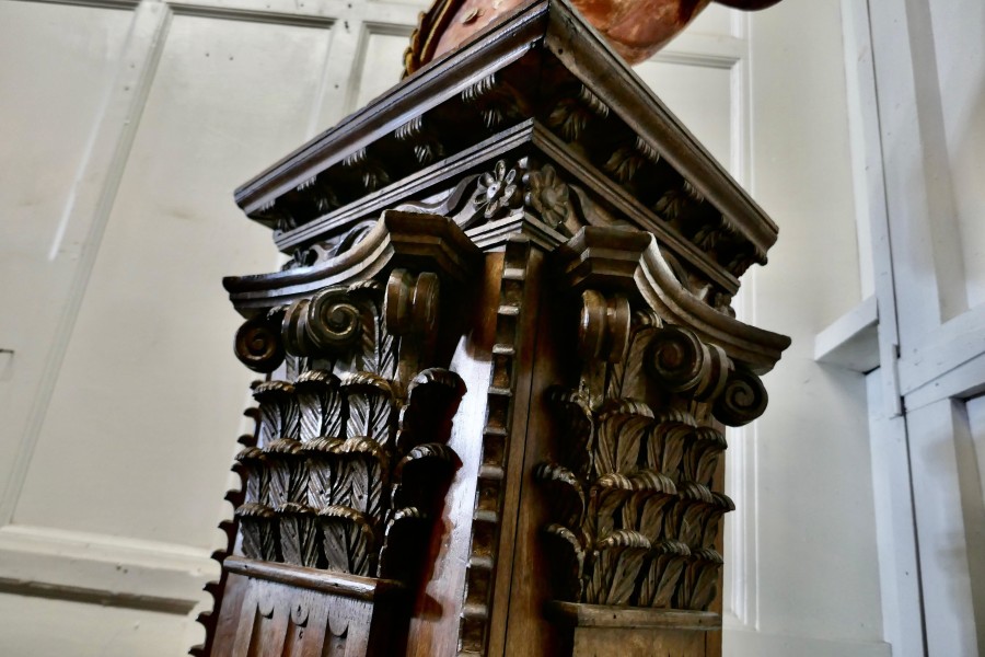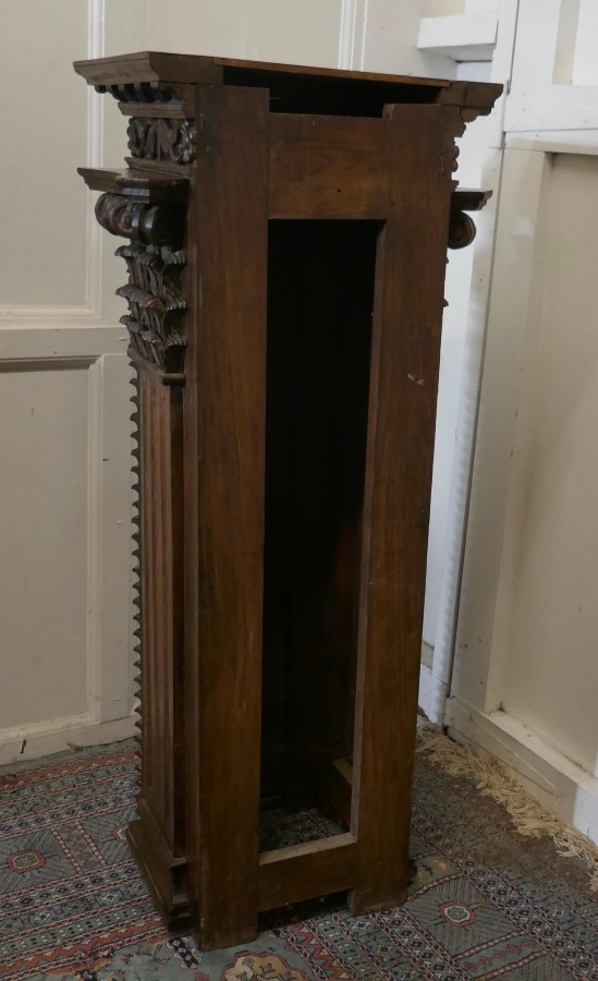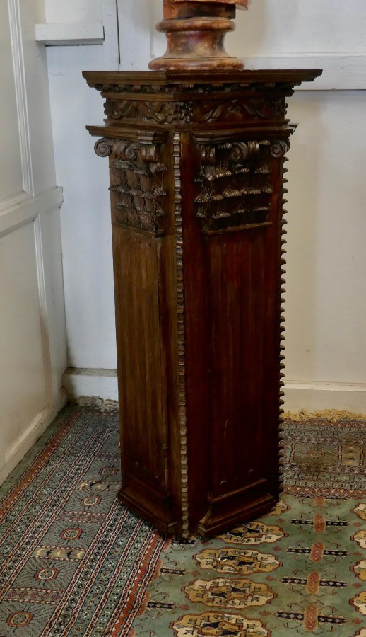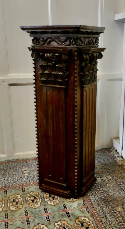 French carved oak column display pedestal The pedestal is square in shape, the top has a 14” x 17” plinth so it is ideal to display a large ornament or similar The front and sides of the column have linenfold carving and nearer to the top they are very decoratively carved with feathers in the gothic style The Plinth is 44” high, 20” wide and 15” deep TNV248. Manufacture Date : 1850 Materials : Oak