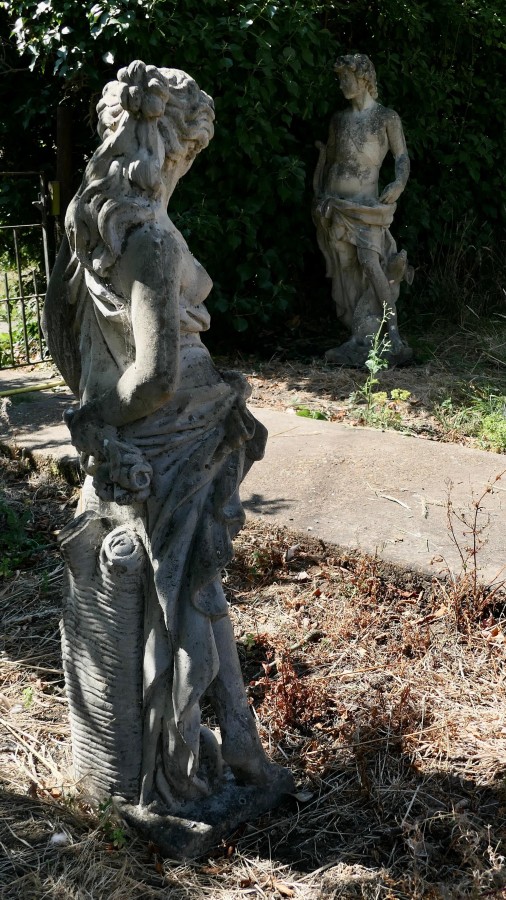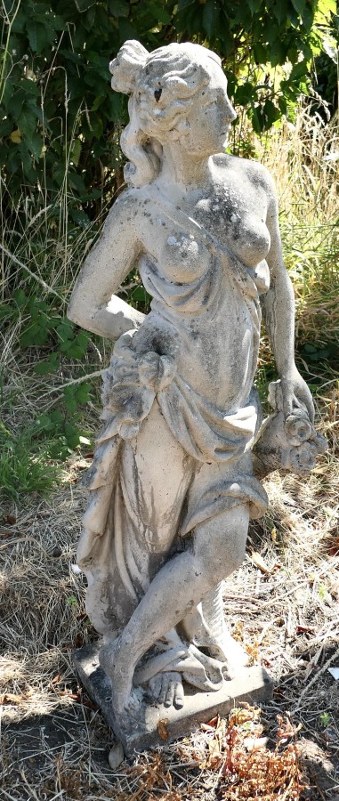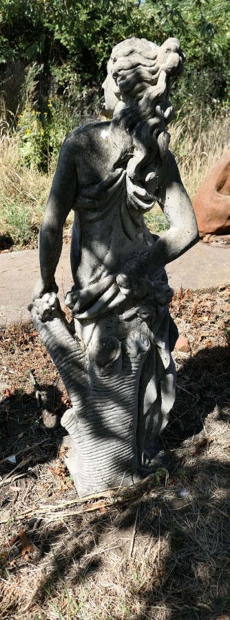 French Cast Stone Statue of Diana A Large reconstituted stone Statue of Diana, Diana is the goddess of the countryside and hunters, she sitting on a tree stump holding flowers. This is a vintage classical statue, it dates from the first half of the 20th century with desirable weathering, historic knocks and good Patination This Charming almost life size piece is needless to say very heavy, and has the power to delight both indoors or out in any entrance hall or garden Diana is 46” tall, she is approximately 17” across and 12” in depth HM129 Manufacture Date : 1950 Materials : Cast-stone