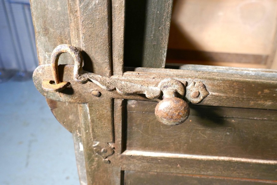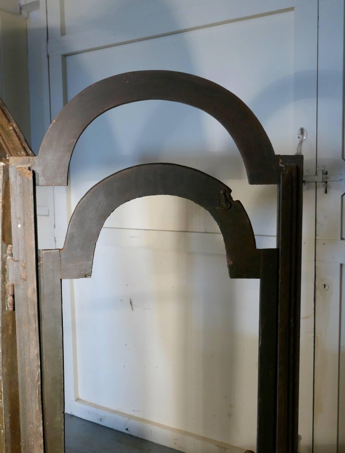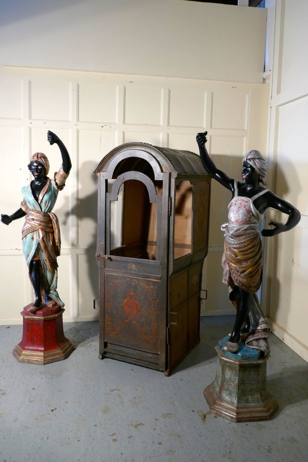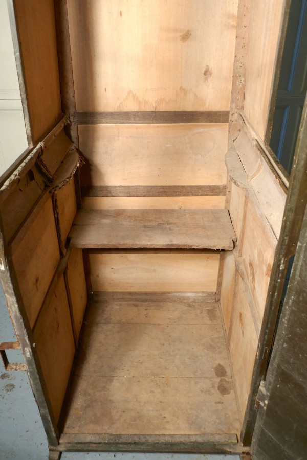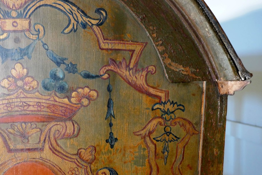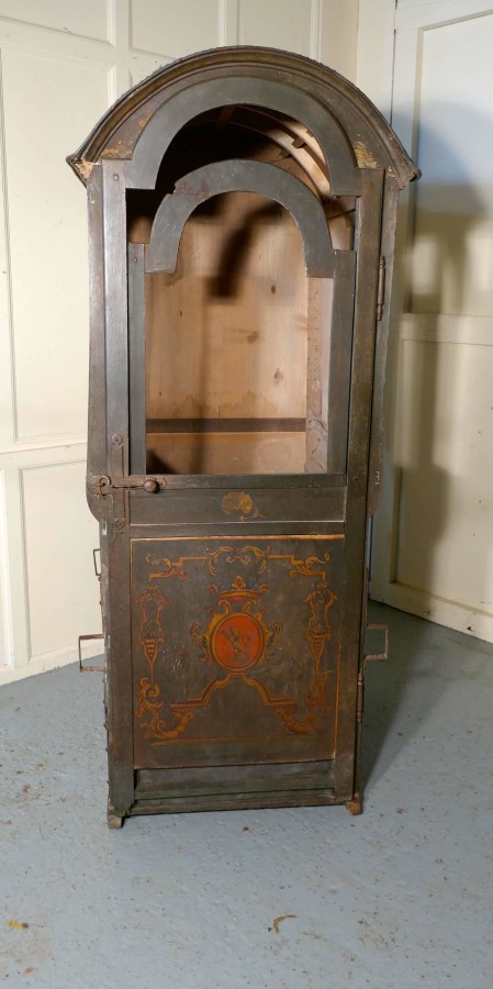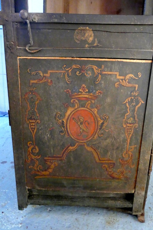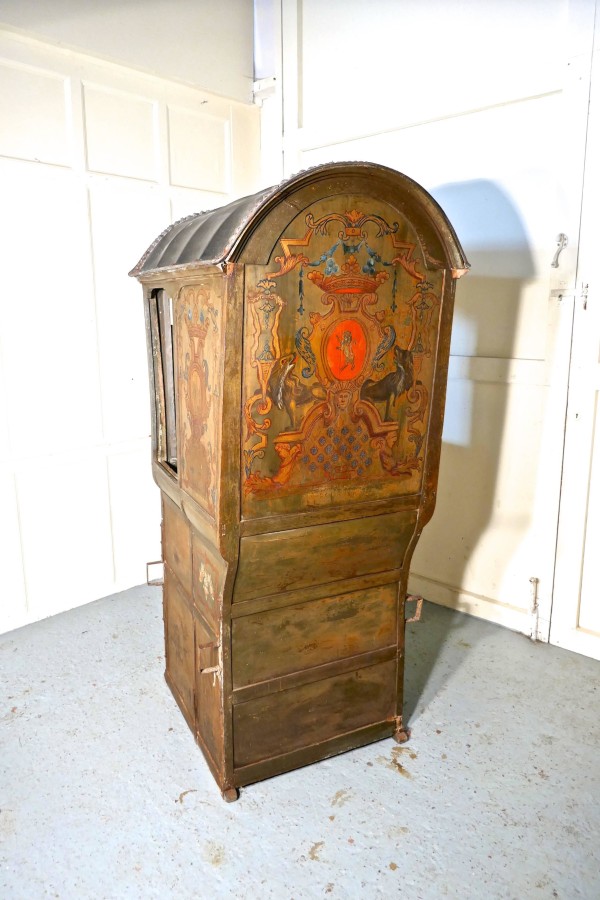 French Château de Chasse, Sedan Chair, Original Unrestored Circa 1740 Very Rare, this piece was discovered neglected in cellar of a Château in the West of France, it was used by the countess allowing her to follow the hunt and be included in all the fun and feasting of the Hunt. The carriage has a green background paint and coats of arms of the family are painted on the chair. The coat of arms has a crown, this shows the rank of the family, it has rampant lion in the centre, a female face below with fierce animals (wolves I think) on either side The chair is still quite a bright and colourful piece, there is a bit of a seat and the door window frame raises and lowers, the chair has some of a calico lining still visible lining the interior and it has a leather studded roof and the door is closed with a Blacksmith made Lock. This piece has been left as found, it has not been tampered with in any way, just gently brushed out to get rid of the dust, a museum piece ready to be restored The chair is 66” tall, 29” wide and 35” deep SH98 Manufacture Date : 1740 Materials : Paint