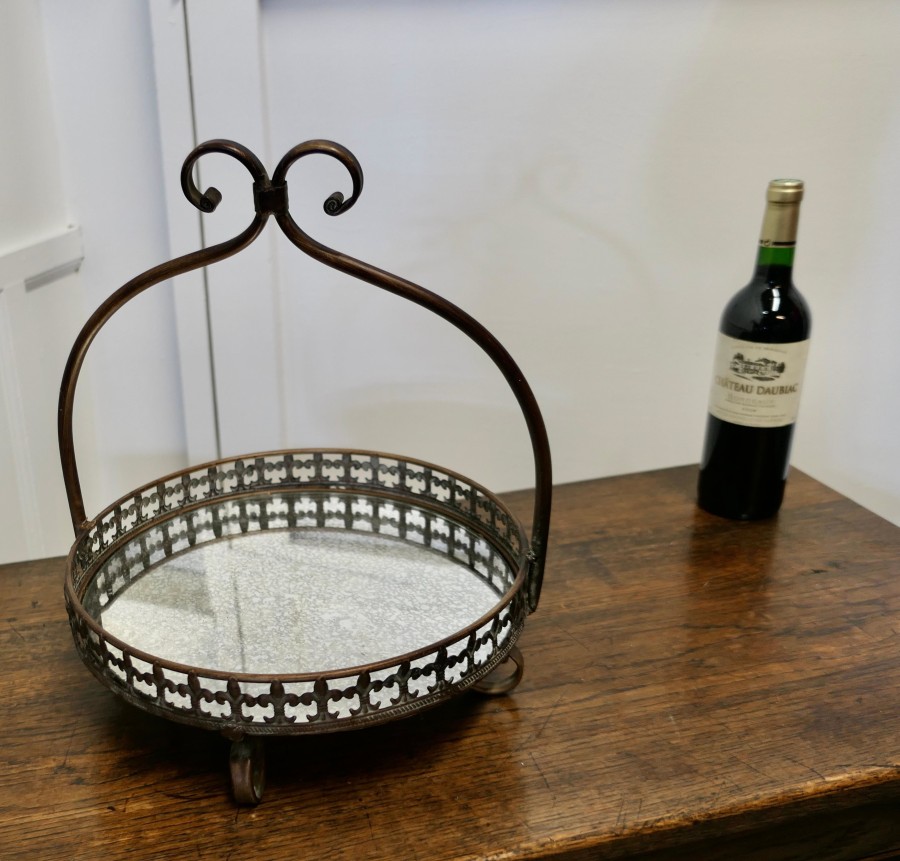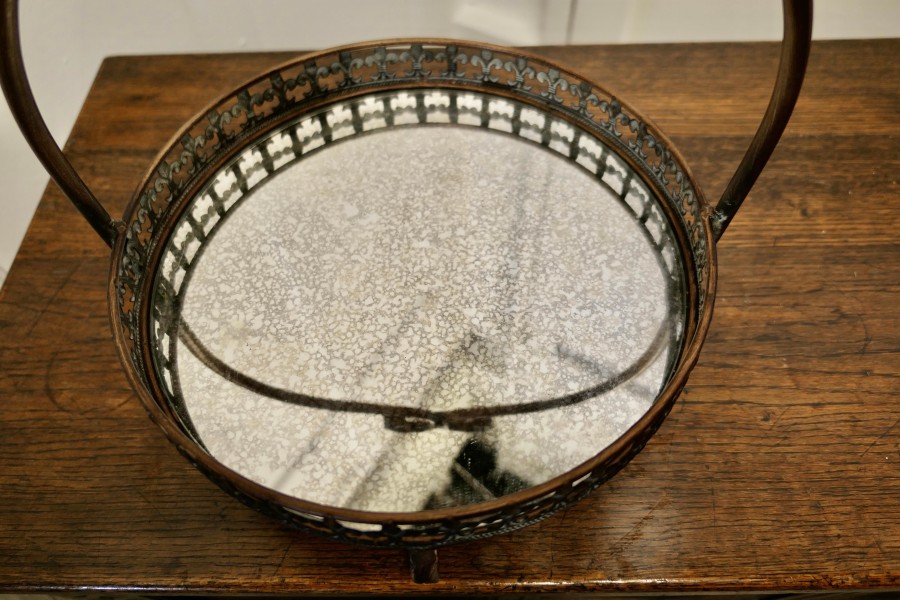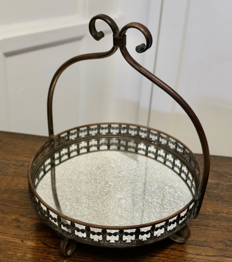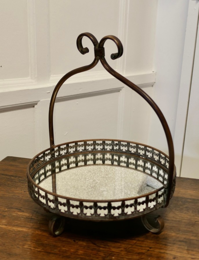 French Copper and Mirrored Bottomed Cake Stand A pretty Cake stand with an arched handle, the stand sits on 4 curled feet which match the twist of the handle The bottom of the stand is made of aged mirror and has a fleur des lys gallery around The stand is in good used condition it is 15” tall and 13” in diameter CC152 Manufacture Date : 1950 Materials : Mirror