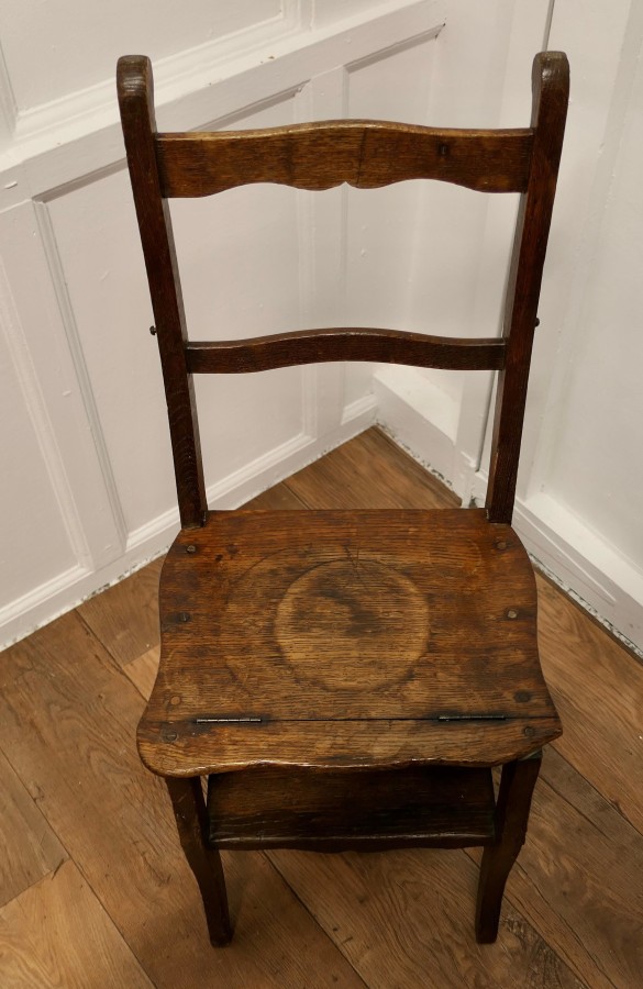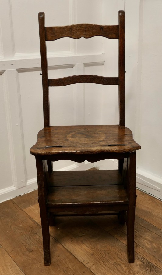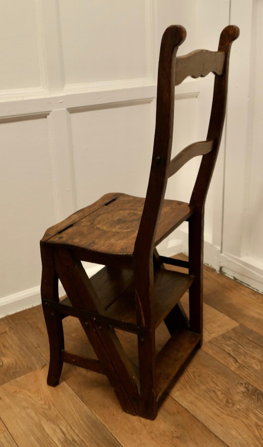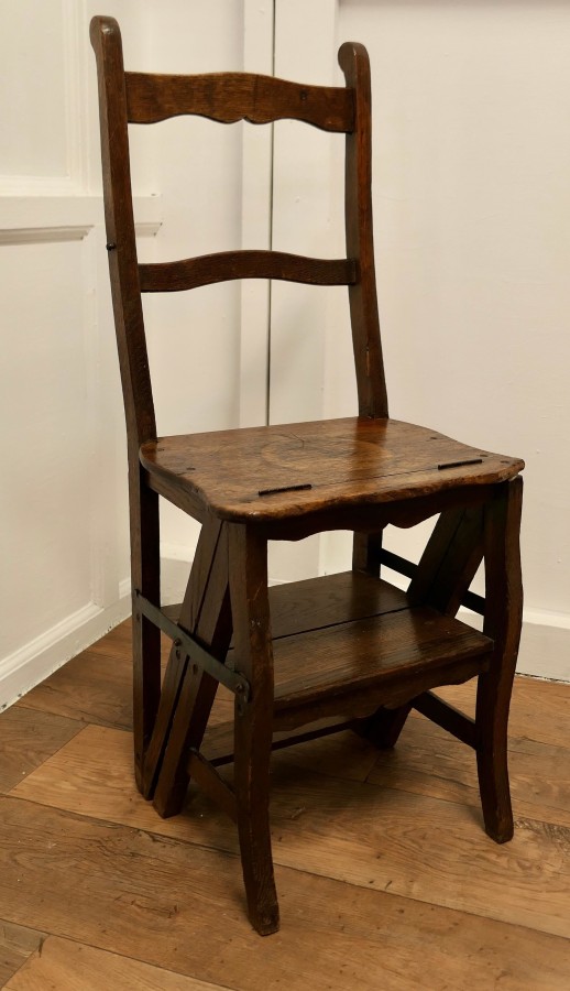French Country Metamorphic Chair and Sturdy Ladder Steps A very useful piece, this handy little chair can be flipped over and turned into a small 4 step ladder, originally this type of chair was used in a shop or library but it would work very well in either a shop or kitchen, anywhere that a little extra height is needed The chair is made in Old Oak with a well used rustic look The Chair is 39” high at the back, 14” wide 22” deep, when it is set up as a ladder MS74 Manufacture Date : 1850 Materials : Oak