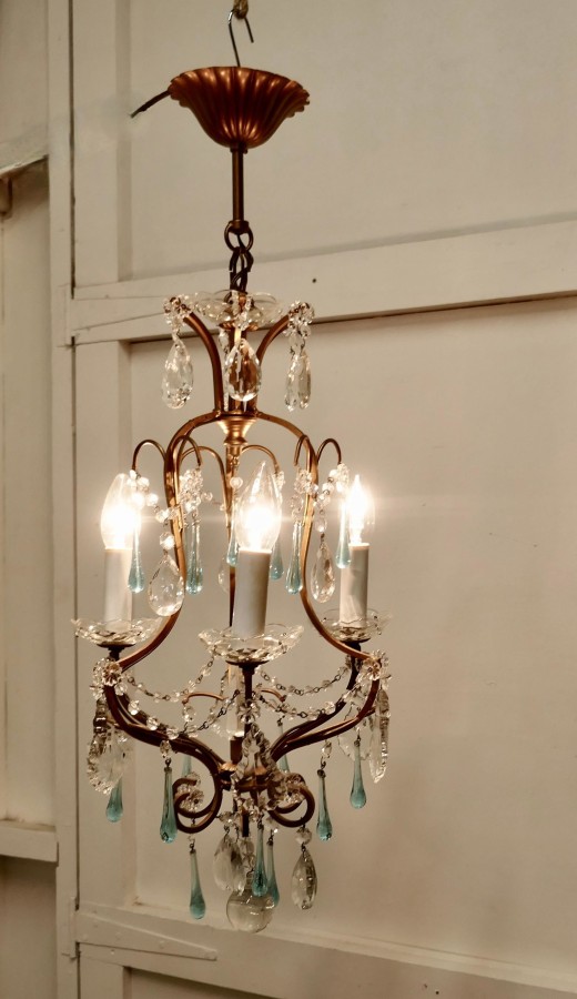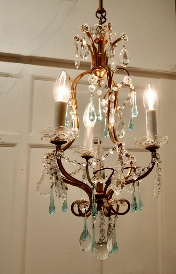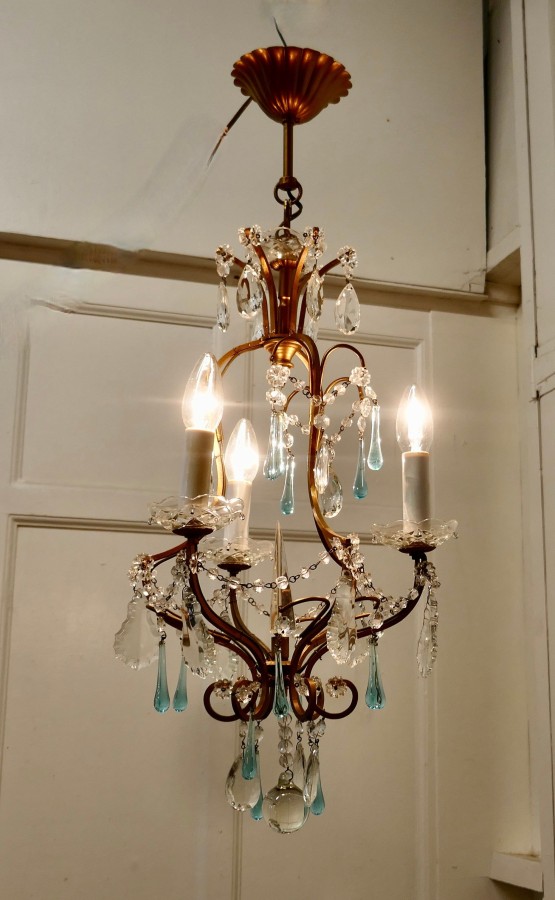French Crystal Chandelier with Chains and Turquoise Drops This is a very pretty and dainty piece, the brass has a gilded finish and 4 branches, the light is hung with beautiful Turquoise tear drops, and cut crystal flowers The light is in good working condition and it will need to be connected to an electrical supply The chandelier is 12” in diameter and 25” high MS207 Manufacture Date : 1920 Materials : Crystal