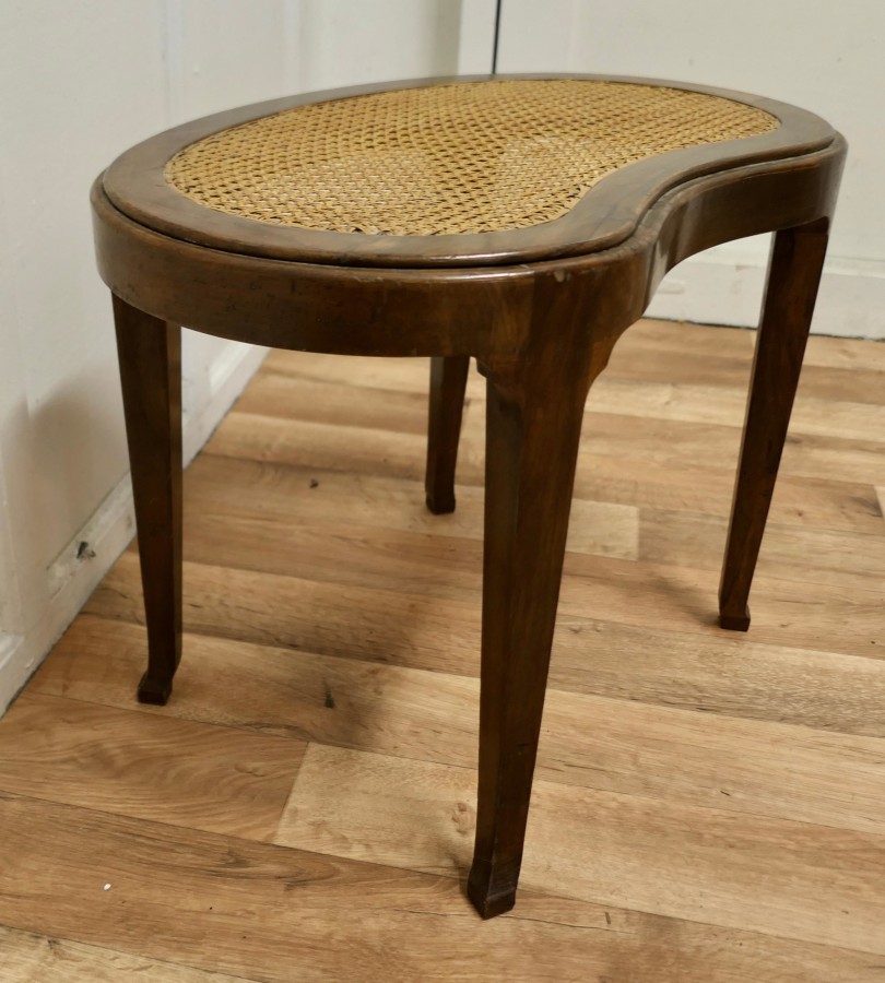 French Empire style Bergère kidney shaped stool. This is a charming French empire style walnut stool, the stool has a charming golden colour and a very attractive shape, the seat is made with flat cane often known a bergère This is a dainty good quality stool and in good condition. The stool is 17” high, and it is 24” wide and 14” deep overall. HM203 Manufacture Date : 1900 Materials : Walnut