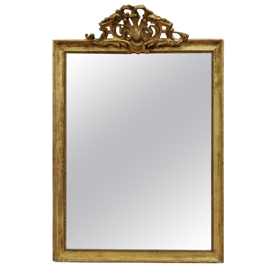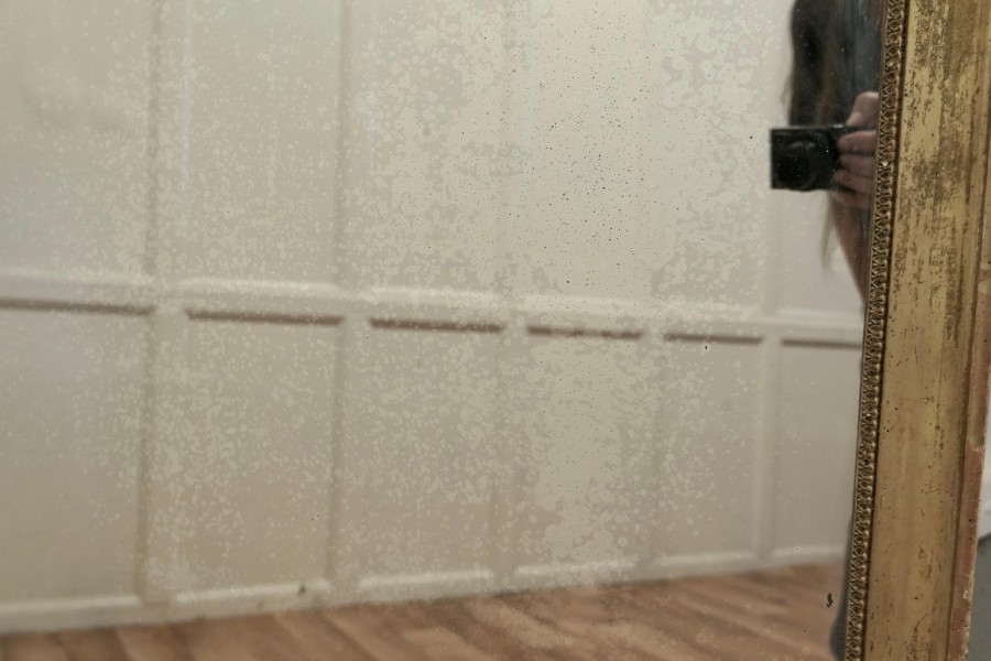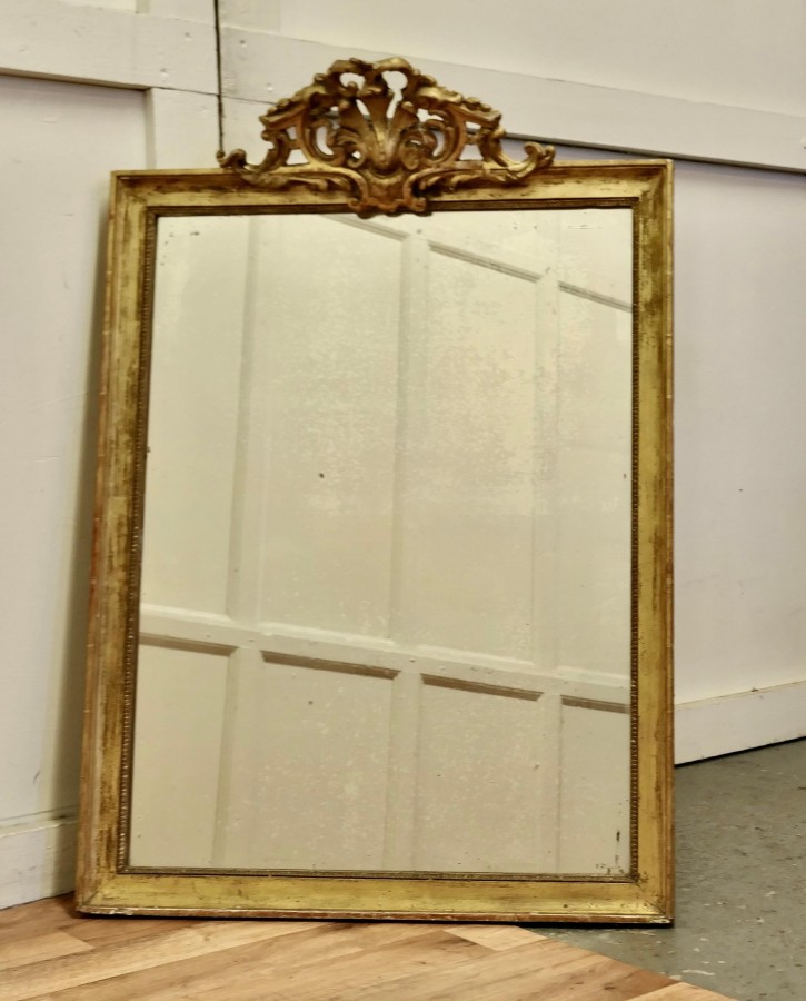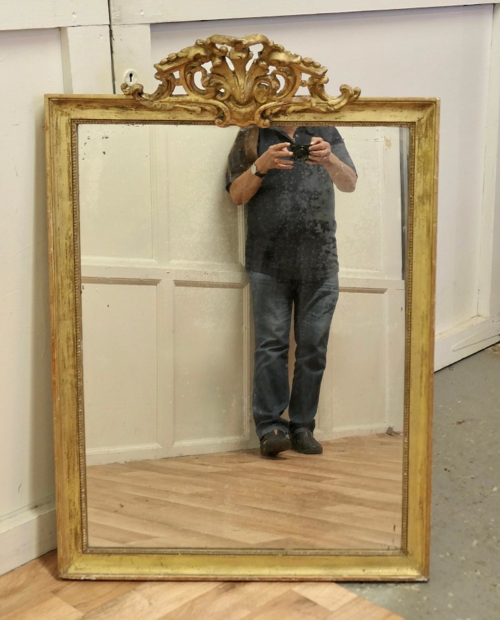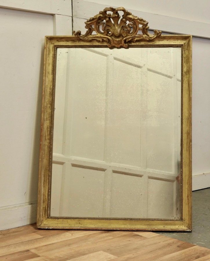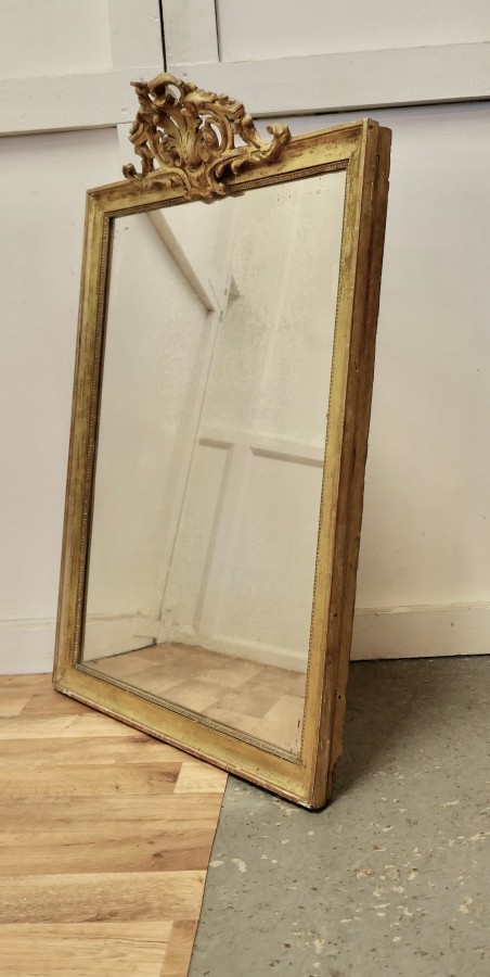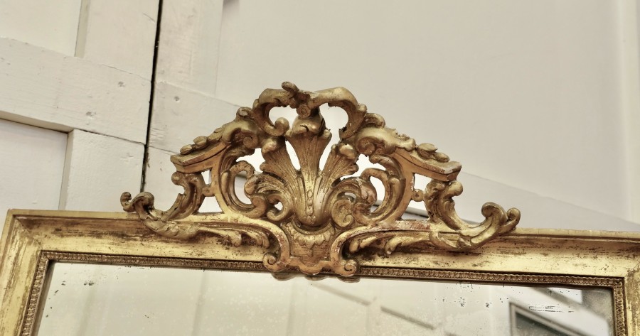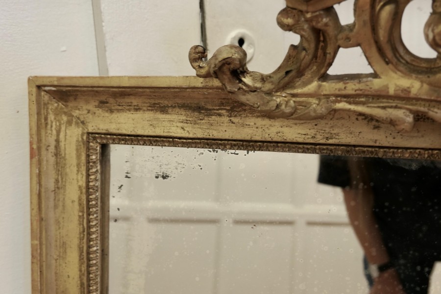 French faded pale gilt Pier mirror The mirror has a very elaborate large pierced top decoration which hangs over the slightly shabby pale faded gilt frame, it is in good condition The mercury glass as a slightly mottled foxing all over and there are a few darkened patches near the frame edge, a lovely piece with a fantastic look The mirror stands 42” high, 29” wide and 9” deep HM46. Manufacture Date : 1880 Materials : Giltwood
